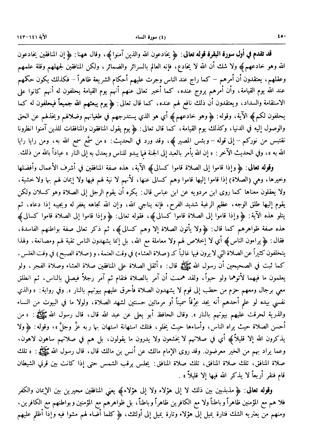 وقوله تعالى: {إذا قاموا إِلَى الصلاة قَامُواْ كسالى} الآية، هَذِهِ صِفَةُ الْمُنَافِقِينَ فِي أَشْرَفِ الْأَعْمَالِ وَأَفْضَلِهَا وَخَيْرِهَا، وَهِيَ (الصَّلَاةُ) إِذَا قَامُوا إِلَيْهَا قَامُوا وَهُمْ كُسَالَى عَنْهَا، لِأَنَّهُمْ لَا نِيَّةَ لَهُمْ فِيهَا وَلَا إِيمَانَ لَهُمْ بِهَا وَلَا خَشْيَةَ، وَلَا يَعْقِلُونَ مَعْنَاهَا كَمَا رَوَى ابْنُ مَرْدَوَيْهِ عَنِ ابْنِ عَبَّاسٍ قَالَ: يُكْرَهُ أَنْ يَقُومَ الرَّجُلُ إِلَى الصَّلَاةِ وَهُوَ كَسْلَانُ وَلَكِنْ يَقُومُ إِلَيْهَا طَلْقَ الْوَجْهِ، عَظِيمَ الرَّغْبَةِ شَدِيدَ الْفَرَحِ، فإنه يناجي الله، وإن الله تجاهه يَغْفِرُ لَهُ وَيُجِيبُهُ إِذَا دَعَاهُ، ثُمَّ يَتْلُو هَذِهِ الْآيَةَ: {وَإِذَا قَامُوا إِلَى الصَّلَاةِ قَامُواْ كسالى}، فَقَوْلُهُ تَعَالَى: {وَإِذَا قَامُوا إِلَى الصَّلَاةِ قَامُواْ كُسَالَى} هَذِهِ صِفَةُ ظَوَاهِرِهِمْ كَمَا قَالَ: {وَلاَ يَأْتُونَ الصلاة إِلاَّ وَهُمْ كسالى}، ثُمَّ ذَكَرَ تَعَالَى صِفَةَ بَوَاطِنِهِمُ الْفَاسِدَةِ، فَقَالَ: {يُرَآءُونَ النَّاسَ} أَيْ لَا إِخْلَاصَ لَهُمْ وَلَا مُعَامَلَةَ مَّعَ الله، بَلْ إنما يشهدون الناس تقيَّة لهم ومصانعة، وَلِهَذَا يَتَخَلَّفُونَ كَثِيرًا عَنِ الصَّلَاةِ الَّتِي لاَ يَرَوْنَ فِيهَا غالباً ك (صلاة العشاء) في وَقْتَ الْعَتَمَةِ وَصَلَاةِ الصُّبْحِ فِي وَقْتِ الْغَلَسِ. كَمَا ثَبَتَ فِي الصَّحِيحَيْنِ أَنَّ رَسُولَ اللَّهِ صَلَّى اللَّهُ عَلَيْهِ وَسَلَّمَ قَالَ: «أَثْقَلُ الصَّلَاةِ عَلَى الْمُنَافِقِينَ صَلَاةُ الْعِشَاءِ وَصَلَاةُ الْفَجْرِ، وَلَوْ يَعْلَمُونَ مَا فِيهِمَا لَأَتَوْهُمَا وَلَوْ حَبْوًا، وَلَقَدْ هَمَمْتُ أَنَّ آمُرَ بِالصَّلَاةِ فَتُقَامَ ثُمَّ آمُرَ رَجُلًا فَيُصَلِّيَ بِالنَّاسِ، ثُمَّ أَنْطَلِقَ مَعِي بِرِجَالٍ ومعهم حُزَمٌ مِنْ حَطَبٍ إِلَى قَوْمٍ لَا يَشْهَدُونَ الصَّلَاةَ فَأُحَرِّقَ عَلَيْهِمْ بُيُوتَهُمْ بِالنَّارِ» وَفِي رِوَايَةٍ: «وَالَّذِي نَفْسِي بِيَدِهِ لَوْ عَلِمَ أَحَدُهُمْ أَنَّهُ يَجِدُ عِرْقاً سَمِينًا أَوْ مَرْمَاتَيْنِ حَسَنَتَيْنِ لَشَهِدَ الصَّلَاةَ، وَلَوْلَا مَا فِي الْبُيُوتِ مِنَ النِّسَاءِ والذرية لحرقت عليهم بوتهم بالنار» وقال الحافظ أبو يعلى عَنْ عَبْدِ اللَّهِ قَالَ، قَالَ رَسُولُ اللَّهِ صَلَّى اللَّهُ عَلَيْهِ وَسَلَّمَ: «مَنْ أَحْسَنَ الصَّلَاةَ حَيْثُ يَرَاهُ النَّاسُ، وَأَسَاءَهَا حَيْثُ يَخْلُو، فَتِلْكَ اسْتِهَانَةٌ اسْتَهَانَ بِهَا رَبَّهُ عزَّ وجلَّ»؛ وَقَوْلُهُ: {وَلاَ يَذْكُرُونَ اللَّهَ إِلاَّ قَلِيلاً} أَيْ فِي صلاتهم لا يخشعون وَلَا يَدْرُونَ مَا يَقُولُونَ، بَلْ هُمْ فِي صَلَاتِهِمْ سَاهُونَ لَاهُونَ، وَعَمَّا يُرَادُ بِهِمْ مِنَ الْخَيْرِ مُعَرِضُونَ. وَقَدْ رَوَى الْإِمَامُ مَالِكٌ عَنِ أنس بن مالك عَنْ أَنَسِ بْنِ مَالِكٍ قَالَ، قَالَ رَسُولُ اللَّهِ صَلَّى اللَّهُ عَلَيْهِ وَسَلَّمَ: "تلكَ صَلَاةُ الْمُنَافِقِ، تِلْكَ صَلَاةُ الْمُنَافِقِ، تِلْكَ صَلَاةُ الْمُنَافِقِ: يَجْلِسُ يَرْقُبُ الشَّمْسَ حَتَّى إِذَا كَانَتْ بَيْنَ قَرْنَيِ الشَّيْطَانِ قَامَ فَنَقَرَ أَرْبَعًا لَا يَذْكُرُ الله فيها إلا قليلاً".