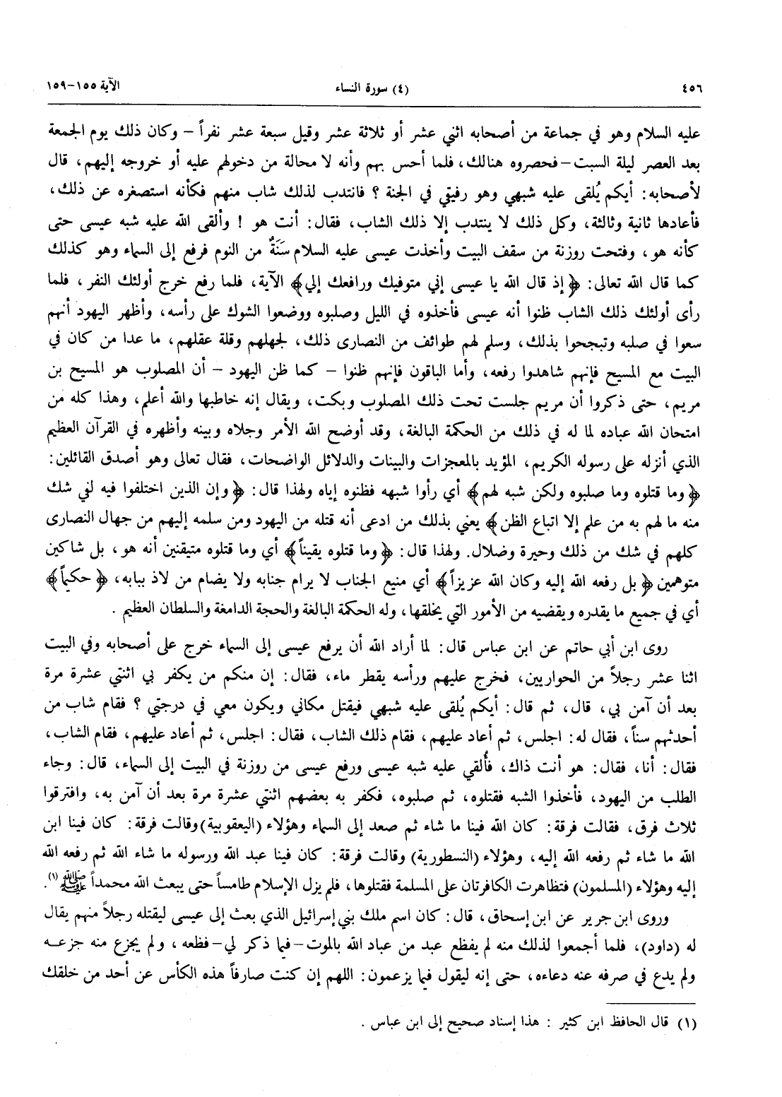 عَلَيْهِ السَّلَامُ وَهُوَ فِي جَمَاعَةٍ مِنْ أَصْحَابِهِ اثني عَشَرَ أَوْ ثَلَاثَةَ عَشَرَ وَقِيلَ سَبْعَةَ عَشَرَ نَفَرًا - وَكَانَ ذَلِكَ يَوْمَ الْجُمُعَةِ بَعْدَ الْعَصْرِ لَيْلَةَ السَّبْتِ - فَحَصَرُوهُ هُنَالِكَ، فَلَمَّا أَحَسَّ بِهِمْ وأنه لامحالة من دخولهم عليه أو خروجه إليهم - قَالَ لِأَصْحَابِهِ: أَيُّكُمْ يُلقى عَلَيْهِ شَبَهِي وَهُوَ رَفِيقِي فِي الْجَنَّةِ؟ فَانْتَدَبَ لِذَلِكَ شَابٌّ مِنْهُمْ فَكَأَنَّهُ اسْتَصْغَرَهُ عَنْ ذَلِكَ، فَأَعَادَهَا ثَانِيَةً وَثَالِثَةً، وَكُلُّ ذَلِكَ لَا يَنْتَدِبُ إِلَّا ذَلِكَ الشَّابُّ، فَقَالَ: أَنْتَ هُوَ! وَأَلْقَى اللَّهُ عَلَيْهِ شَبَهَ عِيسَى حَتَّى كَأَنَّهُ هُوَ، وَفُتِحَتْ رَوْزَنَةٌ مِنْ سَقْفِ الْبَيْتِ وَأَخَذَتْ عِيسَى عَلَيْهِ السَّلَامُ سَنَةً مِنَ النَّوْمِ فَرُفِعَ إِلَى السَّمَاءِ وَهُوَ كَذَلِكَ كَمَا قَالَ اللَّهُ تَعَالَى: {إِذْ قَالَ اللَّهُ يا عيسى إِنِّي مُتَوَفِّيكَ وَرَافِعُكَ إلي} الآية، فَلَمَّا رُفِعَ خَرَجَ أُولَئِكَ النَّفَرُ، فَلَمَّا رَأَى أُولَئِكَ ذَلِكَ الشَّابَ ظَنُّوا أَنَّهُ عِيسَى فَأَخَذُوهُ فِي اللَّيْلِ وَصَلَبُوهُ وَوَضَعُوا الشَّوْكَ عَلَى رَأْسِهِ، وأظهر الْيَهُودُ أَنَّهُمْ سَعَوْا فِي صَلْبِهِ وَتَبَجَّحُوا بِذَلِكَ، وَسَلَّمَ لَهُمْ طَوَائِفُ مِنَ النَّصَارَى ذَلِكَ، لِجَهْلِهِمْ وَقِلَّةِ عَقْلِهِمْ، مَا عَدَا مَنْ كَانَ فِي الْبَيْتِ مَعَ الْمَسِيحِ فَإِنَّهُمْ شَاهَدُوا رَفْعَهُ، وَأَمَّا الْبَاقُونَ فَإِنَّهُمْ ظَنُّوا - كَمَا ظَنَّ الْيَهُودُ - أَنَّ المصلوب هو المسيح بن مَرْيَمَ، حَتَّى ذَكَرُوا أَنَّ مَرْيَمَ جَلَسَتْ تَحْتَ ذَلِكَ الْمَصْلُوبِ وَبَكَتْ، وَيُقَالُ إِنَّهُ خَاطَبَهَا وَاللَّهُ أَعْلَمُ، وَهَذَا كُلُّهُ مِنِ امْتِحَانِ اللَّهِ عِبَادَهُ لِمَا لَهُ فِي ذَلِكَ مِنَ الْحِكْمَةِ الْبَالِغَةِ، وَقَدْ أَوْضَحَ اللَّهُ الْأَمْرَ وَجَلَّاهُ وَبَيَّنَهُ وَأَظْهَرَهُ فِي الْقُرْآنِ الْعَظِيمِ الَّذِي أَنْزَلَهُ عَلَى رَسُولِهِ الكريم، المؤيد المعجزات وَالْبَيِّنَاتِ وَالدَّلَائِلِ الْوَاضِحَاتِ، فَقَالَ تَعَالَى وَهُوَ أَصْدَقُ القائلين: {وَمَا قَتَلُوهُ وَمَا صَلَبُوهُ وَلَكِنْ شُبِّهَ لَهُمْ} أي رأوا شهبه فَظَنُّوهُ إِيَّاهُ وَلِهَذَا قَالَ: {وَإِنَّ الَّذِينَ اخْتَلَفُوا فِيهِ لَفِي شَكٍّ مِّنْهُ مَا لَهُمْ بِهِ مِنْ عِلْمٍ إِلاَّ اتباع الظن} يعني ذلك من ادعى أنه قتله من اليهود ومن سلمه إليهم مِنْ جُهَّالِ النَّصَارَى كُلُّهُمْ فِي شَكٍّ مِّنَ ذلك وحيرة وضلال. وَلِهَذَا قَالَ: {وَمَا قَتَلُوهُ يَقِيناً} أَيْ وَمَا قَتَلُوهُ مُتَيَقِّنِينَ أَنَّهُ هُوَ، بَلْ شَاكِّينَ مُتَوَهِّمِينَ {بَل رَّفَعَهُ اللَّهُ إِلَيْهِ وَكَانَ اللَّهُ عَزِيزاً} أَيْ مَنِيعَ الْجَنَابِ لَا يُرَامُ جَنَابُهُ وَلَا يُضَامُ مَنْ لَاذَ بِبَابِهِ، {حَكِيماً} أَيْ فِي جَمِيعِ مَا يُقَدِّرُهُ وَيَقْضِيهِ مِنَ الْأُمُورِ الَّتِي يخلقها، وله الحكمة البالغة الحجة الدامغة والسلطان العظيم.