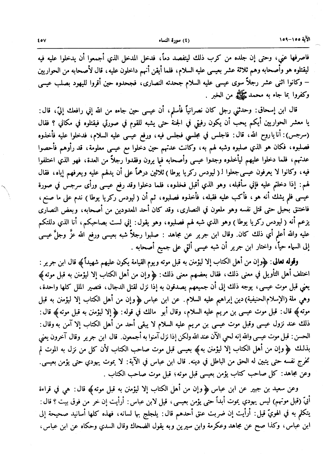 وَقَوْلُهُ تَعَالَى: {وَإِن مِنْ أَهْلِ الْكِتَابِ إِلاَّ لَيُؤْمِنَنَّ بِهِ قَبْلَ مَوْتِهِ وَيَوْمَ الْقِيَامَةِ يَكُونُ عَلَيْهِمْ شَهِيداً} قَالَ ابْنُ جَرِيرٍ: اخْتَلَفَ أَهْلُ التَّأْوِيلِ فِي مَعْنَى ذَلِكَ، فَقَالَ بَعْضُهُمْ مَعْنَى ذَلِكَ: {وَإِنَّ مِنْ أَهْلِ الْكِتَابِ إِلاَّ لَيُؤْمِنَنَّ بِهِ قَبْلَ مَوْتِهِ} يَعْنِي قَبْلَ مَوْتِ عِيسَى، يُوَجِّهُ ذَلِكَ إِلَى أَنَّ جَمِيعَهُمْ يُصَدِّقُونَ بِهِ إِذَا نَزَلَ لِقَتْلِ الدَّجَّالِ، فَتَصِيرُ الْمِلَلُ كُلُّهَا وَاحِدَةً، وَهِيَ مِلَّةُ (الْإِسْلَامِ الْحَنِيفِيَّةُ) دِينُ إِبْرَاهِيمَ عَلَيْهِ السَّلَامُ. عن ابن عباس {وَإِنَّ مِنْ أَهْلِ الْكِتَابِ إِلاَّ لَيُؤْمِنَنَّ بِهِ قَبْلَ مَوْتِهِ} قَالَ: قَبْلَ موت عيسى بن مريم عليه السلام، وَقَالَ أَبُو مَالِكٍ فِي قَوْلِهِ: {إِلاَّ لَيُؤْمِنَنَّ بِهِ قَبْلَ مَوْتِهِ} قَالَ: ذَلِكَ عِنْدَ نُزُولِ عيسى وقبل موت عيسى بن مَرْيَمَ عَلَيْهِ السَّلَامُ لَا يَبْقَى أَحَدٌ مِنْ أهل الكتاب إلا آمن به وقال: الحسن: قبل موت عيسى والله إنه لحي الآن عِنْدَ اللَّهِ وَلَكِنْ إِذَا نَزَلَ آمَنُوا بِهِ أجمعون. قال ابن جرير وقال آخرون يعني بذلك {وَإِنَّ مِنْ أَهْلِ الْكِتَابِ إِلاَّ لَيُؤْمِنَنَّ بِهِ} بعيسى قبل موت صاحب الكتاب لِأَنَّ كُلَّ مَنْ نَزَلَ بِهِ الْمَوْتُ لَمْ تَخْرُجْ نَفْسُهُ حَتَّى يَتَبَيَّنَ لَهُ الْحَقُّ مِنَ الباطل في دينه. قال ابن عباس في الآية: لا يموت يهودي حتى يؤمن بعيسى وعن مجاهد: كُلُّ صَاحِبِ كِتَابٍ يُؤْمِنُ بِعِيسَى قَبْلَ مَوْتِهِ؛ قبل موت صاحب الكتاب.