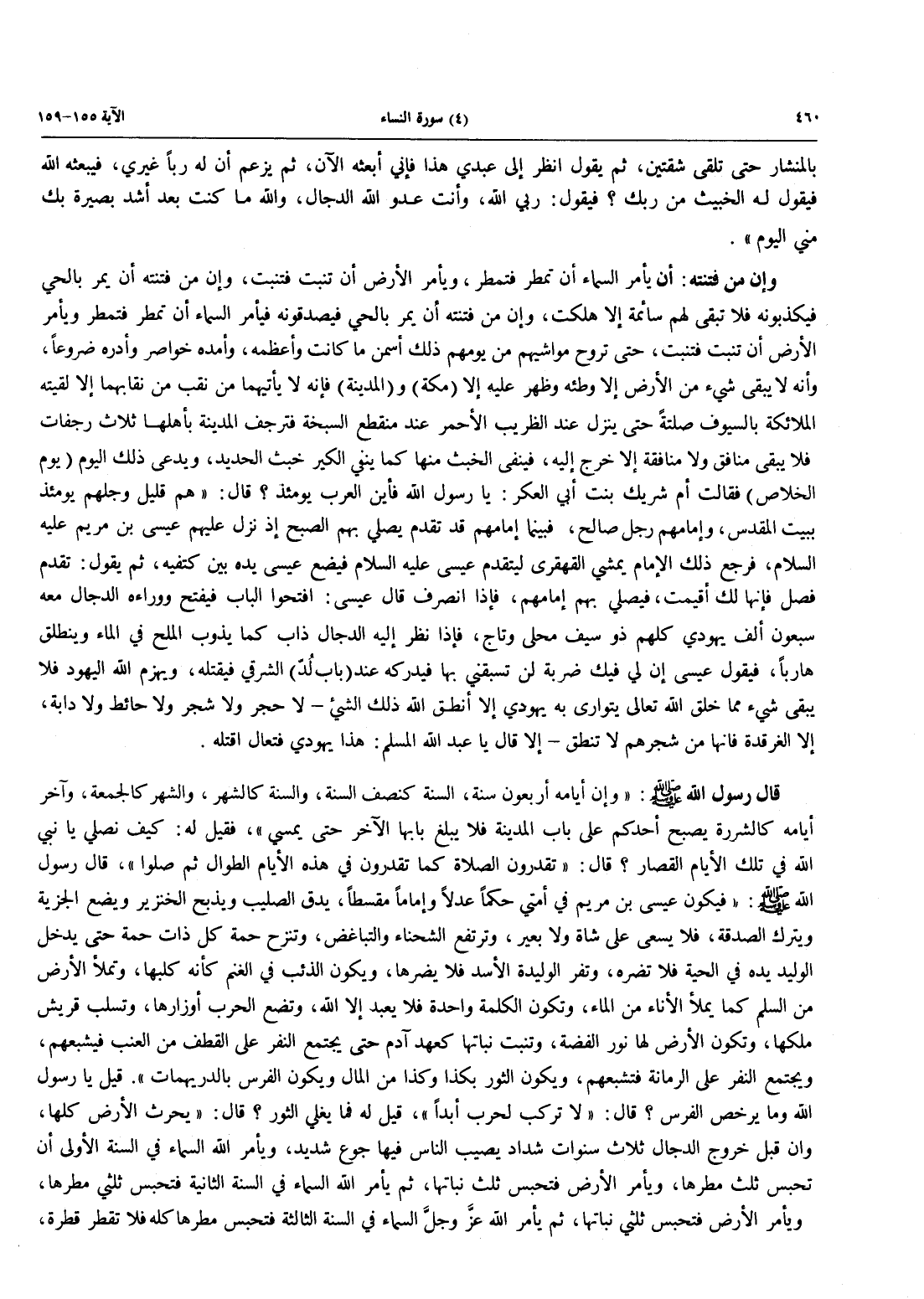 قَالَ رَسُولُ اللَّهِ صَلَّى اللَّهُ عَلَيْهِ وَسَلَّمَ: «وَإِنَّ أَيَّامَهُ أَرْبَعُونَ سَنَةً، السَّنَةُ كَنِصْفِ السَّنَةِ، وَالسَّنَةُ كَالشَّهْرِ، وَالشَّهْرُ كَالْجُمُعَةِ، وَآخِرُ أَيَّامِهِ كَالشَّرَرَةِ يُصْبِحُ أَحَدُكُمْ عَلَى بَابِ الْمَدِينَةِ فَلَا يَبْلُغُ بَابَهَا الْآخَرَ حَتَّى يُمْسِيَ»، فَقِيلَ لَهُ: كيف نصلي يا نبي الله في تلك الأيام القصار؟ قال: «تقدرون الصَّلَاةَ كَمَا تُقَدِّرُونَ فِي هَذِهِ الْأَيَّامِ الطِّوَالِ ثُمَّ صَلُّوا»، قَالَ رَسُولُ اللَّهِ صَلَّى اللَّهُ عَلَيْهِ وَسَلَّمَ: «فيكون عيسى بن مَرْيَمَ فِي أُمَّتِي حَكَمًا عَدْلًا وَإِمَامًا مُقْسِطًا، يدق الصليب ويذبح الْخِنْزِيرَ وَيَضَعُ الْجِزْيَةَ وَيَتْرُكُ الصَّدَقَةَ، فَلَا يُسْعَى عَلَى شَاةٍ وَلَا بَعِيرٍ، وَتَرْتَفِعُ الشَّحْنَاءُ وَالتَّبَاغُضُ، وتنزح حُمَةُ كُلِّ ذَاتِ حُمَةٍ حَتَّى يُدْخِلَ الْوَلِيدُ يَدَهُ فِي الْحَيَّةِ فَلَا تَضُرَّهُ، وَتُفِرُّ الْوَلِيدَةُ الْأَسَدَ فَلَا يَضُرَّهَا، وَيَكُونُ الذِّئْبُ فِي الْغَنَمِ كَأَنَّهُ كَلْبُهَا، وَتُمْلَأُ الْأَرْضُ مِنَ السِّلْمِ كَمَا يُمْلَأُ الْإِنَاءُ مِنَ الْمَاءِ، وَتَكُونُ الْكَلِمَةُ وَاحِدَةً فَلَا يُعْبَدُ إِلَّا اللَّهُ، وَتَضَعُ الْحَرْبُ أَوْزَارَهَا، وتسلب قريش ملكها، وتكون الأرض لها نور الفضة، وتنبت نَبَاتَهَا كَعَهْدِ آدَمَ حَتَّى يَجْتَمِعَ النَّفَرُ عَلَى الْقِطْفِ مِنَ الْعِنَبِ فَيُشْبِعَهُمْ، وَيَجْتَمِعَ النَّفَرُ عَلَى الرُّمَّانَةِ فَتُشْبِعَهُمْ، وَيَكُونُ الثَّوْرُ بِكَذَا وَكَذَا مِنَ الْمَالِ وَيَكُونُ الْفَرَسُ بِالدُّرَيْهِمَاتِ» قِيلَ يَا رَسُولَ الله ومايرخص الْفَرَسَ؟ قَالَ: «لَا تُرْكَبُ لِحَرْبٍ أَبَدًا»، قِيلَ له فما يغلي الثور؟ قال: «يحرث الْأَرْضُ كُلُّهَا، وَإِنَّ قَبْلَ خُرُوجِ الدَّجَّالِ ثَلَاثَ سَنَوَاتٍ شِدَادٍ يُصِيبُ النَّاسَ فِيهَا جُوعٌ شَدِيدٌ، ويأمر اللَّهُ السَّمَاءَ فِي السَّنَةِ الْأُولَى أَنْ تَحْبِسَ ثُلُثَ مَطَرِهَا، وَيَأْمُرُ الْأَرْضَ فَتَحْبِسُ ثُلُثَ نَبَاتِهَا، ثم يأمر الله السماء في السنة الثَّانِيَةِ فَتَحْبِسُ ثُلُثَيْ مَطَرِهَا، وَيَأْمُرُ الْأَرْضَ فَتَحْبِسُ ثلثي نباتها، ثم يأمر الله عزَّ وجلَّ السَّمَاءَ فِي السَّنَةِ الثَّالِثَةِ فَتَحْبِسُ مَطَرَهَا كُلَّهُ فَلَا تَقْطُرُ قَطْرَةً،