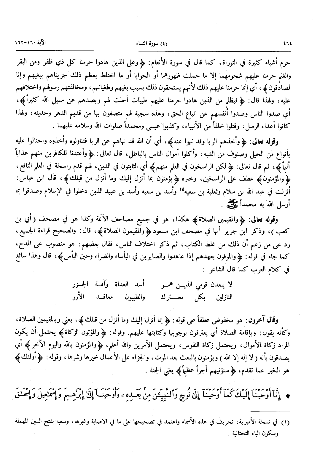 وقوله تعالى: {وَأَخْذِهِمُ الرِّبَا وَقَدْ نُهُواْ عَنْهُ}، {أَيْ أَنَّ اللَّهَ قَدْ نَهَاهُمْ عَنِ الرِّبَا فَتَنَاوَلُوهُ وَأَخَذُوهُ وَاحْتَالُوا عَلَيْهِ بِأَنْوَاعٍ مِنَ الْحِيَلِ وَصُنُوفٍ مِنَ الشُّبَهِ، وَأَكَلُوا أَمْوَالَ النَّاسِ بِالْبَاطِلِ، قَالَ تَعَالَى: {وَأَعْتَدْنَا لِلْكَافِرِينَ مِنْهُمْ عَذَاباً أَلِيماً} ثُمَّ قَالَ تَعَالَى: {لَكِنِ الرَّاسِخُونَ فِي الْعِلْمِ مِنْهُمْ} أَيِ الثَّابِتُونَ فِي الدِّينِ، لَهُمْ قَدَمٌ رَاسِخَةٌ فِي العلم النافع، {والمؤمنون} عطف على الرسخين، وَخَبَرُهُ {يُؤْمِنُونَ بِمَآ أَنزَلَ إِلَيْكَ وَمَا أُنْزِلَ مِن قَبْلِكَ} قَالَ ابْنُ عَبَّاسٍ: أُنْزِلَتْ فِي عَبْدِ اللَّهِ بْنِ سَلَامٍ وَثَعْلَبَةَ بْنِ سَعْيَةَ (في نسخة الأميرية: تحريف في هذه الأسماء واعتمد في تصحيحها على ما في الإصابة وغيرها، وسعيه بفتح السين المهملة وسكون الياء التحتانية) وأسد بْنِ سَعْيَةَ وَأَسَدِ بْنِ عُبَيْدٍ الَّذِينَ دَخَلُوا في الإسلام صدقوا بِمَا أَرْسَلَ اللَّهُ بِهِ مُحَمَّدًا صَلَّى اللَّهُ عَلَيْهِ وَسَلَّمَ.