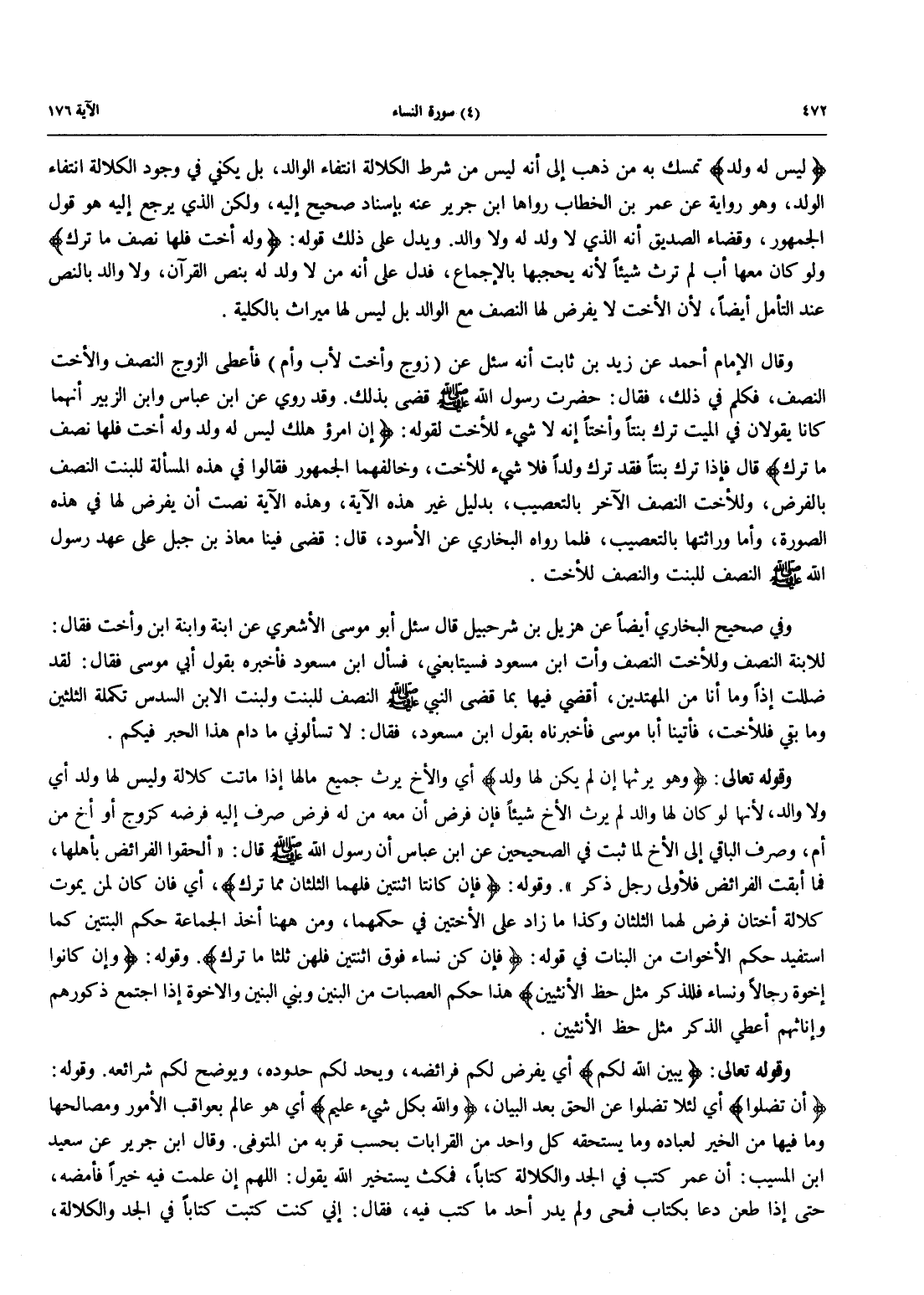 وَقَوْلُهُ تعالى: {يُبَيِّنُ اللَّهُ لَكُمُ} أَيْ يَفْرِضُ لَكُمْ فَرَائِضَهُ، وَيَحُدُّ لَكُمْ حُدُودَهُ، وَيُوَضِّحُ لَكُمْ شَرَائِعَهُ. وَقَوْلُهُ: {أَن تَضِلُّواْ} أَيْ لِئَلَّا تَضِلُّوا عَنِ الْحَقِّ بَعْدَ الْبَيَانِ، {وَاللَّهُ بِكُلِّ شَيْءٍ عَلِيمٌ} أَيْ هُوَ عَالِمٌ بِعَوَاقِبِ الْأُمُورِ وَمَصَالِحِهَا وَمَا فِيهَا من الخير لعباده وما يستحقه كل واد من القرابات بحسب قربه من المتوفى. وقال ابن جرير عن سعيد ابن الْمُسَيَّبِ: أَنَّ عُمَرَ كَتَبَ فِي الْجَدِّ وَالْكَلَالَةِ كتاباً فمكث يستخير الله يَقُولُ: اللَّهُمَّ إِنْ عَلِمْتَ فِيهِ خَيْرًا فَأَمْضِهِ، حَتَّى إِذَا طَعِنَ دَعَا بِكِتَابٍ فَمُحِيَ وَلَمْ يَدْرِ أَحَدٌ مَا كَتَبَ فِيهِ، فَقَالَ: إِنِّي كتبت كتاباً في الجد والكلالة،