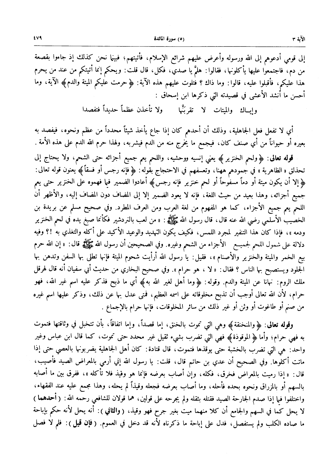 أَيْ لا تفعل فعل الْجَاهِلِيَّةُ، وَذَلِكَ أَنَّ أَحَدَهُمْ كَانَ إِذَا جَاعَ يأخذ شَيْئًا مُحَدَّدًا مَنْ عَظْمٍ وَنَحْوِهِ، فَيَفْصِدُ بِهِ بِعِيرَهَ أَوْ حَيَوَانًا مِنْ أَيِّ صِنْفٍ كَانَ، فَيَجْمَعُ مَا يَخْرُجُ مِنْهُ مِنَ الدَّمِ فَيَشْرَبُهُ، وَلِهَذَا حَرَّمَ اللَّهُ الدَّمَ عَلَى هَذِهِ الْأُمَّةِ. قوله تعالى: {وَلَحْمُ الْخِنْزِيرِ} يَعْنِي إِنْسِيَّهُ وَوَحْشِيَّهُ، وَاللَّحْمُ يَعُمُّ جَمِيعَ أَجْزَائِهِ حَتَّى الشَّحْمَ، وَلَا يَحْتَاجُ إِلَى تحذلق «الظاهرية» في جمودهم ههنا، وَتَعَسُّفِهِمْ فِي الِاحْتِجَاجِ بِقَوْلِهِ: {فَإِنَّهُ رِجْسٌ أَوْ فِسْقًا} يَعْنُونَ قَوْلَهُ تَعَالَى {إِلَّا أَنْ يَكُونَ مَيْتَةً أَوْ دَماً مَّسْفُوحاً أَوْ لَحْمَ خِنزِيرٍ فَإِنَّهُ رِجْسٌ} أَعَادُوا الضَّمِيرَ فِيمَا فَهِمُوهُ عَلَى الْخِنْزِيرِ حَتَّى يَعُمَّ جَمِيعَ أَجْزَائِهِ، وَهَذَا بَعِيدٌ مِنْ حَيْثُ اللُّغَةِ، فَإِنَّهُ لَا يَعُودُ الضَّمِيرُ إِلَّا إِلَى الْمُضَافِ دُونَ الْمُضَافِ إِلَيْهِ، وَالْأَظْهَرُ أَنَّ اللَّحْمَ يَعُمُّ جَمِيعَ الْأَجْزَاءِ، كَمَا هُوَ الْمَفْهُومُ مِنْ لُغَةِ الْعَرَبِ وَمِنَ الْعُرْفِ الْمُطَّرِدِ. وَفِي صَحِيحِ مُسْلِمٍ عَنْ بُرَيْدَةَ بْنِ الْخَصِيبِ الْأَسْلَمِيِّ رَضِيَ اللَّهُ عَنْهُ قَالَ، قَالَ رَسُولُ اللَّهِ صَلَّى اللَّهُ عَلَيْهِ وَسَلَّمَ: «مَنْ لَعِبَ بِالنَّرْدَشِيرِ فَكَأَنَّمَا صَبَغَ يَدَهُ فِي لَحْمِ الْخِنْزِيرِ وَدَمِهِ»، فَإِذَا كَانَ هَذَا التَّنْفِيرُ لِمُجَرَّدِ اللَّمْسِ، فَكَيْفَ يَكُونُ التَّهْدِيدُ وَالْوَعِيدُ الْأَكِيدُ عَلَى أَكْلِهِ وَالتَّغَذِّي بِهِ!؟ وَفِيهِ دَلَالَةٌ عَلَى شُمُولِ اللَّحْمِ لِجَمِيعِ الْأَجْزَاءِ مِنَ الشَّحْمِ وَغَيْرِهِ. وَفِي الصَّحِيحَيْنِ أَنَّ رَسُولَ اللَّهِ صَلَّى اللَّهُ عَلَيْهِ وَسَلَّمَ قَالَ: «إِنَّ اللَّهَ حَرَّمَ بَيْعَ الْخَمْرِ وَالْمَيْتَةِ وَالْخِنْزِيرِ وَالْأَصْنَامِ»، فَقِيلَ: يَا رَسُولَ اللَّهِ أَرَأَيْتَ شُحُومَ الْمَيْتَةِ فَإِنَّهَا تُطْلَى بِهَا السُّفُنُ وَتُدْهَنُ بِهَا الْجُلُودُ وَيَسْتَصْبِحُ بِهَا النَّاسُ؟ فَقَالَ: «لَا، هُوَ حَرَامٌ» وَفِي صَحِيحِ الْبُخَارِيِّ مِنْ حَدِيثِ أَبِي سُفْيَانَ أَنَّهُ قَالَ لِهِرَقْلَ مَلِكِ الرُّومِ: نَهَانَا عَنِ الْمِيتَةِ وَالدَّمِ. وَقَوْلِهِ: {وَمَآ أُهِلَّ لِغَيْرِ اللَّهِ بِهِ} أَيْ مَا ذُبِحَ فَذُكِرَ عَلَيْهِ اسْمُ غير الله، فهو حرام، لأن الله تعالى أوجب أن تذبح مخلوقات عَلَى اسْمِهِ الْعَظِيمِ، فَمَتَى عُدِلَ بِهَا عَنْ ذَلِكَ، وَذُكِرَ عَلَيْهَا اسْمُ غَيْرِهِ مِنْ صَنَمٍ أَوْ طَاغُوتٍ أَوْ وَثَنٍ أَوْ غَيْرِ ذَلِكَ من سائر المخلوقات، فإنها حرام بالإجماع.