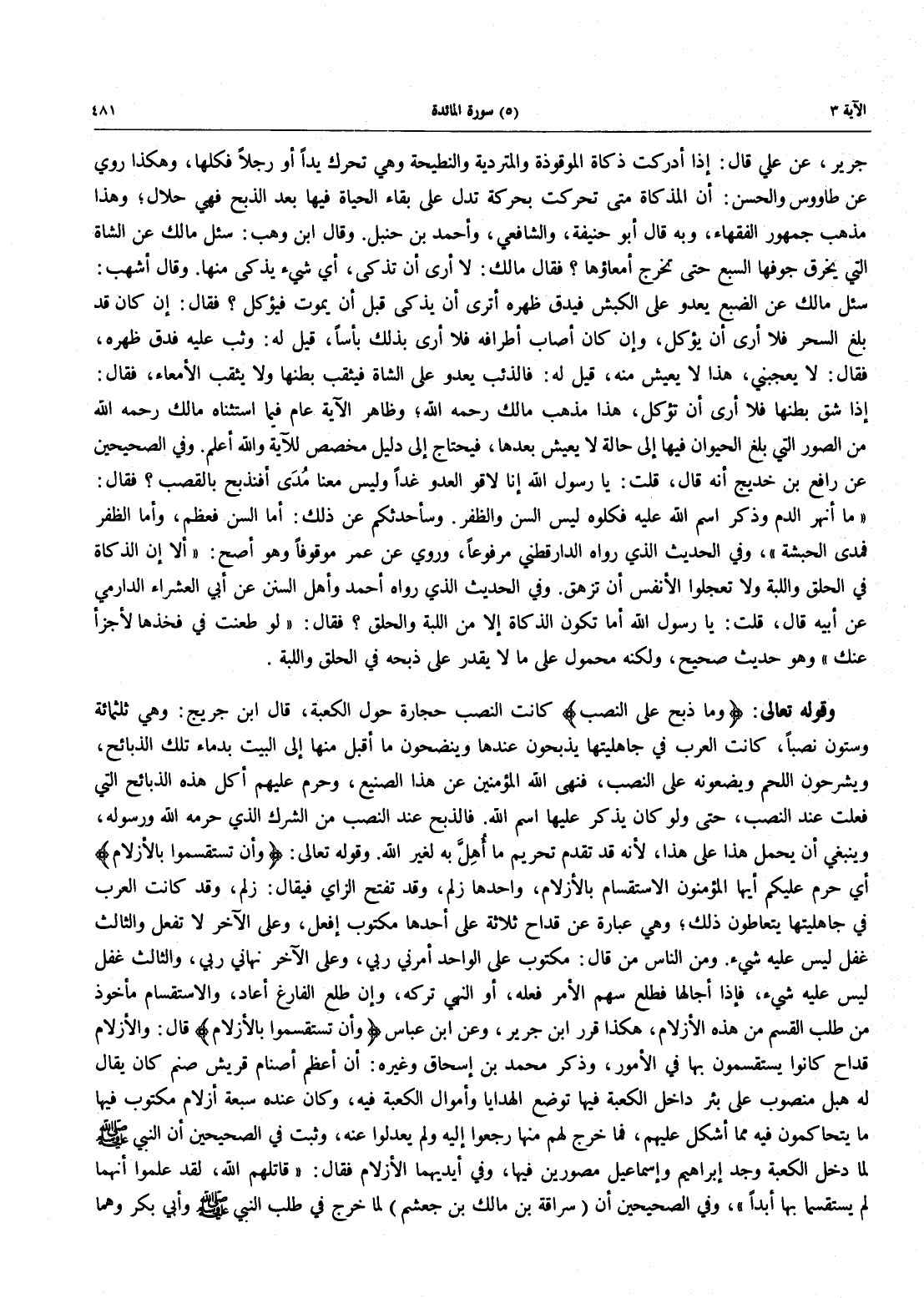 وَقَوْلُهُ تعالى: {وَمَا ذُبِحَ عَلَى النصب} كَانَتِ النُّصُبُ حِجَارَةً حَوْلَ الْكَعْبَةِ، قَالَ ابْنُ جريج: وهي ثلثمائة وستون نصباً، كانت الْعَرَبُ فِي جَاهِلِيَّتِهَا يَذْبَحُونَ عِنْدَهَا وَيَنْضَحُونَ مَا أَقْبَلَ مِنْهَا إِلَى الْبَيْتِ بِدِمَاءِ تِلْكَ الذَّبَائِحِ، ويشرحون اللحم ويضعونه على النصب، فَنَهَى اللَّهُ الْمُؤْمِنِينَ عَنْ هَذَا الصَّنِيعِ، وَحَرَّمَ عَلَيْهِمْ أَكْلَ هَذِهِ الذَّبَائِحِ الَّتِي فُعِلَتْ عِنْدَ النُّصُبِ، حَتَّى وَلَوْ كَانَ يُذْكَرُ عَلَيْهَا اسْمُ الله فالذبح عِنْدَ النُّصُبِ مِنَ الشِّرْكِ الَّذِي حَرَّمَهُ اللَّهُ وَرَسُولُهُ، وَيَنْبَغِي أَنْ يُحْمَلَ هَذَا عَلَى هَذَا، لِأَنَّهُ قَدْ تَقَدَّمَ تَحْرِيمُ مَا أُهِلَّ بِهِ لغير الله. وقوله تعالى: {وأن تسقسموا بِالْأَزْلَامِ} أَيْ حَرُمَ عَلَيْكُمْ أَيُّهَا الْمُؤْمِنُونَ الِاسْتِقْسَامُ بالأزلام، واحدها زلم، وقد تفتح الزاء فَيُقَالُ: زَلم، وَقَدْ كَانَتِ الْعَرَبُ فِي جَاهِلِيَّتِهَا يَتَعَاطَوْنَ ذَلِكَ، وَهِيَ عِبَارَةٌ عَنْ قِدَاحٍ ثَلَاثَةٍ عَلَى أَحَدِهَا مَكْتُوبٌ أَفْعَلُ، وَعَلَى الْآخَرِ لَا تَفْعَلْ وَالثَّالِثُ غُفْلٌ لَيْسَ عَلَيْهِ شَيْءٌ وَمِنَ النَّاسِ مَنْ قَالَ: مَكْتُوبٌ عَلَى الْوَاحِدِ أَمَرَنِي ربي، على الْآخَرِ نَهَانِي رَبِّي، وَالثَّالِثُ غُفْلٌ لَيْسَ عَلَيْهِ شيء، فإذا أجالها فطلع سهم الأمر فعله، أو النهي تركه، وإن طلع الفارغ أعاد، وَالِاسْتِقْسَامُ مَأْخُوذٌ مِنْ طَلَبِ الْقِسْمِ مِنْ هَذِهِ الأزلام، هكذا قرر ابن جرير، وعن ابن عباس {وَإِنَّ تسقسموا بِالْأَزْلَامِ} قَالَ: وَالْأَزْلَامُ قِدَاحٌ كَانُوا يَسْتَقْسِمُونَ بِهَا في الْأُمُورَ، وَذَكَرَ مُحَمَّدُ بْنُ إِسْحَاقَ وَغَيْرُهُ: أَنَّ أَعْظَمَ أَصْنَامِ قُرَيْشٍ صَنَمٌ كَانَ يُقَالُ لَهُ هبل منصوب على بئر داخل الكبعة فيها توضع الهدايا وأموال الكعبة فيه، وكان عِنْدَهُ سَبْعَةُ أَزْلَامٍ مَكْتُوبٌ فِيهَا مَا يَتَحَاكَمُونَ فيه مما أشكل عليهم، فلما خَرَجَ لَهُمْ مِنْهَا رَجَعُوا إِلَيْهِ وَلَمْ يَعْدِلُوا عنه، وثبت فِي الصَّحِيحَيْنِ أَنَّ النَّبِيَّ صلَّى اللَّهُ عَلَيْهِ وَسَلَّمَ لَمَّا دَخَلَ الْكَعْبَةَ وَجَدَ إِبْرَاهِيمَ وَإِسْمَاعِيلَ مُصَوَّرَيْنِ فِيهَا، وَفِي أَيْدِيهِمَا الْأَزْلَامُ فَقَالَ: «قَاتَلَهُمُ اللَّهُ، لَقَدْ عَلِمُوا أَنَّهُمَا لَمْ يَسْتَقْسِمَا بِهَا أَبَدًا»، وَفِي الصحيحين أَنَّ (سُرَاقَةَ بْنَ مَالِكِ بْنِ جُعْشُمٍ) لَمَّا خَرَجَ فِي طَلَبِ النَّبِيِّ صَلَّى اللَّهُ عَلَيْهِ وَسَلَّمَ وَأَبِي بَكْرٍ وَهُمَا