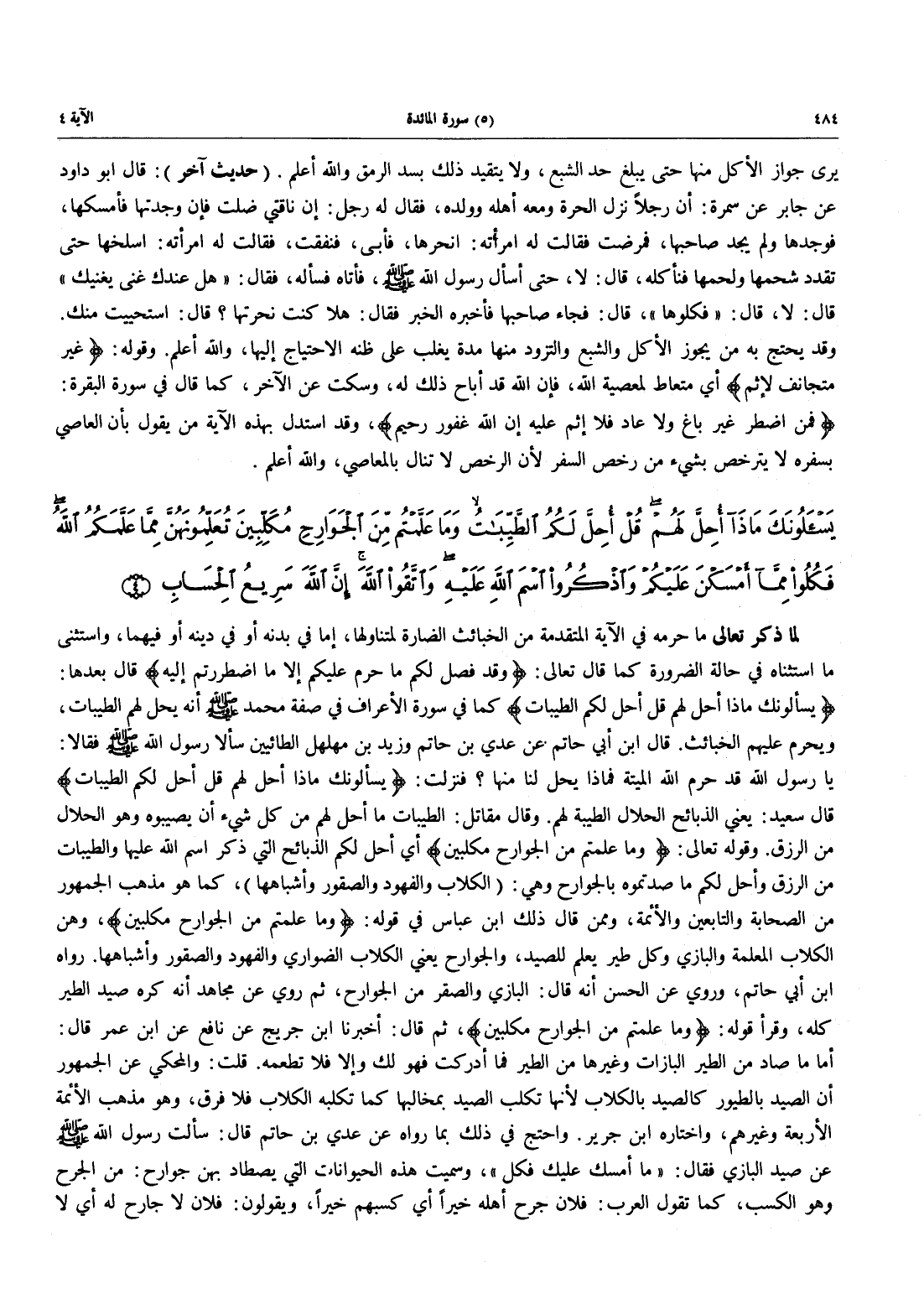 - 4 - يَسْأَلُونَكَ مَاذَآ أُحِلَّ لَهُمْ قُلْ أُحِلَّ لَكُمُ الطَّيِّبَاتُ وَمَا علَّمتم مِنَ الْجَوَارِحِ مُكَلِّبِينَ تُعَلِّمُونَهُنَّ مِمَّا عَلَّمَكُمُ اللَّهُ فَكُلُواْ مِمَّآ أَمْسَكْنَ عَلَيْكُمْ وَاذْكُرُوا اسْمَ اللَّهِ عَلَيْهِ وَاتَّقُوا اللَّهَ إِنَّ اللَّهَ سَرِيعُ الْحِسَابِ