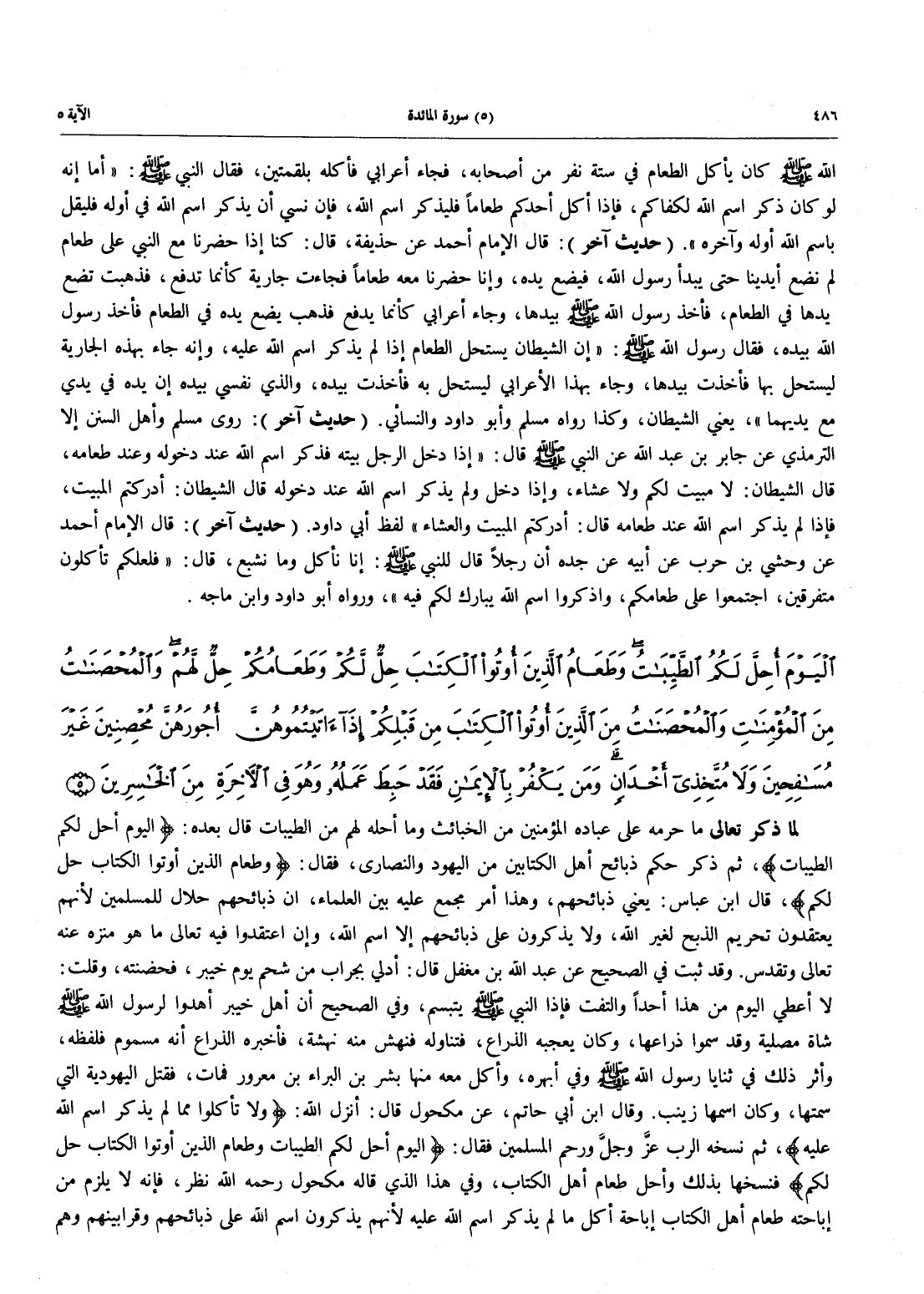 لَمَّا ذَكَرَ تَعَالَى مَا حَرَّمَهُ عَلَى عِبَادِهِ الْمُؤْمِنِينَ مِنَ الْخَبَائِثِ وَمَا أَحَلَّهُ لَهُمْ مِنَ الطَّيِّبَاتِ قَالَ بَعْدَهُ: {الْيَوْمَ أُحِلَّ لَكُمُ الطَّيِّبَاتُ}، ثُمَّ ذَكَرَ حُكْمَ ذَبَائِحِ أَهْلِ الْكِتَابَيْنِ مِنَ الْيَهُودِ وَالنَّصَارَى، فَقَالَ: {وَطَعَامُ الَّذِينَ أُوتُواْ الكتاب حِلٌّ لَّكُمْ}، قال ابن عباس: يَعْنِي ذَبَائِحَهُمْ، وَهَذَا أَمْرٌ مُجْمَعٌ عَلَيْهِ بَيْنَ العلماء، أن ذبائحهم حلال للمسلمن لِأَنَّهُمْ يَعْتَقِدُونَ تَحْرِيمَ الذَّبْحِ لِغَيْرِ اللَّهِ، وَلَا يَذْكُرُونَ عَلَى ذَبَائِحِهِمْ إِلَّا اسْمَ اللَّهِ، وَإِنِ اعتقدوا فيه تعالى ما هو منزه عنه تَعَالَى وَتَقَدَّسَ. وَقَدْ ثَبَتَ فِي الصَّحِيحِ عَنْ عبد الله بن مغفل قال: أدلي بجراب من شحم يوم خيبر، فحضنته، وَقُلْتُ: لَا أُعْطِي الْيَوْمَ مِنْ هَذَا أَحَدًا وَالْتَفَتُّ فَإِذَا النَّبِيُّ صَلَّى اللَّهُ عَلَيْهِ وَسَلَّمَ يتبسم، وفي الصَّحِيحِ أَنَّ أَهْلَ خَيْبَرَ أَهْدَوْا لِرَسُولِ اللَّهِ صَلَّى اللَّهُ عَلَيْهِ وَسَلَّمَ شَاةٌ مَصْلِيَّةً وَقَدْ سَمُّوا ذِرَاعَهَا، وَكَانَ يُعْجِبُهُ الذِّرَاعُ، فَتَنَاوَلَهُ فَنَهَشَ مِنْهُ نَهْشَةً، فَأَخْبَرَهُ الذِّرَاعُ أَنَّهُ مَسْمُومٌ فَلَفَظَهُ، وأثر ذلك فِي ثَنَايَا رَسُولَ اللَّهِ صَلَّى اللَّهُ عَلَيْهِ وَسَلَّمَ وَفِي أبْهَرِهِ، وَأَكَلَ مَعَهُ مِنْهَا بِشْرُ بن البراء بن عرور فَمَاتَ، فَقَتَلَ الْيَهُودِيَّةَ الَّتِي سَمَّتْهَا، وَكَانَ اسْمُهَا زينب وقال ابن أبي حاتم، عَنْ مَكْحُولٍ قَالَ: أَنْزَلَ اللَّهُ: {وَلَا تَأْكُلُواْ مِمَّا لَمْ ذكر اسم الله عليه} ثم نسخه الرَّبُّ عزَّ وجلَّ وَرَحِمَ الْمُسْلِمِينَ فَقَالَ: {الْيَوْمَ أُحِلَّ لَكُمُ الطيبات وطعام الذين أوتو الْكِتَابَ حِلٌّ لَّكُمْ} فَنَسَخَهَا بِذَلِكَ وَأَحَلَّ طَعَامَ أَهْلِ الْكِتَابِ، وَفِي هَذَا الَّذِي قَالَهُ مَكْحُولٌ رَحِمَهُ اللَّهُ نَظَرٌ، فَإِنَّهُ لَا يَلْزَمُ مِنْ إِبَاحَتِهِ طَعَامَ أَهْلِ الْكِتَابِ إِبَاحَةُ أَكْلِ مَا لَمْ يُذْكَرِ اسْمُ اللَّهِ عَلَيْهِ لِأَنَّهُمْ يَذْكُرُونَ اسْمَ اللَّهِ عَلَى ذَبَائِحِهِمْ وَقَرَابِينِهِمْ وَهُمْ