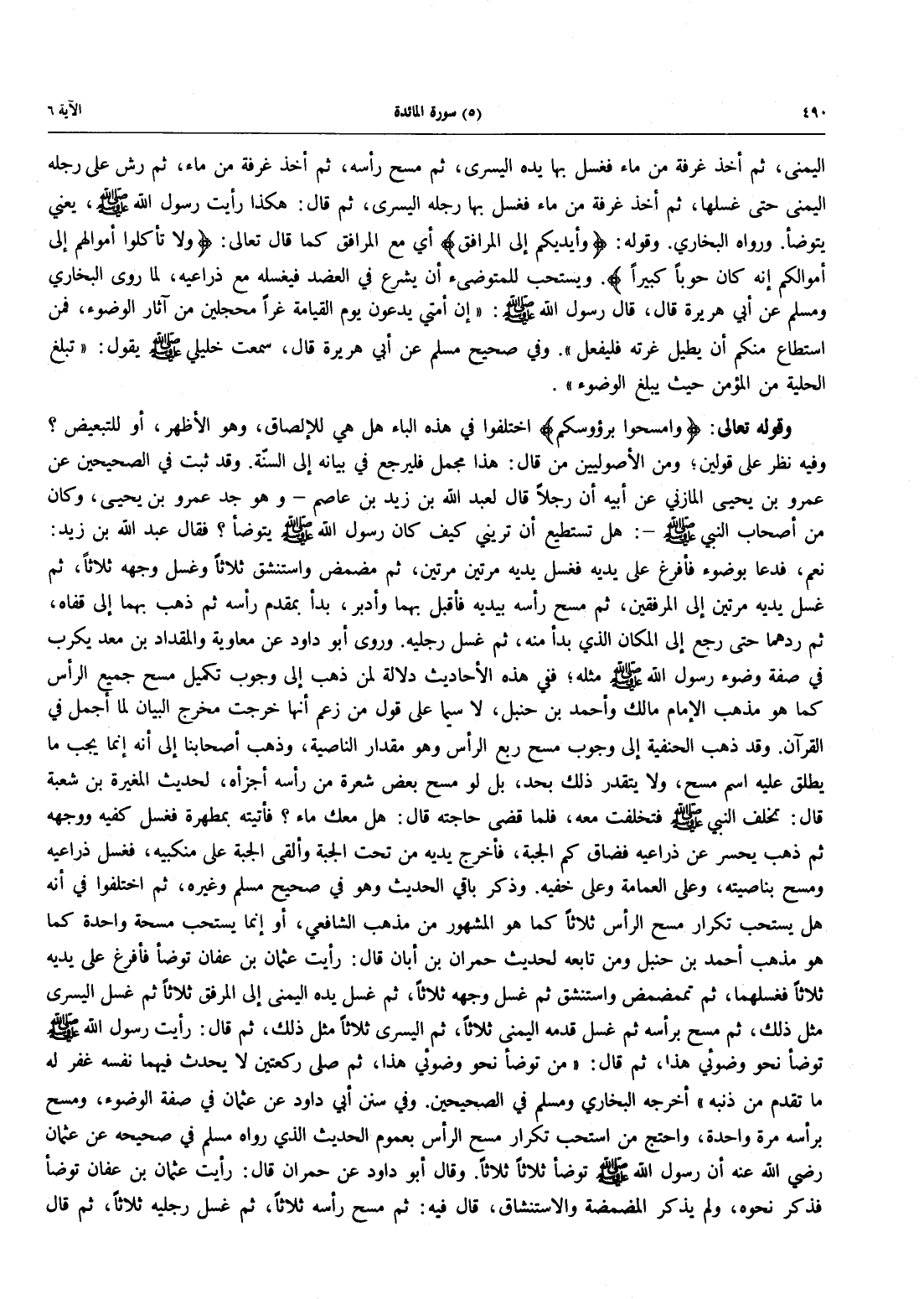 الْيُمْنَى، ثُمَّ أَخَذَ غَرْفَةً مِنْ مَاءٍ فَغَسَلَ بِهَا يَدَهُ الْيُسْرَى، ثُمَّ مَسَحَ رَأْسَهُ، ثُمَّ أَخَذَ غَرْفَةً مِنْ مَاءٍ، ثُمَّ رَشَّ عَلَى رِجْلِهِ الْيُمْنَى حَتَّى غَسْلَهَا، ثُمَّ أَخَذَ غَرْفَةً من ماء فَغَسَلَ بِهَا رِجْلَهُ الْيُسْرَى، ثُمَّ قَالَ: هَكَذَا رَأَيْتُ رَسُولَ اللَّهِ صَلَّى اللَّهُ عَلَيْهِ وَسَلَّمَ، يعني يتوضأ. ورواه البخاري. وَقَوْلُهُ: {وَأَيْدِيَكُمْ إِلَى الْمَرَافِقِ} أَيْ مَعَ الْمَرَافِقِ كَمَا قَالَ تَعَالَى: {وَلاَ تَأْكُلُوا أَمْوَالَهُمْ إِلَى أَمْوَالِكُمْ إِنَّهُ كَانَ حوباً كبيراً} ويستحب للمتوضىء أن يشرع في العضد فيغسله مع ذراعيه، لما روى البخاري ومسلم عَنْ أَبِي هُرَيْرَةَ قَالَ، قَالَ رَسُولُ اللَّهِ صَلَّى اللَّهُ عَلَيْهِ وَسَلَّمَ «إِنَّ أُمَّتِي يُدْعَوْنَ يَوْمَ الْقِيَامَةِ غُرًّا مُحَجَّلِينَ مِنْ آثَارِ الْوُضُوءِ، فَمَنِ اسْتَطَاعَ مِنْكُمْ أَنْ يُطِيلَ غُرَّتَهُ فَلْيَفْعَلْ». وفي صحيح مسلم عَنْ أَبِي هُرَيْرَةَ قَالَ، سَمِعْتُ خَلِيلِي صَلَّى اللَّهُ عَلَيْهِ وَسَلَّمَ يَقُولُ: «تَبْلُغُ الْحِلْيَةُ مِنَ الْمُؤْمِنِ حَيْثُ يَبْلُغُ الْوُضُوءُ».