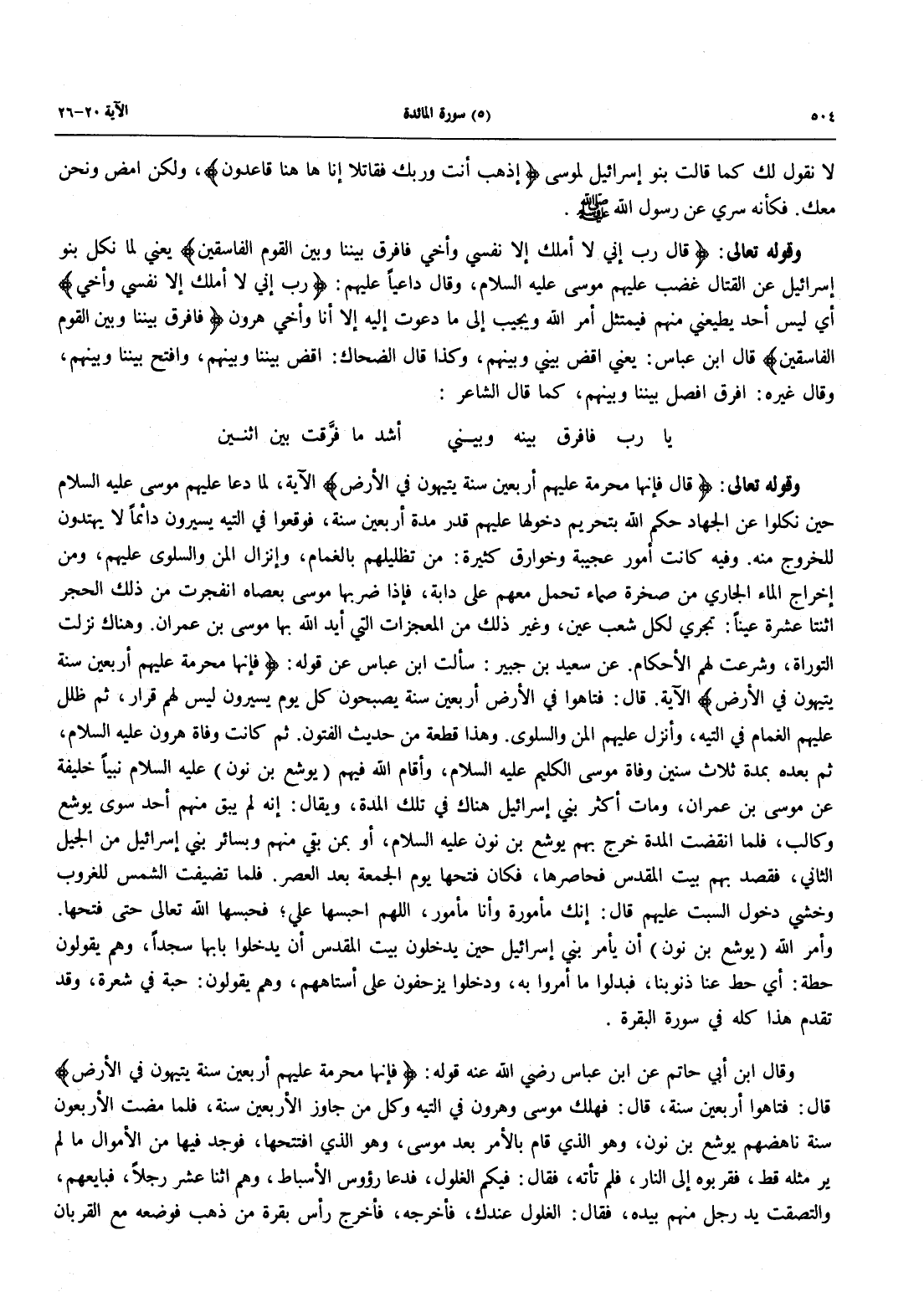 وَقَوْلُهُ تَعَالَى: {قَالَ فَإِنَّهَا مُحَرَّمَةٌ عَلَيْهِمْ أَرْبَعِينَ سَنَةً يَتِيهُونَ فِي الأرض} الآية، لَمَّا دَعَا عَلَيْهِمْ مُوسَى عَلَيْهِ السَّلَامُ حِينَ نكلوا عن الجهاد حكم الله بتحريم دخولها عليهم قدر مُدَّةَ أَرْبَعِينَ سَنَةً، فَوَقَعُوا فِي التِّيهِ يَسِيرُونَ دَائِمًا لَا يَهْتَدُونَ لِلْخُرُوجِ مِنْهُ. وَفِيهِ كَانَتْ أُمُورٌ عَجِيبَةٌ وَخَوَارِقُ كَثِيرَةٌ: مِنْ تَظْلِيلِهِمْ بِالْغَمَامِ، وَإِنْزَالِ الْمَنِّ وَالسَّلْوَى عَلَيْهِمْ، وَمِنْ إِخْرَاجِ الْمَاءِ الْجَارِي مِنْ صَخْرَةٍ صَمَّاءَ تُحْمَلُ مَعَهُمْ عَلَى دَابَّةٍ، فَإِذَا ضَرَبَهَا مُوسَى بِعَصَاهُ انْفَجَرَتْ مِنْ ذَلِكَ الْحَجَرِ اثْنَتَا عَشْرَةَ عَيْنًا: تَجْرِي لِكُلِّ شِعْبٍ عَيْنٌ، وَغَيْرُ ذَلِكَ مِنَ الْمُعْجِزَاتِ الَّتِي أَيَّدَ اللَّهُ بِهَا مُوسَى بْنَ عِمْرَانَ. وَهُنَاكَ نزلت التوراة، وشرعت لهم الأحكام. عَنْ سَعِيدِ بْنِ جُبَيْرٍ: سَأَلْتُ ابْنَ عَبَّاسٍ عَنْ قَوْلِهِ: {فَإِنَّهَا مُحَرَّمَةٌ عَلَيْهِمْ أَرْبَعِينَ سَنَةً يَتِيهُونَ فِي الْأَرْضِ {الْآيَةَ. قَالَ: فَتَاهُوا فِي الْأَرْضِ أَرْبَعِينَ سَنَةً يُصْبِحُونَ كُلَّ يَوْمٍ يَسِيرُونَ لَيْسَ لَهُمْ قَرَارٌ، ثُمَّ ظَلَّلَ عَلَيْهِمُ الْغَمَامَ فِي التِّيهِ، وَأَنْزَلَ عَلَيْهِمُ الْمَنَّ وَالسَّلْوَى. وَهَذَا قِطْعَةٌ مِنْ حَدِيثِ الْفُتُونِ. ثُمَّ كَانَتْ وَفَاةُ هرون عليه السلام، ثم بعده بمدة ثلاث سنين وفاة مُوسَى الْكِلِيمُ عَلَيْهِ السَّلَامُ، وَأَقَامَ اللَّهُ فِيهِمْ (يُوشَعَ بْنَ نُونٍ) عَلَيْهِ السَّلَامُ نَبِيًّا خَلِيفَةً عَنْ مُوسَى بْنِ عِمْرَانَ، وَمَاتَ أَكْثَرُ بَنِي إِسْرَائِيلَ هُنَاكَ فِي تِلْكَ الْمُدَّةِ، وَيُقَالُ: إِنَّهُ لم يبق منهم أحد سوى يوشع وكالب، فَلَمَّا انْقَضَتِ الْمُدَّةُ خَرَجَ بِهِمْ يُوشَعُ بْنُ نُونٍ عَلَيْهِ السَّلَامُ، أَوْ بِمَنْ بَقِيَ مِنْهُمْ وَبِسَائِرِ بَنِي إِسْرَائِيلَ مِنَ الْجِيلِ الثَّانِي، فَقَصَدَ بِهِمْ بَيْتَ الْمَقْدِسِ فَحَاصَرَهَا، فَكَانَ فَتْحُهَا يَوْمَ الْجُمُعَةِ بَعْدَ الْعَصْرِ. فَلَمَّا تَضَيَّفَتِ الشَّمْسُ لِلْغُرُوبِ وَخَشِيَ دُخُولَ السَّبْتِ عَلَيْهِمْ قَالَ: إِنَّكِ مَأْمُورَةٌ وَأَنَا مَأْمُورٌ، اللَّهُمَّ احْبِسْهَا عَلَيَّ؛ فَحَبَسَهَا اللَّهُ تَعَالَى حَتَّى فَتَحَهَا وَأَمَرَ اللَّهُ (يُوشَعَ بْنَ نُونٍ) أَنْ يَأْمُرَ بَنِي إِسْرَائِيلَ حِينَ يَدْخُلُونَ بَيْتَ الْمَقْدِسِ أَنْ يَدْخُلُوا بَابَهَا سُجَّدًا، وَهُمْ يَقُولُونَ حِطَّةٌ: أَيْ حُطَّ عَنَّا ذُنُوبَنَا، فَبَدَّلُوا ما أمروا به، ودخلوا يزحفون على أستاههم، هم يَقُولُونَ: حَبَّةٌ فِي شَعْرَةٍ، وَقَدْ تَقَدَّمَ هَذَا كُلُّهُ فِي سُورَةِ الْبَقَرَةِ.