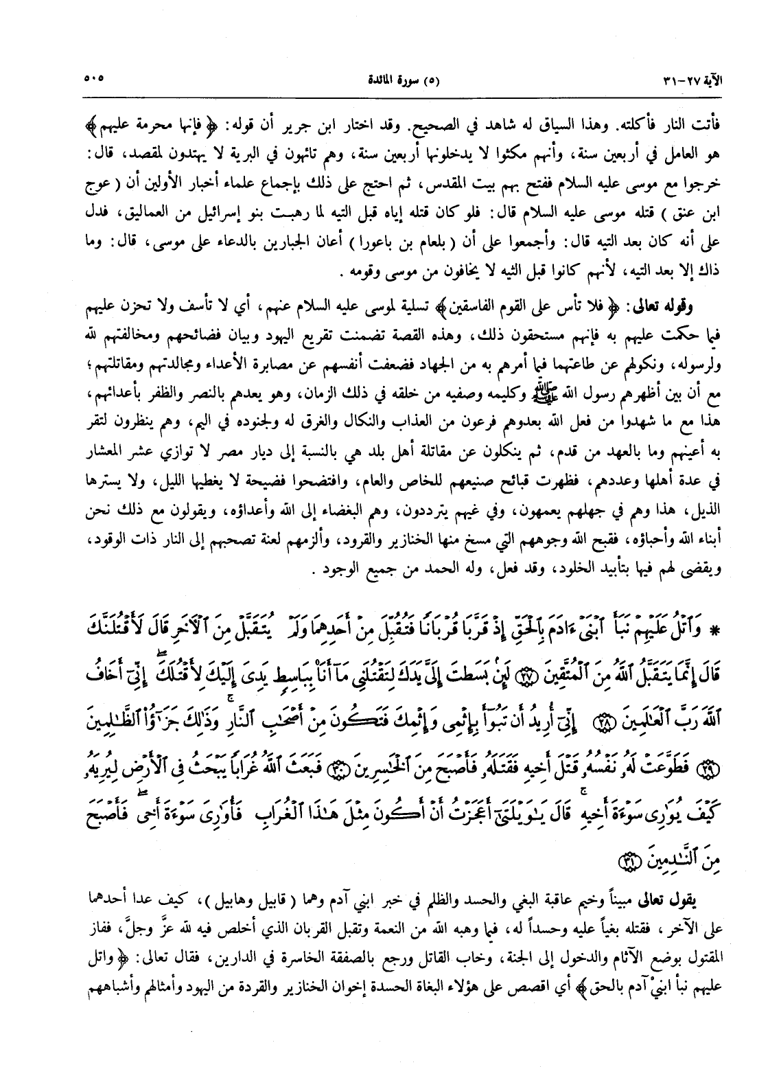 يَقُولُ تَعَالَى مُبَيِّنًا وَخِيمَ عَاقِبَةِ الْبَغْيِ وَالْحَسَدِ وَالظُّلْمِ فِي خَبَرِ ابني آدم وهما (قابيل وهابيل)، كَيْفَ عَدَا أَحَدُهُمَا عَلَى الْآخَرِ، فَقَتَلَهُ بَغْيًا عَلَيْهِ وَحَسَدًا لَهُ، فِيمَا وَهَبَهُ اللَّهُ مِنَ النِّعْمَةِ وَتَقَبُّلِ الْقُرْبَانِ الَّذِي أَخْلَصَ فِيهِ لِلَّهِ عزَّ وجلَّ ففاز المقتول بوضع الآثان وَالدُّخُولِ إِلَى الْجَنَّةِ، وَخَابَ الْقَاتِلُ وَرَجَعَ بِالصَّفْقَةِ الخاسرة في الدارين، فَقَالَ تَعَالَى: {وَاتْلُ عَلَيْهِمْ نَبَأَ ابْنَيْ آدَمَ بالحق} أي اقصص عَلَى هَؤُلَاءِ الْبُغَاةِ الْحَسَدَةِ إِخْوَانِ الْخَنَازِيرِ وَالْقِرَدَةِ مِنَ الْيَهُودِ وَأَمْثَالِهِمْ وَأَشْبَاهِهِمْ