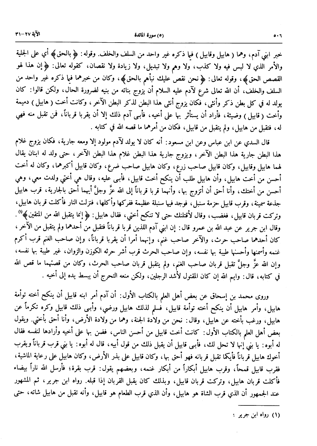 قال السدي عن ابن عباس وعن ابن مسعود: أَنَّهُ كَانَ لَا يُولَدُ لِآدَمَ مَوْلُودٌ إِلَّا ومعه جَارِيَةٌ، فَكَانَ يُزَوِّجُ غُلَامَ هَذَا الْبَطْنِ جَارِيَةَ هَذَا الْبَطْنِ الْآخَرِ، وَيُزَوِّجُ جَارِيَةَ هَذَا الْبَطْنِ غُلَامَ هَذَا الْبَطْنِ الْآخَرِ، حَتَّى وُلِدَ لَهُ ابنان يقال لهما هابيل وقابيل، كان قَابِيلُ صَاحِبَ زَرْعٍ، وَكَانَ هَابِيلُ صَاحِبَ ضَرْعٍ، وَكَانَ قَابِيلُ أَكْبَرَهُمَا، وَكَانَ لَهُ أُخْتٌ أَحْسَنَ مِنْ أُخْتِ هَابِيلَ، وَإِنَّ هَابِيلَ طَلَبَ أَنْ يَنْكِحَ أُخْتَ قَابِيلَ، فَأَبَى عَلَيْهِ، وَقَالَ هِيَ أُخْتِي وُلِدَتْ مَعِي، وَهِيَ أَحْسَنُ مِنْ أُخْتِكَ، وأنا أحق أن أتزوج بها، وَأَنَّهُمَا قَرَّبَا قُرْبَانًا إِلَى اللَّهِ عزَّ وجلَّ أيهما أحق بالجارية، قرب هابيل جذعة سمينة، وَقَرَّبَ قَابِيلُ حِزْمَةَ سُنْبُلٍ، فَوَجَدَ فِيهَا سُنْبُلَةً عظيمة ففركها وأكلها، فنزلت النار فأكلت قربانا هَابِيلَ، وَتَرَكَتْ قُرْبَانَ قَابِيلَ، فَغَضِبَ، وَقَالَ لِأَقْتُلُنَّكَ حَتَّى لَا تَنْكِحَ أُخْتِي، فَقَالَ هَابِيلُ {إِنَّمَا يَتَقَبَّلُ اللَّهُ مِنَ الْمُتَّقِينَ} (رَوَاهُ ابْنُ جَرِيرٍ) وَقَالَ ابْنُ جَرِيرٍ عَنْ عَبْدِ اللَّهِ بْنِ عَمْرٍو قَالَ: إِنَّ ابْنَيْ آدَمَ اللَّذَيْنِ قَرَّبَا قربانا فتقبل من أحدهما ولم يتقبل من الْآخَرِ، كَانَ أَحَدُهُمَا صَاحِبَ حَرْثٍ، وَالْآخِرُ صَاحِبَ غَنَمٍ، وَإِنَّهُمَا أُمِرَا أَنْ يُقَرِّبَا قُرْبَانًا، وَإِنَّ صَاحِبَ الْغَنَمِ قَرَّبَ أَكْرَمَ غَنَمِهِ وَأَسْمَنَهَا وَأَحْسَنَهَا طَيِّبَةً بِهَا نَفْسُهُ، وَإِنَّ صَاحِبَ الْحَرْثِ قرَّب أشر حرثه الكوزن وَالزَّوَانِ غَيْرَ طَيِّبَةٍ بِهَا نَفْسُهُ وَإِنَّ اللَّهَ عزَّ وجلَّ تَقَبَّلَ قُرْبَانَ صَاحِبِ الْغَنَمِ، وَلَمْ يَتَقَبَّلْ قُرْبَانَ صَاحِبِ الْحَرْثِ، وَكَانَ مِنْ قِصَّتِهِمَا مَا قَصَّ اللَّهُ فِي كِتَابِهِ، قَالَ: وَايْمُ اللَّهِ إِنْ كَانَ الْمَقْتُولُ لَأَشَدَّ الرَّجُلَيْنِ، وَلَكِنْ مَنْعَهُ التَّحَرُّجُ أَنْ يَبْسُطَ يَدَهُ إِلَى أَخِيهِ. وروى مُحَمَّدُ بْنُ إِسْحَاقَ عَنْ بَعْضِ أَهْلِ الْعِلْمِ بالكتاب الأول: أن آدم أمر بانه قابيل أَنْ يَنْكِحَ أُخْتَهُ تَوْأَمَةَ هَابِيلَ، وَأَمَرَ هَابِيلَ أن ينكح أخته توأمة قابيل، فسلم لذلك هابيل ورضي، وأبى ذلك قابيل وكره تكرماً عن هَابِيلَ، وَرَغِبَ بِأُخْتِهِ عَنْ هَابِيلَ، وَقَالَ: نَحْنُ من وِلَادَةُ الْجَنَّةِ، وَهُمَا مِنْ وِلَادَةِ الْأَرْضِ، وَأَنَا أَحَقُّ بِأُخْتِي. وَيَقُولُ بَعْضُ أَهْلِ الْعِلْمِ بِالْكِتَابِ الأول: كانت أخت قابيل من أحسن الناس، فضن بها على أخيه وأرادها لنفسه فَقَالَ لَهُ أَبُوهُ: يَا بُنَيَّ إِنَّهَا لَا تَحِلُّ لَكَ، فَأَبَى قَابِيلُ أَنْ يَقْبَلَ ذَلِكَ من قول أبيه، قال لَهُ أَبُوهُ: يَا بُنَيَّ قَرِّبْ قُرْبَانًا وَيُقَرِّبْ أَخُوكَ هَابِيلُ قُرْبَانًا فَأَيُّكُمَا تُقُبِّلَ قُرْبَانُهُ فَهُوَ أحق بها، وكان قابيل عَلَى بِذْرِ الْأَرْضِ، وَكَانَ هَابِيلُ عَلَى رِعَايَةِ الماشية، فقرب قابيل قَمْحًا، وَقَرَّبَ هَابِيلُ أَبْكَارًا مِنْ أَبْكَارِ غَنَمِهِ، وَبَعْضُهُمْ يَقُولُ: قَرَّبَ بَقَرَةً؛ فَأَرْسَلَ اللَّهُ نَارًا بيضاء فأكلت قربان هابيل، وتركت قربان قابيل، وَبِذَلِكَ كَانَ يُقْبَلُ الْقُرْبَانُ إِذَا قَبِلَهُ. (رَوَاهُ ابن جرير)، ثُمَّ الْمَشْهُورُ عِنْدَ الْجُمْهُورِ أَنَّ الَّذِي قَرَّبَ الشَّاةَ هُوَ هَابِيلُ، وَأَنَّ الَّذِي قَرَّبَ الطَّعَامَ هُوَ قَابِيلُ، وَأَنَّهُ تُقُبِّلَ مِنْ هَابِيلَ شَاتُهُ، حتى