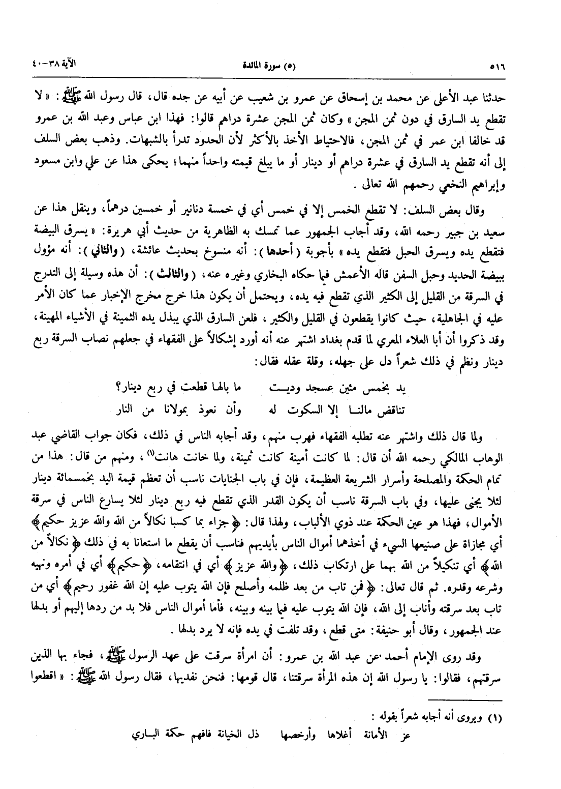 وَقَالَ بَعْضُ السَّلَفِ: لَا تُقْطَعُ الْخَمْسُ إِلَّا فِي خَمْسٍ أَيْ فِي خَمْسَةِ دَنَانِيرَ أَوْ خَمْسِينَ دِرْهَمًا، وَيُنْقُلُ هَذَا عَنْ سَعِيدِ بْنِ جُبَيْرٍ رَحِمَهُ اللَّهُ، وَقَدْ أَجَابَ الْجُمْهُورُ عَمَّا تَمَسَّكَ بِهِ الظَّاهِرِيَّةُ مِنْ حَدِيثِ أَبِي هُرَيْرَةَ: «يَسْرِقُ الْبَيْضَةَ فَتُقْطَعُ يَدُهُ وَيَسْرِقُ الْحَبْلَ فَتُقْطَعُ يَدُهُ» بِأَجْوِبَةٍ (أَحَدُهَا): أَنَّهُ منسوخ بحديث عائشة، (وَالثَّانِي): أَنَّهُ مُؤَوَّلٌ بِبَيْضَةِ الْحَدِيدِ وَحَبْلِ السُّفُنِ قَالَهُ الْأَعْمَشُ فِيمَا حَكَاهُ الْبُخَارِيُّ وَغَيْرُهُ عَنْهُ، (والثالث): أن هذه وَسِيلَةٌ إِلَى التَّدَرُّجِ فِي السَّرِقَةِ مِنَ الْقَلِيلِ إِلَى الْكَثِيرِ الَّذِي تُقْطَعُ فِيهِ يَدُهُ، وَيُحْتَمَلُ أَنْ يَكُونَ هَذَا خَرَجَ مَخْرَجَ الْإِخْبَارِ عَمَّا كَانَ الْأَمْرُ عَلَيْهِ فِي الْجَاهِلِيَّةِ، حَيْثُ كَانُوا يَقْطَعُونَ فِي الْقَلِيلِ وَالْكَثِيرِ، فَلَعَنَ السَّارِقَ الَّذِي يَبْذُلُ يَدَهُ الثَّمِينَةَ فِي الْأَشْيَاءِ الْمَهِينَةِ، وَقَدْ ذَكَرُوا أَنَّ أَبَا الْعَلَاءِ الْمَعَرِّيَّ لَمَّا قَدِمَ بَغْدَادَ اشْتُهِرَ عَنْهُ أَنَّهُ أَوْرَدَ إِشْكَالًا عَلَى الْفُقَهَاءِ فِي جَعْلِهِمْ نِصَابَ السَّرِقَةِ رُبْعَ دِينَارٍ وَنَظَمَ فِي ذَلِكَ شِعْرًا دَلَّ عَلَى جَهْلِهِ، وَقِلَّةِ عَقْلِهِ فَقَالَ: