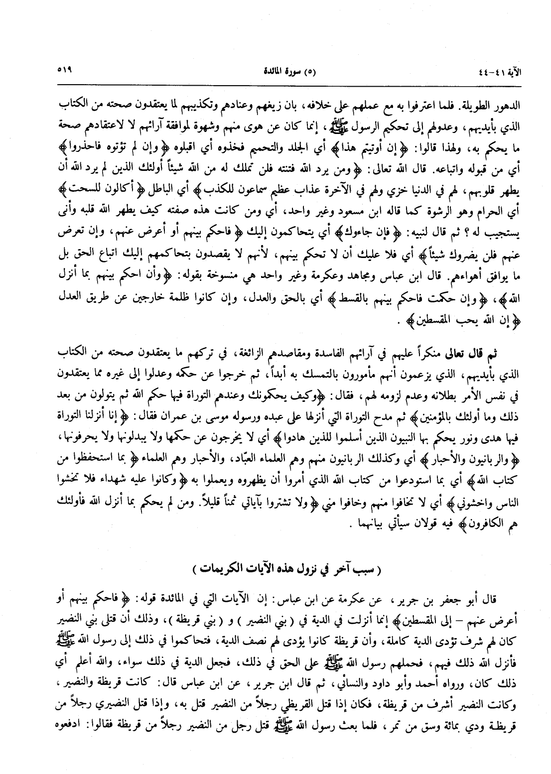 قال أبو جعفر بن جرير، عَنْ عِكْرِمَةَ عَنِ ابْنِ عَبَّاسٍ: أَنَّ الْآيَاتِ التي فِي الْمَائِدَةِ قَوْلُهُ: {فَاحْكُمْ بَيْنَهُمْ أَوْ أَعْرِضْ عَنْهُمْ - إِلَى الْمُقْسِطِينَ} إِنَّمَا أُنْزِلَتْ فِي الدِّيَةِ في (بني النضير) و (بني قُرَيْظَةَ) وَذَلِكَ أَنَّ قَتْلَى بَنِي النَّضِيرِ كَانَ لَهُمْ شَرَفٌ تُؤْدَى الدِّيَةُ كَامِلَةً، وَأَنْ قُرَيْظَةَ كانوا يؤدى لهم نِصْفَ الدِّيَةِ، فَتَحَاكَمُوا فِي ذَلِكَ إِلَى رَسُولِ اللَّهِ صَلَّى اللَّهُ عَلَيْهِ وَسَلَّمَ فَأَنْزَلَ اللَّهُ ذَلِكَ فِيهِمْ، فَحَمَلَهُمْ رَسُولُ اللَّهِ صَلَّى اللَّهُ عَلَيْهِ وَسَلَّمَ عَلَى الْحَقِّ فِي ذَلِكَ، فَجَعَلَ الدِّيَةَ فِي ذَلِكَ سَوَاءً، وَاللَّهُ أَعْلَمُ أَيَّ ذَلِكَ كَانَ، وَرَوَاهُ أَحْمَدُ وَأَبُو دَاوُدَ وَالنَّسَائِيُّ، ثم قال ابن جرير، عَنِ ابْنِ عَبَّاسٍ قَالَ: كَانَتْ قُرَيْظَةُ وَالنَّضِيرُ، وَكَانَتِ النَّضِيرُ أَشْرَفَ مِنْ قُرَيْظَةَ، فَكَانَ إِذَا قتل القريظي رَجُلًا مِنَ النَّضِيرِ قُتِلَ بِهِ، وَإِذَا قَتَلَ النضيري رجلاً من قريظة ودي بمائة وسق من تَمْرٍ، فَلَمَّا بُعِثَ رَسُولُ اللَّهِ صَلَّى اللَّهُ عَلَيْهِ وَسَلَّمَ قَتَلَ رَجُلٌ مِنَ النَّضِيرِ رَجُلًا من قريظة فقالوا: ادفعوه