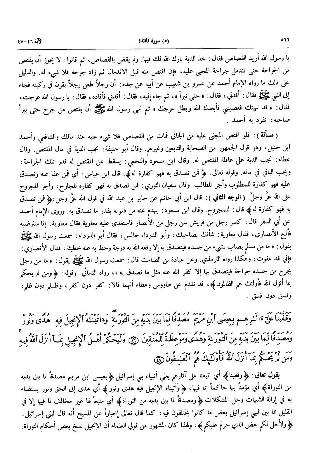 (مَسْأَلَةٌ): فَلَوِ اقْتَصَّ الْمَجْنِيُّ عَلَيْهِ مِنَ الْجَانِي فَمَاتَ مِنَ الْقِصَاصِ فَلَا شَيْءَ عَلَيْهِ عِنْدَ مَالِكٍ وَالشَّافِعِيِّ وأحمد ابن حَنْبَلٍ، وَهُوَ قَوْلُ الْجُمْهُورِ مِنَ الصَّحَابَةِ وَالتَّابِعَيْنِ وَغَيْرِهِمْ. وَقَالَ أَبُو حَنِيفَةَ: تَجِبُ الدِّيَةُ فِي مال المقتص. وقال عطاء: تَجِبُ الدِّيَةُ عَلَى عَاقِلَةِ الْمُقْتَصِّ لَهُ. وَقَالَ ابن مسعود والنخعي: يَسْقُطُ عَنِ الْمُقْتَصِّ لَهُ قَدْرُ تِلْكَ الْجِرَاحَةِ، ويجب الباقي في ماله. وقوله تعالى: {فَمَن تَصَدَّقَ بِهِ فَهُوَ كَفَّارَةٌ لَّهُ} قَالَ ابن عباس: أي فَمَنْ عَفَا عَنْهُ وَتَصَدَّقَ عَلَيْهِ فَهُوَ كَفَّارَةٌ للمطلوب وأجر للطالب. وقال سفيان الثوري: فَمَن تَصَدَّقَ بِهِ فهو كفارة التجارح، وأجر المجروح على الله عزَّ وجلَّ (الوجه الثاني): قال ابن أبي حاتم عَنْ جَابِرِ بْنِ عَبْدِ اللَّهِ فِي قَوْلِ اللَّهِ عزَّ وجلَّ: {فَمَن تَصَدَّقَ بِهِ فَهُوَ كَفَّارَةٌ لَّهُ} قال: للمجروح. وقال ابن مسعود: يَهْدِمُ عَنْهُ مِنْ ذُنُوبِهِ بِقَدْرِ مَا تَصَدَّقَ به. وروى الإمام أحمد عَنْ أَبِي السَّفَرِ قَالَ: كَسَرَ رَجُلٌ مِنْ قُرَيْشٍ سِنَّ رَجُلٍ مِنَ الْأَنْصَارِ فَاسْتَعْدَى عَلَيْهِ معاوية فقال مُعَاوِيَةُ: إِنَّا سَنُرْضِيهِ فَأَلَحَّ الْأَنْصَارِيُّ، فَقَالَ مُعَاوِيَةُ: شَأْنُكَ بِصَاحِبِكَ، وَأَبُو الدَّرْدَاءِ جَالِسٌ، فَقَالَ أَبُو الدَّرْدَاءِ: سَمِعْتُ رَسُولَ اللَّهِ صَلَّى اللَّهُ عَلَيْهِ وَسَلَّمَ يَقُولُ: "مَا مِنْ مُسْلِمٍ يُصَابُ بِشَيْءٍ من جَسَدِهِ فَيَتَصَدَّقُ بِهِ إِلَّا رَفَعَهُ اللَّهُ بِهِ درجة وحط به عنه خطيئة، فقال الأنصاري: فإني قد عفوت، وهكذا رواه الترمذي. وعن عُبَادَةَ بْنَ الصَّامِتِ قَالَ: سَمِعْتُ رَسُولَ اللَّهِ صَلَّى اللَّهُ عَلَيْهِ وَسَلَّمَ يَقُولُ: «مَا مِنْ رَجُلٍ يُجْرَحُ مِنْ جَسَدِهِ جِرَاحَةً فَيَتَصَدَّقُ بِهَا إلى كَفَّرَ اللَّهُ عَنْهُ مِثْلَ مَا تَصَدَّقَ بِهِ»، رواه النسائي. وَقَوْلُهُ: {وَمَن لَّمْ يَحْكُمْ بِمَا أَنْزَلَ اللَّهُ فَأُولَئِكَ هُمُ الظالمون}، قد تقدم عن طاووس وَعَطَاءٍ أَنَّهُمَا قَالَا: كُفْرٌ دُونَ كُفْرٍ، وَظُلْمٌ دُونَ ظُلْمٍ، وَفِسْقٌ دُونَ فِسْقٍ.
