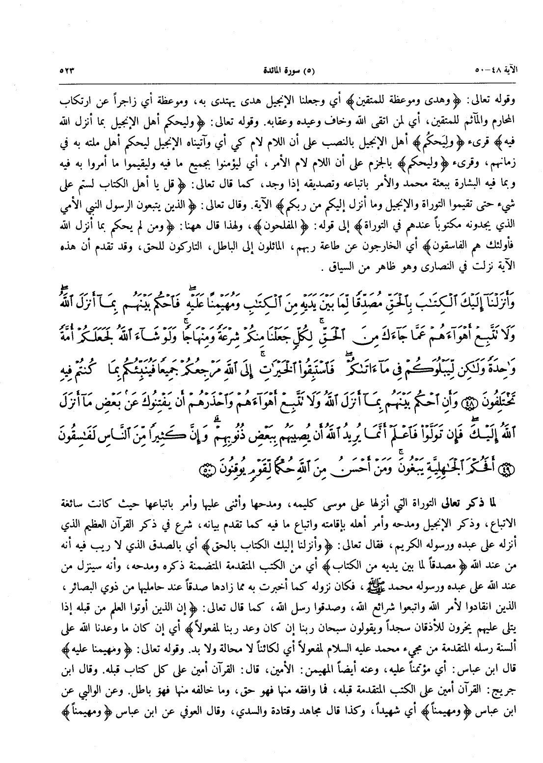 - 48 - وَأَنزَلْنَآ إِلَيْكَ الْكِتَابَ بِالْحَقِّ مُصَدِّقاً لِّمَا بَيْنَ يَدَيْهِ مِنَ الْكِتَابِ وَمُهَيْمِنًا عَلَيْهِ فَاحْكُمْ بَيْنَهُم بِمَآ أَنْزَلَ اللَّهُ وَلاَ تَتَّبِعْ أَهْوَآءَهُمْ عَمَّا جَآءَكَ مِنَ الْحَقِّ لِكُلٍّ جَعَلْنَا مِنكُمْ شِرْعَةً وَمِنْهَاجاً وَلَوْ شَآءَ اللَّهُ لَجَعَلَكُمْ أُمَّةً وَاحِدَةً وَلَكِنْ ليبلوكم فيما آتَاكُم فَاسْتَبِقُوا الخَيْرَاتِ إِلَى اللَّهِ مَرْجِعُكُمْ جَمِيعاً فَيُنَبِّئُكُمْ بِمَا كُنتُمْ فِيهِ تَخْتَلِفُونَ