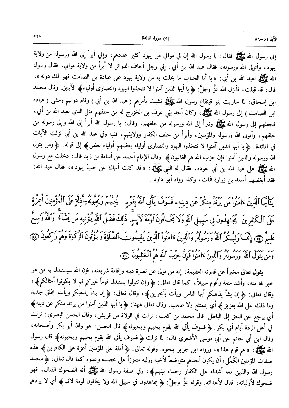 إلى رسول الله صلى الله عليه وسلم فَقَالَ: يَا رَسُولَ اللَّهِ إِنَّ لِي مَوَالِي مَنْ يَهُودٍ كَثِيرٌ عَدَدُهُمْ، وَإِنِّي أَبْرَأُ إِلَى اللَّهِ وَرَسُولِهِ مِنْ وَلَايَةِ يَهُودٍ، وَأَتَوَلَّى اللَّهَ وَرَسُولَهُ، فَقَالَ عَبْدُ اللَّهِ بْنُ أُبَيٍّ: إِنِّي رَجُلٌ أَخَافُ الدَّوَائِرَ لَا أَبْرَأُ مِنْ وِلَايَةِ مَوَالِي، فَقَالَ رَسُولُ اللَّهِ صَلَّى اللَّهُ عَلَيْهِ وَسَلَّمَ لِعَبْدِ اللَّهِ بْنِ أُبَيٍّ: «يَا أَبَا الْحُبَابِ مَا بَخِلْتَ بِهِ مِنْ وَلَايَةِ يَهُودَ عَلَى عُبَادَةَ بْنِ الصَّامِتِ فَهُوَ لَكَ دُونَهُ»، قَالَ: قَدْ قَبِلْتُ، فَأَنْزَلَ اللَّهُ عَزَّ وجلَّ: {يَا أَيُّهَا الَّذِينَ آمَنُواْ لاَ تَتَّخِذُواْ الْيَهُودَ والنصارى أَوْلِيَآءَ} الآيتين. وقال محمد ابن إسحاق: لَمَّا حَارَبَتْ بَنُو قَيْنُقَاعَ رَسُولَ اللَّهِ صَلَّى اللَّهُ عَلَيْهِ وَسَلَّمَ تَشَبَّثَ بِأَمْرِهِمْ (عَبْدُ اللَّهِ بْنُ أُبَيٍّ) وَقَامَ دُونَهُمْ وَمَشَى (عُبَادَةُ بْنُ الصَّامِتِ) إِلَى رَسُولِ اللَّهِ صَلَّى اللَّهُ عَلَيْهِ وَسَلَّمَ، وَكَانَ أَحَدَ بَنِي عَوْفِ بْنِ الْخَزْرَجِ لَهُ مِنْ حِلْفِهِمْ مِثْلَ الَّذِي لِعَبْدِ اللَّهِ بْنِ أُبَيٍّ، فَجَعَلَهُمْ إِلَى رَسُولِ اللَّهِ صَلَّى اللَّهُ عَلَيْهِ وَسَلَّمَ وَتَبَرَّأَ إِلَى اللَّهِ وَرَسُولِهِ من حلفهم، وقال: يا رسول الله أبرأ إِلَى اللَّهِ وَإِلَى رَسُولِهِ مِنْ حِلْفِهِمْ، وَأَتَوَلَّى اللَّهَ وَرَسُولَهُ وَالْمُؤْمِنِينَ، وَأَبْرَأُ مِنْ حِلْفَ الْكُفَّارِ وَوَلَايَتِهِمْ، فَفِيهِ وَفِي عَبْدِ اللَّهِ بْنِ أُبَيٍّ نَزَلَتِ الْآيَاتُ فِي الْمَائِدَةِ: {يَا أَيُّهَا الَّذِينَ آمَنُواْ لاَ تَتَّخِذُواْ الْيَهُودَ وَالنَّصَارَى أَوْلِيَآءَ بَعْضُهُمْ أَوْلِيَآءُ بَعْضٍ} إِلَى قَوْلِهِ: {وَمَن يَتَوَلَّ اللَّهَ وَرَسُولَهُ وَالَّذِينَ آمَنُواْ فَإِنَّ حِزْبَ اللَّهِ هُمُ الغالبون}. وقال الإمام أحمد عَنْ أُسَامَةَ بْنِ زَيْدٍ قَالَ: دَخَلْتُ مَعَ رَسُولِ اللَّهِ صَلَّى اللَّهُ عَلَيْهِ وَسَلَّمَ على عَبْدِ اللَّهِ بْنِ أُبَيٍّ نَعُودُهُ، فَقَالَ لَهُ النَّبِيُّ صَلَّى اللَّهُ عَلَيْهِ وَسَلَّمَ: «قَدْ كُنْتُ أَنْهَاكَ عَنْ حُبِّ يَهُودَ»، فَقَالَ عَبْدُ اللَّهِ: فَقَدْ أَبْغَضَهُمْ أَسْعَدُ بْنُ زُرَارَةَ فَمَاتَ، وَكَذَا رَوَاهُ أَبُو دَاوُدَ.