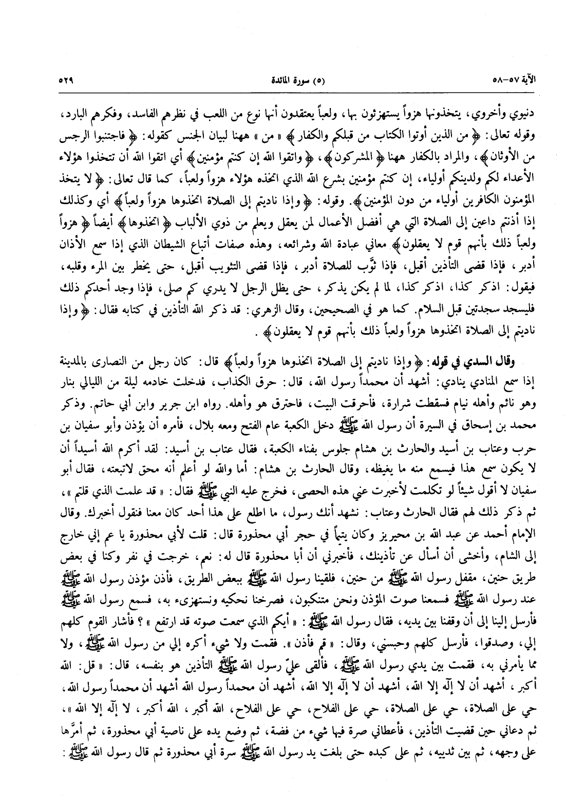 وقال السُّدِّيِّ فِي قَوْلِهِ: {وَإِذَا نَادَيْتُمْ إِلَى الصَّلَاةِ اتَّخَذُوهَا هُزُواً وَلَعِباً} قَالَ: كَانَ رَجُلٌ مِنَ النَّصَارَى بِالْمَدِينَةِ إِذَا سَمِعَ الْمُنَادِي يُنَادِي: أَشْهَدُ أن محمداً رسول الله، قال: حرق الكذاب، فَدَخَلَتْ خَادِمَةٌ لَيْلَةً مِنَ اللَّيَالِي بِنَارٍ وَهُوَ نَائِمٌ وَأَهْلُهُ نِيَامٌ فَسَقَطَتْ شَرَارَةٌ، فَأَحْرَقَتِ الْبَيْتَ، فَاحْتَرَقَ هُوَ وَأَهْلُهُ. رَوَاهُ ابْنُ جَرِيرٍ وَابْنُ أبي حاتم. وذكر مُحَمَّدُ بْنُ إِسْحَاقَ فِي السِّيرَةِ أَنَّ رَسُولَ اللَّهِ صَلَّى اللَّهُ عَلَيْهِ وَسَلَّمَ دَخَلَ الْكَعْبَةَ عَامَ الْفَتْحِ وَمَعَهُ بِلَالٌ، فَأَمَرَهُ أَنْ يُؤَذِّنَ وَأَبُو سُفْيَانَ بْنُ حَرْبٍ وَعَتَّابُ بْنُ أُسَيْدٍ وَالْحَارِثُ بْنُ هِشَامٍ جُلُوسٌ بِفَنَاءِ الْكَعْبَةِ، فَقَالَ عَتَّابُ بْنُ أُسَيْدٍ: لقد أكرم الله أسيداً أن لا يَكُونَ سَمِعَ هَذَا فَيَسْمَعُ مِنْهُ مَا يَغِيظُهُ، وَقَالَ الْحَارِثُ بْنُ هِشَامٍ: أَمَا وَاللَّهِ لَوْ أَعْلَمُ أَنَّهُ مُحِقٌّ لَاتَّبَعْتُهُ، فَقَالَ أَبُو سُفْيَانَ لَا أَقُولُ شَيْئًا لَوْ تَكَلَّمْتُ لَأَخْبَرَتْ عَنِّي هذه الحصى، فخرج عليه النَّبِيُّ صَلَّى اللَّهُ عَلَيْهِ وَسَلَّمَ فَقَالَ: «قَدْ عَلِمْتُ الَّذِي قُلْتُمْ»، ثُمَّ ذَكَرَ ذَلِكَ لَهُمْ فقال الحارث وعتاب: نشهد أنك رسول، مَا اطَّلَعَ عَلَى هَذَا أَحَدٌ كَانَ مَعَنَا فنقول أخبرك. وقال الإمام أحمد عن عبد الله بن محيريز وَكَانَ يَتِيمًا فِي حِجْرِ أَبِي مَحْذُورَةَ قَالَ: قُلْتُ لِأَبِي مَحْذُورَةَ يَا عَمُّ إِنِّي خَارِجٌ إِلَى الشَّامِ، وَأَخْشَى أَنْ أُسْأَلَ عَنْ تَأْذِينِكَ، فَأَخْبَرَنِي أَنَّ أَبَا مَحْذُورَةَ قَالَ لَهُ: نَعَمْ، خرجت في نفر وكنا في بعض طَرِيقِ حُنَيْنٍ، مَقْفَلَ رَسُولِ اللَّهِ صَلَّى اللَّهُ عَلَيْهِ وَسَلَّمَ مِنْ حُنَيْنٍ، فَلَقِينَا رَسُولَ اللَّهِ صَلَّى اللَّهُ عَلَيْهِ وَسَلَّمَ بِبَعْضِ الطَّرِيقِ، فَأَذَّنَ مُؤَذِّنُ رَسُولِ اللَّهِ صَلَّى اللَّهُ عَلَيْهِ وَسَلَّمَ عِنْدَ رَسُولِ اللَّهِ صَلَّى اللَّهُ عَلَيْهِ وَسَلَّمَ فَسَمِعْنَا صَوْتَ الْمُؤَذِّنِ وَنَحْنُ مُتَنَكِّبُونَ، فَصَرَخْنَا نَحْكِيهِ ونستهزىء به، فسمع رسول الله فَأَرْسَلَ إِلَيْنَا إِلَى أَنْ وَقَفْنَا بَيْنَ يَدَيْهِ، فَقَالَ رَسُولُ اللَّهِ صَلَّى اللَّهُ عَلَيْهِ وَسَلَّمَ: «أَيُّكُمُ الَّذِي سَمِعْتُ صَوْتَهُ قَدِ ارْتَفَعَ»؟ فَأَشَارَ الْقَوْمُ كُلُّهُمْ إِلَيَّ، وَصَدَقُوا، فَأَرْسَلَ كُلَّهُمْ وَحَبَسَنِي، وقال: «قم فأذن» فَقُمْتُ وَلَا شَيْءَ أَكْرَهُ إِلَيَّ مِنْ رَسُولِ اللَّهِ صَلَّى اللَّهُ عَلَيْهِ وَسَلَّمَ، وَلَا مِمَّا يَأْمُرُنِي بِهِ، فَقُمْتُ بَيْنَ يَدَيْ رَسُولِ اللَّهِ صَلَّى اللَّهُ عَلَيْهِ وَسَلَّمَ، فَأَلْقَى عليَّ رَسُولُ اللَّهِ صَلَّى اللَّهُ عَلَيْهِ وَسَلَّمَ التَّأْذِينَ هُوَ بنفسه، قال: "قل: اللَّهُ أَكْبَرُ، أَشْهَدُ أَنْ لَا إِلَهَ إِلَّا اللَّهُ، أَشْهَدُ أَنْ لَا إِلَهَ إِلَّا اللَّهُ، أَشْهَدُ أَنَّ مُحَمَّدًا رَسُولُ اللَّهِ أَشْهَدُ أَنَّ مُحَمَّدًا رَسُولُ اللَّهِ، حَيَّ عَلَى الصَّلَاةِ، حَيَّ على الصلاة، حَيَّ عَلَى الْفَلَّاحِ، اللَّهُ أَكْبَرُ، اللَّهُ أَكْبَرُ، لَا إِلَهَ إِلَّا اللَّهُ"، ثُمَّ دَعَانِي حِينَ قَضَيْتُ التَّأْذِينَ، فَأَعْطَانِي صُرَّةً فِيهَا شَيْءٌ مِنْ فِضَّةٍ، ثُمَّ وَضَعَ يَدَهُ عَلَى نَاصِيَةِ أَبِي مَحْذُورَةَ، ثُمَّ أمَرَّها عَلَى وَجْهِهِ، ثُمَّ بَيْنَ ثَدْيَيْهِ، ثُمَّ عَلَى كَبِدِهِ حَتَّى بَلَغَتْ يَدُ رَسُولِ اللَّهِ صَلَّى اللَّهُ عَلَيْهِ وَسَلَّمَ سُرَّةَ أَبِي مَحْذُورَةَ ثُمَّ قَالَ رَسُولُ اللَّهِ صَلَّى اللَّهُ عَلَيْهِ وَسَلَّ