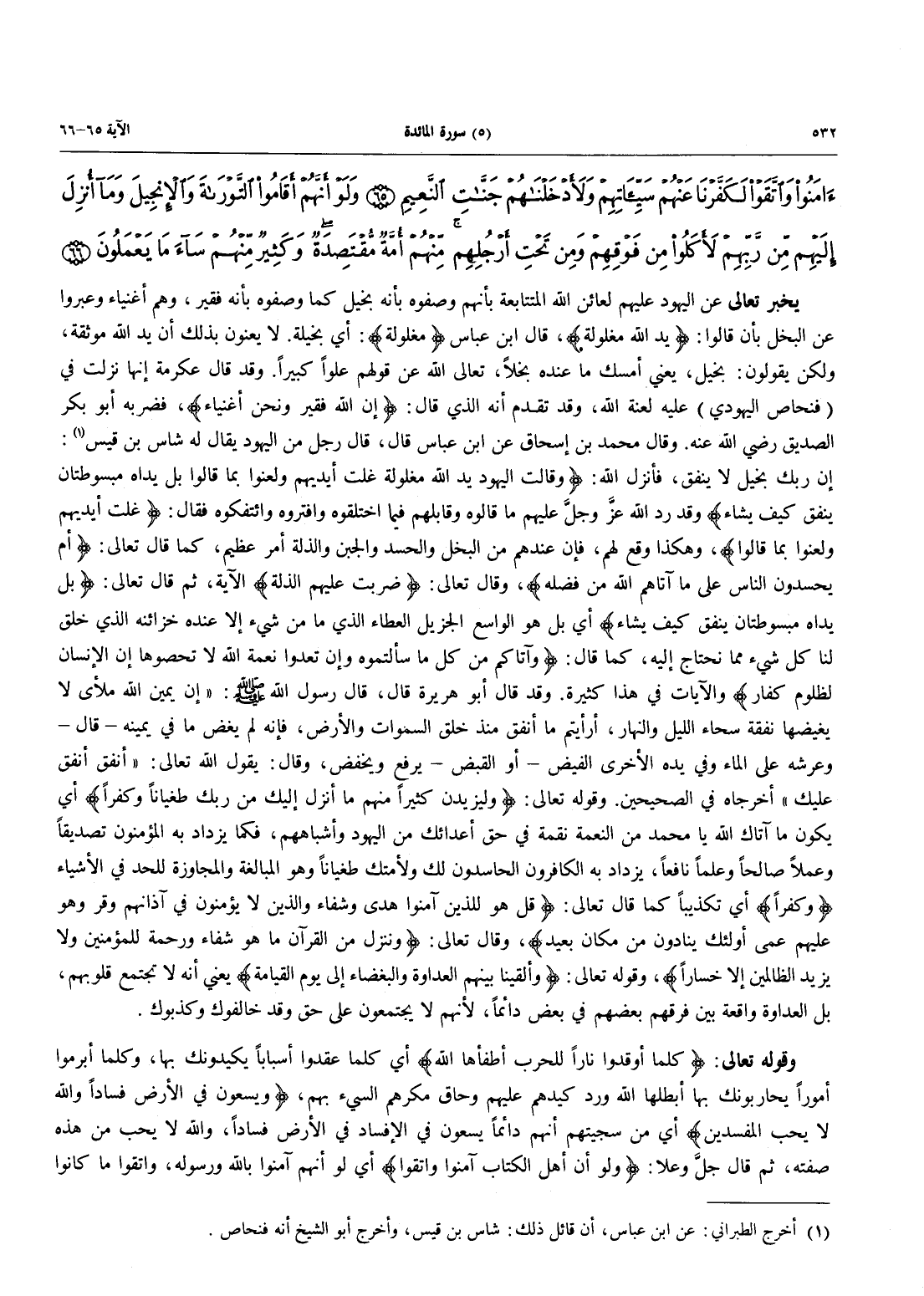 يُخْبِرُ تَعَالَى عَنِ الْيَهُودِ عَلَيْهِمْ لَعَائِنُ اللَّهِ المتتابعة بأنهم وصفوه بِأَنَّهُ بَخِيلٌ كَمَا وَصَفُوهُ بِأَنَّهُ فَقِيرٌ، وَهُمْ أغنياء وعبروا عن البخل بأن قالوا: {يَدُ الله مَغْلُولَةٌ}، قال ابن عباس {مَغْلُولَةٌ} أي بخيلة. لَا يَعْنُونَ بِذَلِكَ أَنَّ يَدَ اللَّهِ مُوثَقَةٌ، ولكن يقولون: بخيل، يعني أمسك ما عنده بخلاً، تعالى الله عن قولهم علواً كبيراً. وَقَدْ قَالَ عِكْرِمَةُ إِنَّهَا نَزَلَتْ فِي (فِنْحَاصَ الْيَهُودِيِّ) عَلَيْهِ لَعْنَةُ اللَّهِ، وَقَدْ تَقَدَّمَ أَنَّهُ الَّذِي قَالَ: {إِنَّ اللَّهَ فَقِيرٌ وَنَحْنُ أَغْنِيَآءُ} فَضَرَبَهُ أَبُو بَكْرٍ الصِّدِّيقُ رَضِيَ اللَّهُ عَنْهُ. وقال محمد بن إسحاق عَنِ ابْنِ عَبَّاسٍ قَالَ، قَالَ رَجُلٌ مِنَ اليهود يقال له شاس بن قيس (أخرج الطبراني: عن ابن عباس، أن قائل ذلك: شاس بن قيس، وأخرج أبو الشيخ أنه فنحاص): إِنَّ رَبَّكَ بَخِيلٌ لَا يُنْفِقُ، فَأَنْزَلَ اللَّهُ: {وَقَالَتِ الْيَهُودُ يَدُ اللَّهِ مَغْلُولَةٌ غُلَّتْ أَيْدِيهِمْ وَلُعِنُواْ بِمَا قَالُواْ بَلْ يَدَاهُ مَبْسُوطَتَانِ يُنفِقُ كَيْفَ يَشَآءُ} وَقَدْ رَدَّ اللَّهُ عزَّ وجلَّ عليهم ما قالوه وقابلهم فيما اختلقوه وافترواه وَائْتَفَكُوهُ فَقَالَ: {غُلَّتْ أَيْدِيهِمْ وَلُعِنُواْ بِمَا قَالُواْ}، وَهَكَذَا وَقَعَ لَهُمْ، فَإِنَّ عِنْدَهُمْ مِنَ الْبُخْلِ وَالْحَسَدِ وَالْجُبْنِ وَالذِّلَّةِ أَمْرٌ عَظِيمٌ، كَمَا قَالَ تعالى: {أَمْ يَحْسُدُونَ النَّاسَ عَلَى مَآ آتَاهُمُ اللَّهُ مِن فَضْلِهِ}، وقال تعالى: {ضُرِبَتْ عليهم الذلة} الآية، ثُمَّ قَالَ تَعَالَى: {بَلْ يَدَاهُ مَبْسُوطَتَانِ يُنفِقُ كَيْفَ يَشَآءُ} أي بل هو الواسع الْجَزِيلُ الْعَطَاءِ الَّذِي مَا مِنْ شَيْءٍ إِلَّا عنده خزائنه الَّذِي خَلَقَ لَنَا كُلَّ شَيْءٍ مِمَّا نَحْتَاجُ إليه، كما قال: {وَآتَاكُم مِّن كُلِّ مَا سَأَلْتُمُوهُ وَإِن تَعُدُّواْ نِعْمَةَ اللَّهِ لاَ تُحْصُوهَا إِنَّ الْإِنْسَانَ لَظَلُومٌ كَفَّارٌ} والآيات في هذا كثيرة. وقد قَالَ أَبُو هُرَيْرَةَ قَالَ، قَالَ رَسُولُ اللَّهِ صَلَّى اللَّهُ عَلَيْهِ وَسَلَّمَ: "إِنَّ يَمِينَ اللَّهِ مَلْأَى لَا يَغِيضُهَا نَفَقَةٌ سَحَّاءُ اللَّيْلِ وَالنَّهَارِ، أَرَأَيْتُمْ مَا أَنْفَقَ مُنْذُ خَلَقَ السَّمَوَاتِ وَالْأَرْضَ، فَإِنَّهُ لَمْ يَغِضْ مَا فِي يَمِينِهِ - قَالَ - وَعَرْشُهُ عَلَى الْمَاءِ وَفِي يَدِهِ الْأُخْرَى الفيض - أو القبض - يرفع ويخفض، وقال: يقول اللَّهُ تَعَالَى: «أَنفق أُنفق عَلَيْكَ» أَخْرَجَاهُ فِي الصحيحين. وقوله تعالى: {وَلَيَزِيدَنَّ كَثِيراً منها مَا أُنْزِلَ إِلَيْكَ مِن رَّبِّكَ طُغْيَاناً وَكُفْراً} أَيْ يَكُونُ مَا أَتَاكَ اللَّهُ يَا مُحَمَّدُ مِنَ النِّعْمَةِ نِقْمَةٌ فِي حَقِّ أَعْدَائِكَ مِنَ الْيَهُودِ وَأَشْبَاهِهِمْ، فَكَمَا يَزْدَادُ بِهِ الْمُؤْمِنُونَ تَصْدِيقًا وعملاً صالحاً وعلماً نافعاً، يزداد به الكافرون الْحَاسِدُونَ لَكَ وَلِأُمَّتِكَ طُغْيَانًا وَهُوَ الْمُبَالَغَةُ وَالْمُجَاوَزَةُ لِلْحَدِّ فِي الْأَشْيَاءِ {وَكُفْراً} أَيْ تَكْذِيبًا كَمَا قَالَ تَعَالَى: {قُلْ هُوَ لِلَّذِينَ آمَنُواْ هُدًى وَشِفَآءٌ وَالَّذِينَ لاَ يُؤْمِنُونَ فِي آذَانِهِمْ وَقْرٌ وَهُوَ عَلَيْهِمْ عَمًى أُولَئِكَ يُنَادَوْنَ مِن مَكَانٍ بعيد} وَقَالَ تَعَالَى: {وَنُنَزِّلُ مِنَ الْقُرْآنِ مَا هُوَ شِفَآءٌ وَرَحْمَةٌ للمؤمنين ولايزيد الظالمين إَلاَّ خَسَاراً} وقوله تعالى: {وَأَلْقَيْنَا بَيْنَهُمُ الْعَدَاوَةَ وَالْبَغْضَاءَ إِلَى يَوْمِ الْقِيَامَةِ} يَعْنِي أَنَّهُ لَا تَجْتَمِعُ قُلُوبُهُمْ، بَلِ الْعَدَاوَةُ وَاقِعَةٌ بَيْنَ فِرَقِهِمْ بَعْضِهِمْ فِي بَعْضٍ دَائِمًا، لِأَنَّهُمْ لَا يَجْتَمِعُونَ عَلَى حَقٍّ وَقَدْ خَا