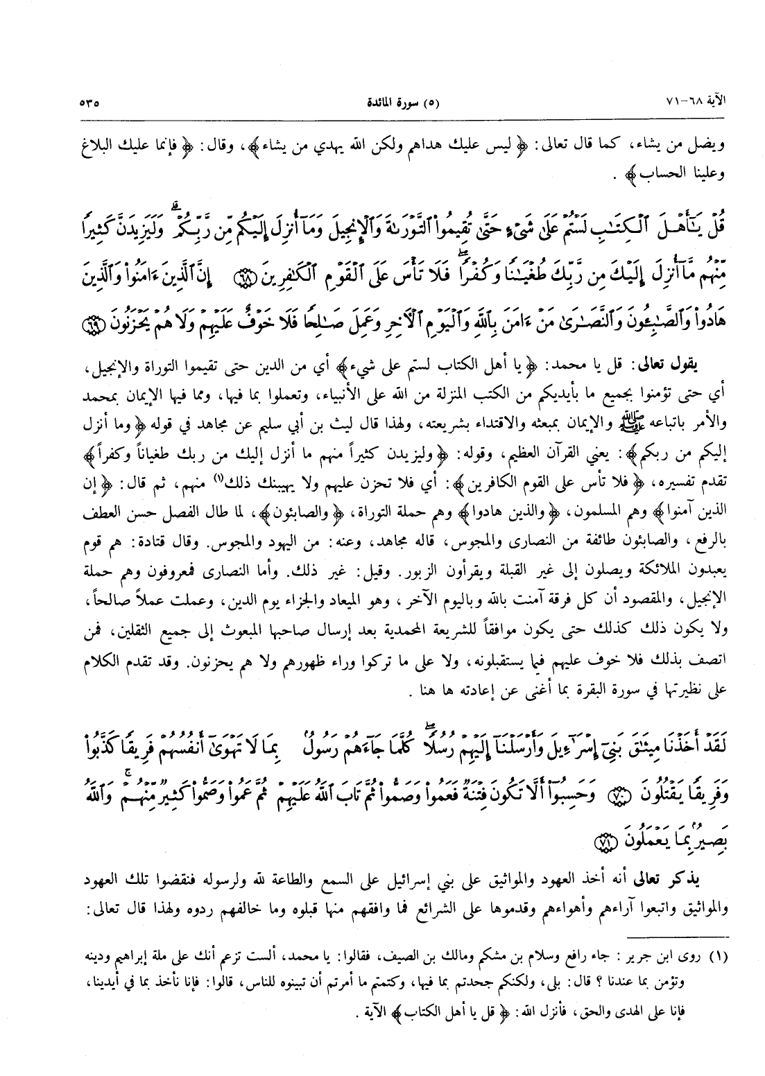 يَقُولُ تَعَالَى: قُلْ يَا مُحَمَّدُ: {يَا أَهْلَ الْكِتَابِ لَسْتُمْ عَلَى شَيْءٍ} أَيْ مِنَ الدِّينِ حَتَّى تُقِيمُوا التَّوْرَاةَ وَالْإِنْجِيلَ، أَيْ حَتَّى تُؤْمِنُوا بِجَمِيعِ مَا بِأَيْدِيكُمْ مِنَ الْكُتُبِ الْمُنَزَّلَةِ مِنَ اللَّهِ عَلَى الْأَنْبِيَاءِ، وَتَعْمَلُوا بِمَا فيها، ومما فيها الإيمان بمحمد والأمر باتباعه صَلَّى اللَّهُ عَلَيْهِ وَسَلَّمَ وَالْإِيمَانِ بِمَبْعَثِهِ وَالِاقْتِدَاءِ بِشَرِيعَتِهِ، وَلِهَذَا قَالَ لَيْثُ بْنُ أَبِي سُلَيْمٍ عَنْ مُجَاهِدٍ فِي قَوْلِهِ {وَمَآ أُنزِلَ إِلَيْكُمْ مِّن رَّبِّكُمْ}: يَعْنِي الْقُرْآنَ الْعَظِيمَ، وَقَوْلُهُ: {وَلَيَزِيدَنَّ كَثِيرًا مِنْهُمْ مَا أُنْزِلَ إِلَيْكَ مِنْ رَّبِّكَ طُغْيَاناً وَكُفْراً} تَقَدَّمَ تَفْسِيرُهُ، {فَلاَ تَأْسَ عَلَى الْقَوْمِ الْكَافِرِينَ}: أَيْ فَلَا تَحْزَنْ عَلَيْهِمْ وَلَا يهيبنك ذلك (روى ابن جرير جاء رافع وسلام بن مشكم ومالك بن الصيف، فقالوا: يا محمد، ألست تزعم أنك على ملة إبراهيم ودينه وتؤمن بما عندنا؟ قال: بلى، ولكنكم جحدتم بما فيها، وكتمتم ما أمرتم أن تبينوه للناس، قالوا: فإنا نأخذ بما في أيدينا فإنا على الهدى والحق فأنزل الله {قُلْ يَا أَهْلَ الكتاب} الآية.) مِنْهُمْ، ثُمَّ قَالَ: {إِنَّ الَّذِينَ آمَنُواْ} وَهُمُ الْمُسْلِمُونَ، {وَالَّذِينَ هَادُواْ} وَهُمْ حَمَلَةُ التَّوْرَاةِ، {وَالصَّابِئُونَ}، لَمَّا طَالَ الْفَصْلُ حَسُنَ الْعَطْفُ بِالرَّفْعِ، وَالصَّابِئُونَ طائفة من النصارى والمجوس، قاله مجاهد، وعنه: من اليهود والمجوس. وَقَالَ قَتَادَةُ: هُمْ قَوْمٌ يَعْبُدُونَ الْمَلَائِكَةَ وَيُصَلُّونَ إلى غير القبلة ويقرأون الزبور. وَقِيلَ: غَيْرُ ذَلِكَ. وَأَمَّا النَّصَارَى فَمَعْرُوفُونَ وَهُمْ حَمَلَةُ الْإِنْجِيلِ، وَالْمَقْصُودُ أَنَّ كُلَّ فِرْقَةٍ آمَنَتْ بالله وباليوم الآخر، وهو الميعاد وَالْجَزَاءُ يَوْمُ الدِّينِ، وَعَمِلَتْ عَمَلاً صَالِحاً، وَلاَ يَكُونُ ذَلِكَ كَذَلِكَ حَتَّى يَكُونَ مُوَافِقًا لِلشَّرِيعَةِ الْمُحَمَّدِيَّةِ بَعْدَ إِرْسَالِ صَاحِبِهَا الْمَبْعُوثِ إِلَى جَمِيعِ الثَّقَلَيْنِ، فَمَنِ اتَّصَفَ بِذَلِكَ فَلاَ خَوْفٌ عَلَيْهِمْ فِيمَا يَسْتَقْبِلُونَهُ، وَلَا عَلَى مَا تَرَكُوا وَرَاءَ ظُهُورِهِمْ وَلاَ هُمْ يَحْزَنُونَ. وَقَدْ تَقَدَّمُ الْكَلَامُ على نظيرتها فِي سُورَةِ الْبَقَرَةِ بِمَا أَغْنَى عَنْ إِعَادَتِهِ ها هنا.