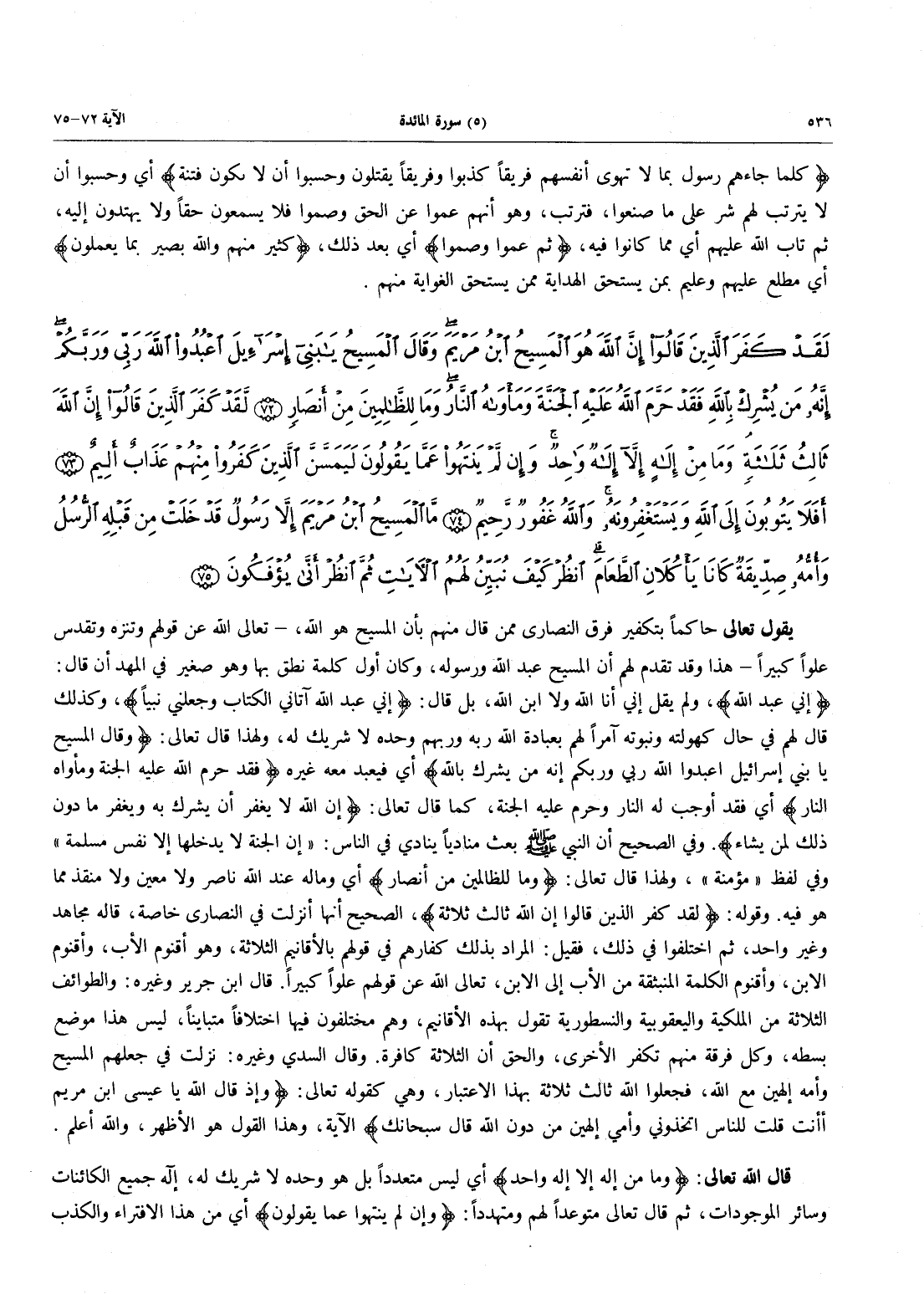 يَقُولُ تَعَالَى حاكماً بتكفير فرق النصارى مِمَّنْ قَالَ مِنْهُمْ بِأَنَّ الْمَسِيحَ هُوَ اللَّهُ، - تَعَالَى اللَّهُ عَنْ قَوْلِهِمْ وَتَنَزَّهَ وَتَقَدَّسَ عُلُوًّا كبيراً - هذا وقد تقدم لهم أن المسيح عَبْدُ اللَّهِ وَرَسُولُهُ، وَكَانَ أَوَّلَ كَلِمَةٍ نَطَقَ بِهَا وَهُوَ صَغِيرٌ فِي الْمَهْدِ أَنْ قَالَ {إِنِّي عَبْدُ الله}، ولم يقل إني أَنَا اللَّهُ وَلَا ابْنُ اللَّهِ، بَلْ قَالَ: {إِنِّي عَبْدُ الّه آتَانِيَ الكتاب وَجَعَلَنِي نبياً}، وكذلك قال لهم في حلا كُهُولَتِهِ وَنَبُّوتِهِ آمِرًا لَهُمْ بِعِبَادَةِ اللَّهِ رَبِّهِ وَرَبِّهِمْ وَحْدَهُ لَا شَرِيكَ لَهُ، وَلِهَذَا قَالَ تَعَالَى: {وَقَالَ الْمَسِيحُ يَا بَنِي إِسْرَائِيلَ اعْبُدُوا اللَّهَ رَبِّي وَرَبَّكُمْ إِنَّهُ مَن يُشْرِكْ بِاللَّهِ} أَيْ فَيَعْبُدُ مَعَهُ غَيْرَهُ {فَقَدْ حَرَّمَ اللَّهُ عَلَيهِ الْجَنَّةَ وَمَأْوَاهُ النَّارُ} أَيْ فَقَدْ أَوْجَبَ لَهُ النَّارَ وَحَرَّمَ عَلَيْهِ الْجَنَّةَ، كَمَا قَالَ تَعَالَى: {إِنَّ اللَّهَ لَا يَغْفِرُ أَنْ يُشْرَكَ بِهِ وَيَغْفِرُ مَا دُونَ ذَلِكَ لِمَن يَشَاءُ} وفي الصَّحِيحِ أَنَّ النَّبِيَّ صَلَّى اللَّهُ عَلَيْهِ وَسَلَّمَ بَعَثَ مُنَادِيًا يُنَادِي فِي النَّاسِ: «إِنَّ الْجَنَّةَ لَا يَدْخُلُهَا إِلَّا نَفْسٌ مُسْلِمَةٌ» وَفِي لَفْظٍ «مؤمنة» ولهذا قال تعالى: {وَمَا لِلظَّالِمِينَ مِنْ أنصار} أي وماله عِنْدَ اللَّهِ نَاصِرٌ وَلَا مُعِينٌ وَلَا مُنْقِذٌ مِمَّا هُوَ فِيهِ. وَقَوْلُهُ: {لَّقَدْ كَفَرَ الَّذِينَ قَالُوا إِنَّ اللَّهَ ثَالِثُ ثَلاَثَةٍ} الصحيح أَنَّهَا أُنْزِلَتْ فِي النَّصَارَى خَاصَّةً قَالَهُ مُجَاهِدٌ وَغَيْرُ وَاحِدٍ، ثُمَّ اخْتَلَفُوا فِي ذَلِكَ، فَقِيلَ: الْمُرَادُ بِذَلِكَ كُفَّارُهُمْ فِي قَوْلِهِمْ بِالْأَقَانِيمِ الثَّلَاثَةِ، وَهُوَ أُقْنُومُ الْأَبِ، وَأُقْنُومُ الِابْنِ، وَأُقْنُومُ الْكَلِمَةِ الْمُنْبَثِقَةِ مِنَ الْأَبِ إِلَى الِابْنِ، تَعَالَى اللَّهُ عَنْ قَوْلِهِمْ عُلُوًّا كَبِيرًا. قَالَ ابْنُ جَرِيرٍ وغيره: والطوائف الثلاثة مِنَ الْمَلَكِيَّةِ وَالْيَعْقُوبِيَّةِ وَالنُّسْطُورِيَّةِ تَقُولُ بِهَذِهِ الْأَقَانِيمِ، وَهُمْ مُخْتَلِفُونَ فِيهَا اخْتِلَافًا مُتَبَايِنًا، لَيْسَ هَذَا مَوْضِعُ بَسْطِهِ، وَكُلُّ فِرْقَةٍ مِنْهُمْ تُكَفِّرُ الْأُخْرَى، والحق أن الثلاثة كَافِرَةٌ. وَقَالَ السُّدِّيُّ وَغَيْرُهُ: نَزَلَتْ فِي جَعْلِهِمُ الْمَسِيحَ وَأُمَّهُ إِلَهَيْنِ مَعَ اللَّهِ، فَجَعَلُوا اللَّهَ ثالث ثلاثة بهذا الاعتبار، وهي كقوله تَعَالَى: {وَإِذْ قَالَ اللَّهُ يَا عِيسَى ابْنَ مَرْيَمَ أَأَنتَ قُلتَ لِلنَّاسِ اتَّخِذُونِي وَأُمِّيَ إِلَهَيْنِ مِنْ دون الله قال سبحانك} الآية، وَهَذَا الْقَوْلُ هُوَ الْأَظْهَرُ، وَاللَّهُ أَعْلَمُ.
