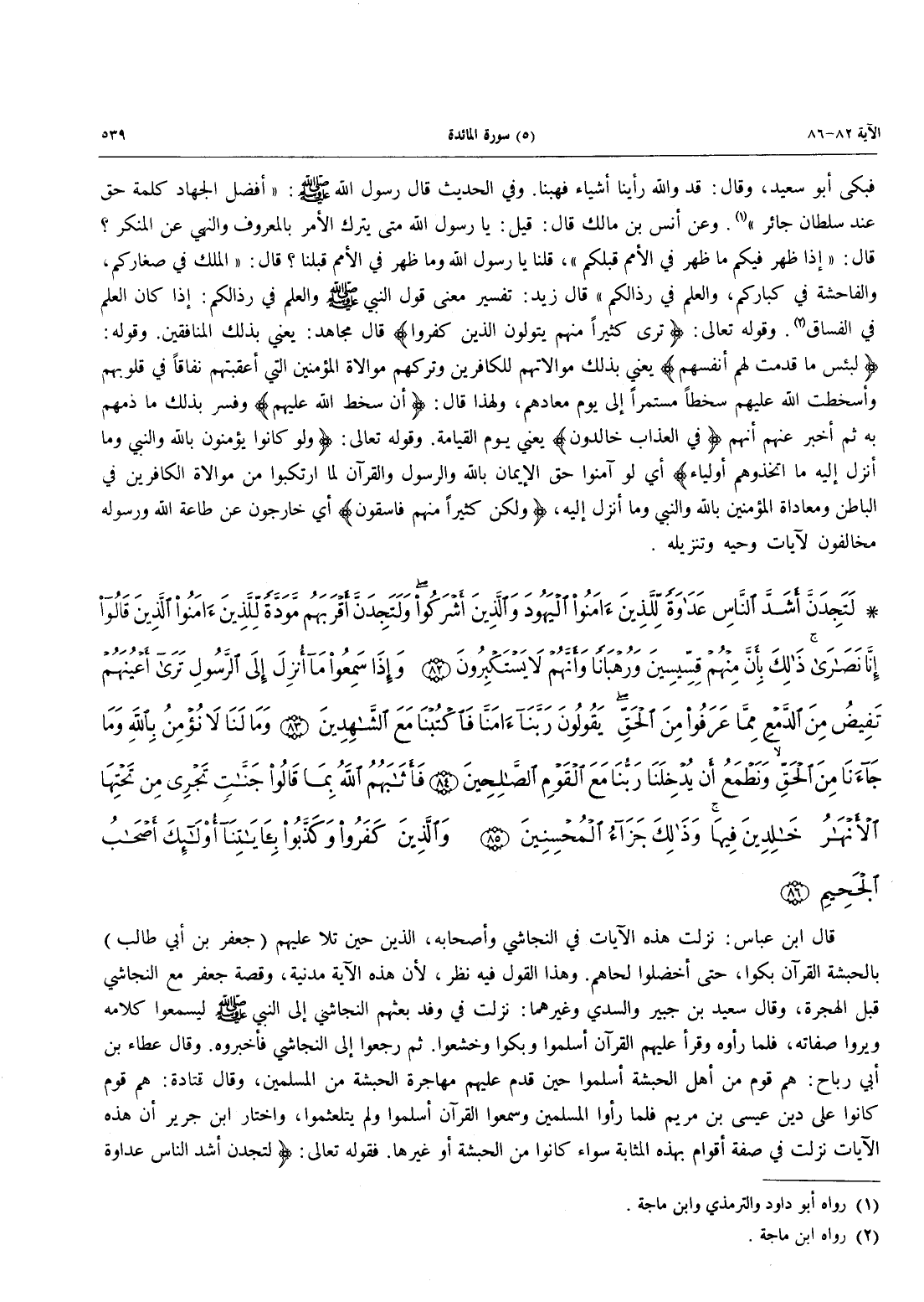 فَبَكَى أَبُو سَعِيدٍ، وَقَالَ: قَدْ وَاللَّهِ رَأَيْنَا أشياء فهبنا، وفي الحديث قَالَ رَسُولُ اللَّهِ صَلَّى اللَّهُ عَلَيْهِ وَسَلَّمَ: «أَفْضَلُ الْجِهَادِ كَلِمَةُ حَقٍّ عِنْدَ سُلْطَانٍ جَائِرٍ» (رواه أبو داود والترمذي وابن ماجة) وعن أَنَسِ بْنِ مَالِكٍ قَالَ: قِيلَ: يَا رَسُولَ اللَّهِ مَتَى يُتْرَكُ الْأَمْرُ بِالْمَعْرُوفِ وَالنَّهْيُ عَنِ الْمُنْكَرِ؟ قَالَ: «إِذَا ظَهَرَ فِيكُمْ مَا ظَهَرَ فِي الْأُمَمِ قَبْلَكُمْ» قُلْنَا يَا رَسُولَ اللَّهِ وَمَا ظَهَرَ فِي الْأُمَمِ قَبْلَنَا؟ قَالَ: «الْمُلْكُ فِي صِغَارِكُمْ، وَالْفَاحِشَةُ فِي كِبَارِكُمْ، وَالْعِلْمُ فِي رُذَالِكُمْ» قَالَ زَيْدٌ: تَفْسِيرُ مَعْنَى قَوْلِ النَّبِيِّ صَلَّى اللَّهُ عَلَيْهِ وَسَلَّمَ وَالْعِلْمُ فِي رُذَالِكُمْ: إذا كان العلم في الفساق (رواه ابن ماجة) وقوله تعالى: {تَرَى كَثِيراً مِّنْهُمْ يَتَوَلَّوْنَ الَّذِينَ كَفَرُواْ} قَالَ مُجَاهِدٌ: يَعْنِي بِذَلِكَ الْمُنَافِقِينَ. وَقَوْلُهُ: {لَبِئْسَ مَا قَدَّمَتْ لَهُمْ أَنفُسُهُمْ} يَعْنِي بِذَلِكَ مُوَالَاتِهِمْ لِلْكَافِرِينَ وَتَرْكَهُمْ مُوَالَاةَ الْمُؤْمِنِينَ الَّتِي أَعَقَبَتْهُمْ نِفَاقًا فِي قُلُوبِهِمْ وَأَسْخَطَتِ اللَّهَ عَلَيْهِمْ سُخْطًا مُسْتَمِرًّا إِلَى يَوْمِ مَعَادِهِمْ، وَلِهَذَا قَالَ: {إِنْ سَخِطَ اللَّهُ عَلَيْهِمْ} وفسر بذلك ما ذمهم به ثم أخبر عنهم أنهم {في العذاب خَالِدُونَ} يعني يوم القيامة. وقوله تَعَالَى: {وَلَوْ كَانُوا يُؤْمِنُونَ بِاللَّهِ وَالنَّبِيِّ وَمَا أُنْزِلَ إِلَيْهِ مَا اتَّخَذُوهُمْ أَوْلِيَآءَ} أَيْ لَوْ آمنوا حق الإيمان بالله والرسول والقرآن لما ارتكبوا في مُوَالَاةِ الْكَافِرِينَ فِي الْبَاطِنِ وَمُعَادَاةِ الْمُؤْمِنِينَ بِاللَّهِ والنبي وما أنزل إليه، {ولمن كَثِيراً مِّنْهُمْ فَاسِقُونَ} أَيْ خَارِجُونَ عَنْ طَاعَةِ اللَّهِ وَرَسُولِهِ مُخَالِفُونَ لِآيَاتِ وَحْيِهِ وَتَنْزِيلِهِ.
