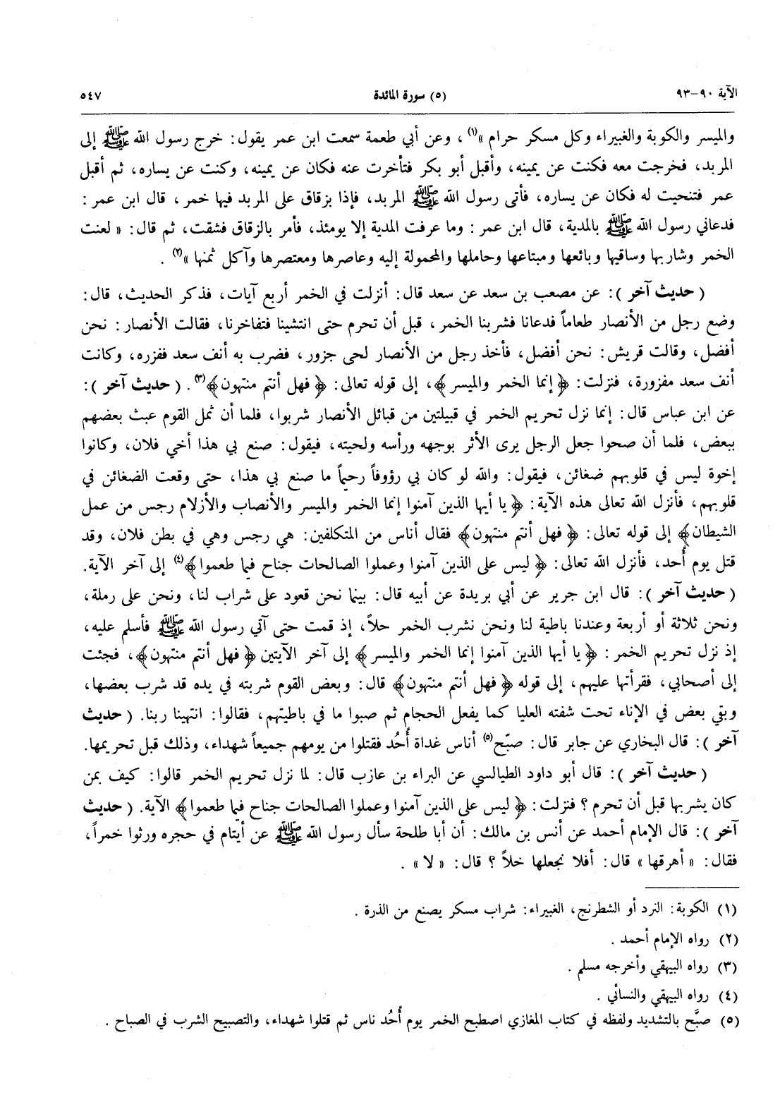 (حديث آخر) عَنْ مُصْعَبِ بْنِ سَعْدٍ عَنْ سَعْدٍ قَالَ: أنزل فِي الْخَمْرِ أَرْبَعُ آيَاتٍ، فَذَكَرَ الْحَدِيثَ، قَالَ: وضع رجل من الأنصار طعاماً فدعانها فَشَرِبْنَا الْخَمْرَ، قَبْلَ أَنْ تَحْرُمَ حَتَّى انْتَشَيْنَا فَتَفَاخَرْنَا، فَقَالَتِ الْأَنْصَارُ: نَحْنُ أَفْضَلُ، وَقَالَتْ قُرَيْشٌ: نَحْنُ أَفْضَلُ، فَأَخَذَ رَجُلٌ مِنَ الْأَنْصَارِ لَحْيَ جزور، فضرب به أنف سعد ففزره، وكانت أنف سعد مفزورة، فنزلت: {إِنَّمَا الخمر والميسر}، إلى قوله تعالى: {فَهَلْ أَنْتُمْ مُّنتَهُونَ} (رواه البيهقي وأخرجه مسلم) (حديث آخر): عَنِ ابْنِ عَبَّاسٍ قَالَ: إِنَّمَا نَزَلَ تَحْرِيمُ الْخَمْرِ فِي قَبِيلَتَيْنِ مِنْ قَبَائِلِ الْأَنْصَارِ شَرِبُوا، فَلَمَّا أَنْ ثَمِلَ الْقَوْمُ عَبِثَ بَعْضُهُمْ بِبَعْضٍ، فَلَمَّا أَنَّ صَحُوا جَعَلَ الرَّجُلُ يُرَى الْأَثَرَ بوجهه ورأسه ولحيته، فيقول: صنع بي هذا أَخِي فُلَانٌ، وَكَانُوا إِخْوَةً لَيْسَ فِي قُلُوبِهِمْ ضغائن، فيقول: وَاللَّهِ لَوْ كَانَ بِي رَؤُوفًا رَحِيمًا مَا صنع بي هذا، حَتَّى وَقَعَتِ الضَّغَائِنُ فِي قُلُوبِهِمْ، فَأَنْزَلَ اللَّهُ تعالى هَذِهِ الْآيَةَ: {يَا أَيُّهَا الَّذِينَ آمَنُوا إِنَّمَا الْخَمْرُ وَالْمَيْسِرُ وَالْأَنْصَابُ وَالْأَزْلَامُ رِجْسٌ مِّنْ عَمَلِ الشيطان} إلى قوله تعالى: {فَهَلْ أَنْتُمْ مُّنتَهُونَ} فقال أناس مِنَ الْمُتَكَلِّفِينَ: هِيَ رِجْسٌ وَهِيَ فِي بَطْنِ فُلَانٍ، وَقَدْ قُتِلَ يَوْمَ أُحد، فَأَنْزَلَ اللَّهُ تَعَالَى: {لَيْسَ عَلَى الَّذِينَ آمَنُواْ وَعَمِلُوا الصَّالِحَاتِ جُنَاحٌ فِيمَا طعموا} (رواه البيهقي والنسائي) إلى آخر الآية.