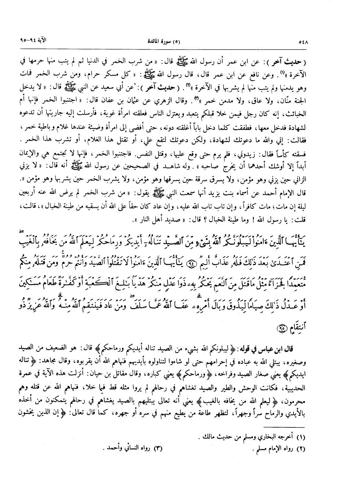 - 95 - يَا أَيُّهَا الَّذِينَ آمَنُواْ لاَ تَقْتُلُواْ الصَّيْدَ وَأَنْتُمْ حُرُمٌ وَمَن قَتَلَهُ مِنكُم مُّتَعَمِّداً فَجَزَآءٌ مِّثْلُ مَا قَتَلَ مِنَ النَّعَمِ يَحْكُمُ بِهِ ذَوَا عَدْلٍ مِّنْكُمْ هَدْياً بَالِغَ الْكَعْبَةِ أَوْ كَفَّارَةٌ طَعَامُ مَسَاكِينَ أَو عَدْلُ ذَلِكَ صِيَامًا لِّيَذُوقَ وَبَالَ أَمْرِهِ عَفَا اللَّهُ عَمَّا سَلَف وَمَنْ عَادَ فَيَنْتَقِمُ اللَّهُ مِنْهُ وَاللَّهُ عَزِيزٌ ذُو انْتِقَامٍ