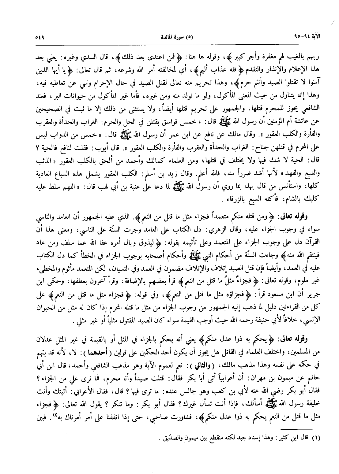 رَبَّهُم بالغيب لَهُم مَّغْفِرَةٌ وَأَجْرٌ كَبِيرٌ} وقوله ها هنا: {فَمَنِ اعْتَدَى بَعْدَ ذَلِكَ}، قَالَ السُّدِّيُّ وَغَيْرُهُ: يَعْنِي بَعْدَ هَذَا الْإِعْلَامِ وَالْإِنْذَارِ وَالتَّقَدُّمِ {فَلَهُ عَذَابٌ أَلِيمٌ}، أَيْ لِمُخَالَفَتِهِ أَمْرَ اللَّهِ وَشَرْعَهُ، ثُمَّ قَالَ تَعَالَى: {يَا أَيُّهَا الَّذِينَ آمَنُواْ لاَ تَقْتُلُواْ الصَّيْدَ وَأَنْتُمْ حُرُمٌ}، وَهَذَا تَحْرِيمٌ مِنْهُ تَعَالَى لِقَتْلِ الصَّيْدِ فِي حَالِ الْإِحْرَامِ وَنُهِيَ عَنْ تَعَاطِيهِ فِيهِ، وَهَذَا إِنَّمَا يَتَنَاوَلُ من حيث المعنى المأكول، ولو ما تولد مِنْهُ وَمِنْ غَيْرِهِ، فَأَمَّا غَيْرُ الْمَأْكُولِ مِنْ حَيَوَانَاتِ الْبَرِّ، فَعِنْدَ الشَّافِعِيِّ يَجُوزُ لِلْمُحْرِمِ قَتْلُهَا، وَالْجُمْهُورُ عَلَى تَحْرِيمِ قَتْلِهَا أَيْضًا، وَلَا يُسْتَثْنَى مِنْ ذَلِكَ إِلَّا مَا ثَبَتَ فِي الصَّحِيحَيْنِ عَنْ عَائِشَةَ أُمِّ الْمُؤْمِنِينَ أَنَّ رَسُولَ اللَّهِ صَلَّى اللَّهُ عَلَيْهِ وَسَلَّمَ قَالَ: "خَمْسُ فَوَاسَقَ يُقْتَلْنَ فِي الْحِلِّ وَالْحَرَمِ: الْغُرَابُ وَالْحِدَأَةُ وَالْعَقْرَبُ وَالْفَأْرَةُ وَالْكَلْبُ الْعَقُورُ" وَقَالَ مَالِكٌ عَنْ نَافِعٍ عَنِ ابْنِ عُمَرَ أَنَّ رَسُولَ اللَّهِ صَلَّى اللَّهُ عَلَيْهِ وَسَلَّمَ قَالَ: "خَمْسٌ مِنَ الدَّوَابِّ لَيْسَ عَلَى الْمُحْرِمِ فِي قَتْلِهِنَّ جُنَاحٌ: الْغُرَابُ والحدأة والفأرة والكلب العقور". قال أيوب: فقلت لِنَافِعٍ فَالْحَيَّةُ؟ قَالَ: الْحَيَّةُ لَا شَكَّ فِيهَا وَلَا يُخْتَلَفُ فِي قَتْلِهَا؛ وَمِنَ الْعُلَمَاءِ كَمَالِكٍ وَأَحْمَدَ مَنْ أَلْحَقَ بِالْكَلْبِ الْعَقُورِ «الذِّئْبَ وَالسَّبُعَ وَالْفَهْدَ» لِأَنَّهَا أَشَدُّ ضَرَرًا مِنْهُ، فَاللَّهُ أَعْلَمُ. وقال زيد بْنُ أَسْلَمَ: الْكَلْبُ الْعَقُورُ يَشْمَلُ هَذِهِ السِّبَاعَ الْعَادِيَةَ كُلَّهَا، وَاسْتَأْنَسَ مَنْ قَالَ بِهَذَا بِمَا رُوِيَ أَنَّ رَسُولَ اللَّهِ صَلَّى اللَّهُ عَلَيْهِ وَسَلَّمَ لَمَّا دَعَا عَلَى عُتْبَةَ بْنِ أَبِي لَهَبٍ قَالَ: "اللَّهُمَّ سَلِّطْ عَلَيْهِ كَلْبَكَ بِالشَّامِ، فأكله السبع بالزرقاء.