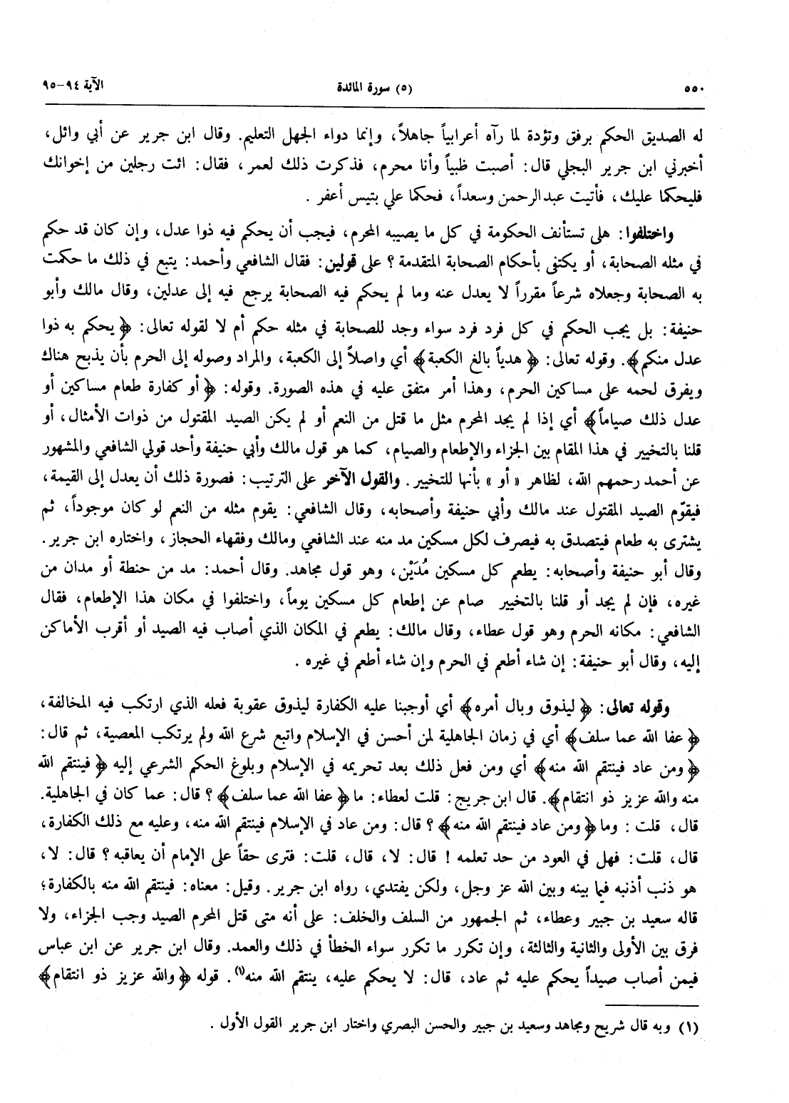 لَهُ الصِّدِّيقُ الْحُكْمَ بِرِفْقٍ وَتُؤَدَةٍ لَمَّا رَآهُ أعرابياً جاهلاً، وإنما دواء الجهل التعليم. وقال ابن جرير عن أبي وائل، أخبرني ابن جَرِيرٍ الْبَجَلِيُّ قَالَ: أَصَبْتُ ظَبْيًا وَأَنَا مُحْرِمٌ، فَذَكَرْتُ ذَلِكَ لِعُمَرَ، فَقَالَ: ائْتِ رَجُلَيْنِ مِنْ إِخْوَانِكَ فَلْيَحْكُمَا عَلَيْكَ، فَأَتَيْتُ عَبْدَ الرَّحْمَنِ وَسَعْدًا، فحكما علي بتيس أعفر.