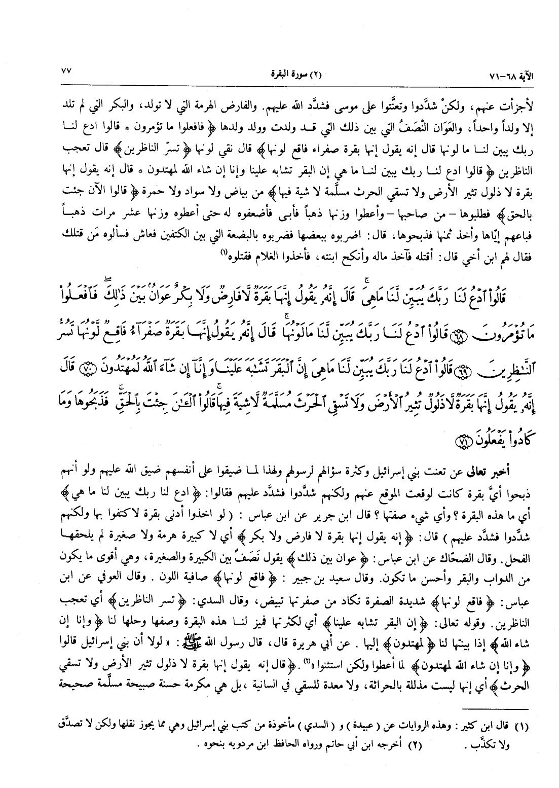أَخْبَرَ تَعَالَى عَنْ تَعَنُّتِ بَنِي إِسْرَائِيلَ وَكَثْرَةِ سُؤَالِهِمْ لِرَسُولِهِمْ ولهذا لما ضيقوا على أنفسهم ضيق الله عَلَيْهِمْ وَلَوْ أَنَّهُمْ ذَبَحُوا أيَّ بَقَرَةٍ كَانَتْ لوقعت الموقع عنهم وَلَكِنَّهُمْ شدَّدوا فشدَّد عَلَيْهِمْ فَقَالُوا {ادْعُ لَنَا رَبَّكَ يُبَيِّن لَّنَا مَا هِيَ} أي ما هذه البقرة؟ وأي شي صفتها؟ قال ابن جرير عن ابن عباس: (لو أخذوا أدنى بقرة لاكتفوا بها ولكنهم شدَّدوا فشدَّد عليهم) قَالَ: {إِنَّهُ يَقُولُ إِنَّهَا بَقَرَةٌ لاَّ فَارِضٌ وَلاَ بِكْرٌ} أَيْ لَا كَبِيرَةً هَرِمَةً وَلَا صغيرة لم يلحقها الفحل. وَقَالَ الضَّحَّاكُ عَنِ ابْنِ عَبَّاسٍ: {عَوَانٌ بَيْنَ ذَلِكَ} يَقُولُ نَصَفٌ بَيْنَ الْكَبِيرَةِ وَالصَّغِيرَةِ، وَهِيَ أَقْوَى مَا يَكُونُ مِنَ الدَّوَابِّ وَالْبَقَرِ وَأَحْسَنُ ما تكون. وقال سعيد بن جبير: {فَاقِعٌ لَّوْنُهَا} صافية اللون. وقال العوفي عَنِ ابْنِ عَبَّاسٍ: {فَاقِعٌ لَّوْنُهَا} شَدِيدَةُ الصُّفْرَةِ تَكَادُ مِنْ صُفْرَتِهَا تَبْيَضُّ، وَقَالَ السُّدِّيُّ: {تَسُرُّ الناظرين} أي تعجب الناظرين. وقوله تعالى: {إِنَّ الْبَقَرَ تَشَابَهَ عَلَيْنَا} أَيْ لِكَثْرَتِهَا فَمَيِّزْ لَنَا هَذِهِ الْبَقَرَةَ وَصِفْهَا وَحِلَّهَا لَنَا {وَإِنَّآ إِن شَآءَ اللَّهُ} إِذَا بَيَّنْتَهَا لَنَا {لَمُهْتَدُونَ} إليها عَنْ أَبِي هُرَيْرَةَ قَالَ، قَالَ رَسُولُ اللَّهِ صَلَّى اللَّهُ عَلَيْهِ وَسَلَّمَ: «لَوْلَا أَنَّ بَنِي إِسْرَائِيلَ قَالُوا {وَإِنَّآ إِنْ شَاءَ اللَّهُ لَمُهْتَدُونَ} لما أعطوا ولكن استثنوا» (أخرجه ابن أبي حاتم ورواه الحافظ ابن مردويه بنحوه) {قَالَ إِنَّهُ يَقُولُ إِنَّهَا بَقَرَةٌ لاَّ ذَلُولٌ تُثِيرُ الْأَرْضَ وَلَا تَسْقِي الْحَرْثَ} أَيْ إِنَّهَا لَيْسَتْ مُذَلَّلَةً بِالْحِرَاثَةِ، وَلَا مُعَدَّةَ لِلسَّقْيِ فِي السَّانِيَةِ، بَلْ هِيَ مُكَرَّمَةٌ حَسَنَةٌ صَبِيحَةٌ مسلَّمة صَحِيحَةٌ -[78]- لَا عَيْبَ فِيهَا {لاَّ شِيَةَ فِيهَا} أَيْ لَيْسَ فِيهَا لَوْنٌ غَيْرُ لَوْنِهَا وَقَالَ قتادة {مسلَّمة} يقول: لا عيب فيها {لاَّ شِيَةَ فِيهَا} لونها واحد بهيم قاله عطاء {قَالُواْ الْآنَ جِئْتَ بِالْحَقِّ} قَالَ قَتَادَةُ: الْآنَ بينت لنا، {فَذَبَحُوهَا وَمَا كَادُواْ يَفْعَلُونَ} قَالَ الضَّحَّاكُ عَنِ ابن عباس: كادوا أن لا يَفْعَلُوا - وَلَمْ يَكُنْ ذَلِكَ الذِي أَرَادُوا - لِأَنَّهُمْ أرادوا أن لا يَذْبَحُوهَا، يَعْنِي أَنَّهُمْ مَعَ هَذَا الْبَيَانِ وَهَذِهِ الأسئلة والإضاح مَا ذَبَحُوهَا إِلَّا بَعْدَ الْجُهْدِ، وَفِي هَذَا ذَمٌّ لَهُمْ وَذَلِكَ أَنَّهُ لَمْ يَكُنْ غَرَضُهُمْ إلا التعنت فلهذا ما كادوا يذبحونها. قال ابن جرير: لَمْ يَكَادُوا أَنْ يَفْعَلُوا ذَلِكَ خَوْفَ الْفَضِيحَةِ إِنِ اطَّلَعَ اللَّهُ عَلَى قَاتِلِ الْقَتِيلِ الذِي اختصموا فيه ثُمَّ اخْتَارَ أَنَّ الصَّوَابَ فِي ذَلِكَ أَنَّهُمْ لَمْ يَكَادُوا يَفْعَلُوا ذَلِكَ لِغَلَاءِ ثَمَنِهَا وَلِلْفَضِيحَةِ.