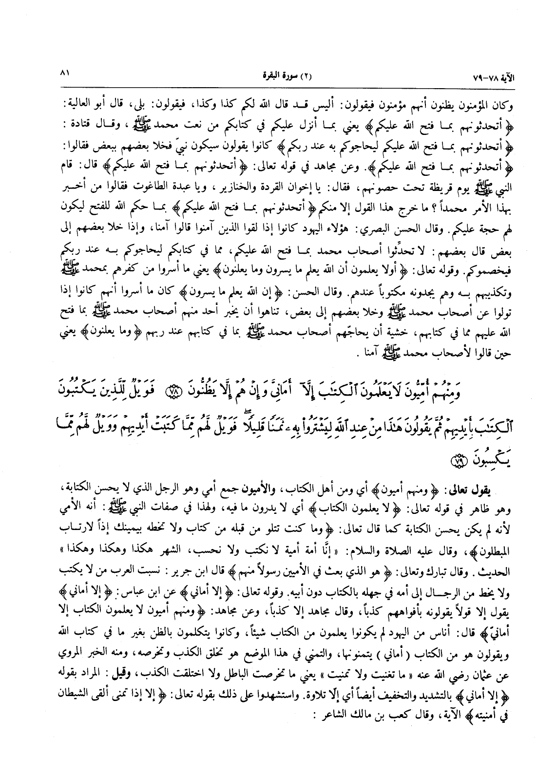 يَقُولُ تَعَالَى: {وَمِنْهُمْ أُمِّيُّونَ} أَيْ وَمِنْ أَهْلِ الكتاب، وَالْأُمِّيُّونَ جَمْعُ أُمِّيٍّ وَهُوَ الرَّجُلُ الذِي لَا يحسن الكتابة، وَهُوَ ظَاهِرٌ فِي قَوْلِهِ تَعَالَى: {لاَ يَعْلَمُونَ الكتاب} أَيْ لَا يَدْرُونَ مَا فِيهِ، وَلِهَذَا فِي صِفَاتِ النَّبِيِّ صَلَّى اللَّهُ عَلَيْهِ وَسَلَّمَ: أَنَّهُ الأمي لِأَنَّهُ لَمْ يَكُنْ يُحْسِنُ الْكِتَابَةَ كَمَا قَالَ تَعَالَى: {وَمَا كُنتَ تَتْلُو مِن قَبْلِهِ مِنَ كِتَابٍ وَلاَ تَخُطُّهُ بِيَمِينِكَ إِذاً لاَّرْتَابَ الْمُبْطِلُونَ}، وَقَالَ عَلَيْهِ الصَّلَاةُ وَالسَّلَامُ: «إِنَّا أُمَّةٌ أُمِّيَّةٌ لَا نَكْتُبُ وَلَا نَحْسُبُ الشَّهْرُ هَكَذَا وَهَكَذَا وهكذا» الحديث. وقال تبارك وتعالى: {هُوَ الذِي بَعَثَ فِي الْأُمِّيِّينَ رَسُولاً مِّنْهُمْ} قال ابْنُ جَرِيرٍ: نَسَبَتِ الْعَرَبُ مَنْ لَا يَكْتُبُ وَلَا يَخُطُّ مِنَ الرِّجَالِ إِلَى أُمِّهِ فِي جهله بالكتاب دون أبيه. وقوله تعالى: {إِلاَّ أَمَانِيَّ} عن ابن عباس: {إِلاَّ أَمَانِيَّ} يَقُولُ إِلَّا قَوْلًا يَقُولُونَهُ بِأَفْوَاهِهِمْ كذباً، وقال مجاهد إلاّ كذباً، وعن مُجَاهِدٍ: {وَمِنْهُمْ أُمِّيُّونَ لاَ يَعْلَمُونَ الْكِتَابَ إِلاَّ أَمَانِيَّ} قال: أناس من اليهود لَمْ يَكُونُوا يَعْلَمُونَ مِنَ الْكِتَابِ شَيْئًا، وَكَانُوا يَتَكَلَّمُونَ بِالظَّنِّ بِغَيْرِ مَا فِي كِتَابِ اللَّهِ ويقولون هو من الكتاب (أماني) يتمنونها، وَالتَّمَنِّي فِي هَذَا الْمَوْضِعِ هُوَ تَخَلُّقُ الْكَذِبِ وتخرصه، ومنه الخبر المروي عن عثمان رَضِيَ اللَّهُ عَنْهُ «مَا تَغَنَّيْتُ وَلَا تَمَنَّيْتُ» يَعْنِي مَا تَخَرَّصْتُ الْبَاطِلَ وَلَا اخْتَلَقْتُ الْكَذِبَ، وقيل: المراد بقوله {إِلاَّ أَمَانِيَّ} بالتشديد والتخفيف أيضاً أي إلاّ تلاوة. واستشهدوا على ذلك بقوله تعالى: {إِذَا تمنى أَلْقَى الشيطان في أُمْنِيَّتِهِ} الآية، وقال كعب بن مالك الشاعر: