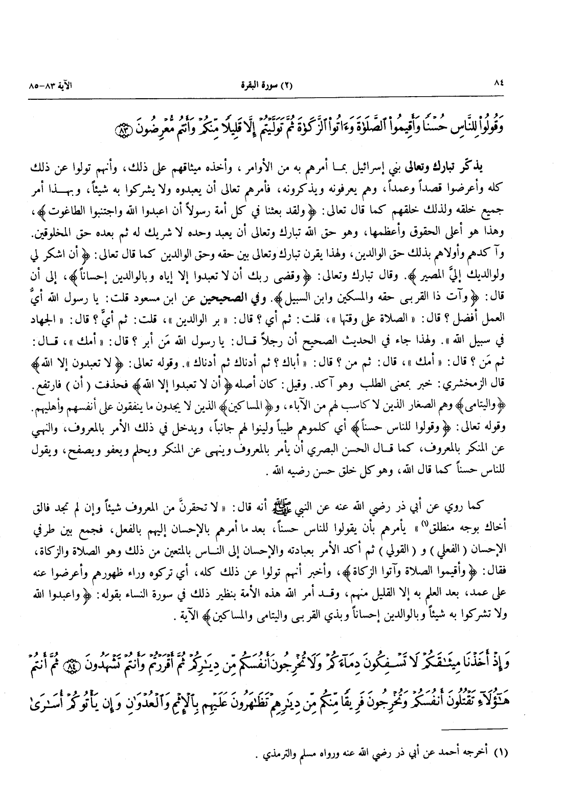 - 84 - وَإِذْ أَخَذْنَا مِيثَاقَكُمْ لاَ تَسْفِكُونَ دِمَآءَكُمْ وَلاَ تُخْرِجُونَ أَنْفُسَكُمْ مِنْ دِيَارِكُمْ ثُمَّ أَقْرَرْتُمْ وَأَنْتُمْ تَشْهَدُونَ