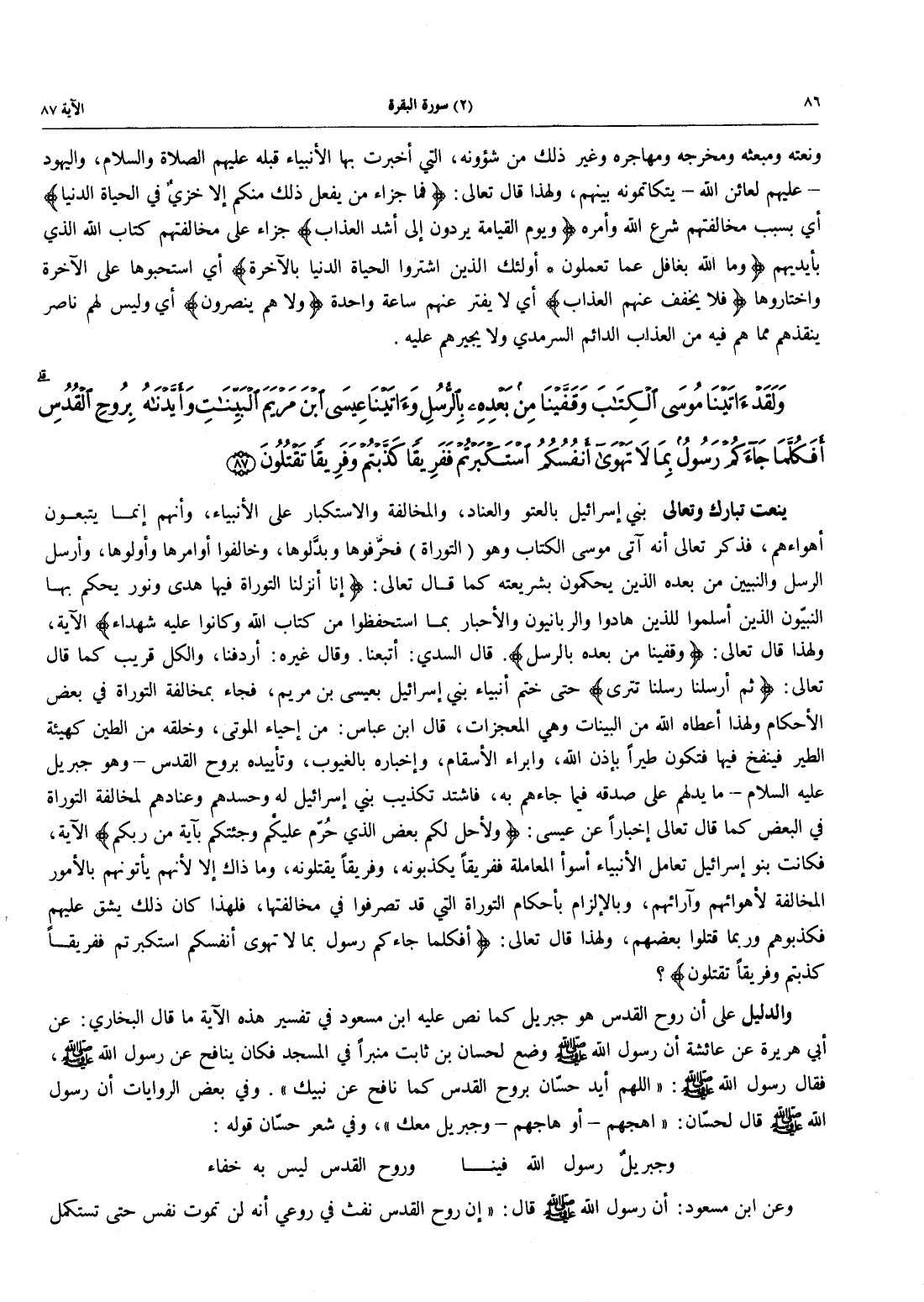 - 87 - وَلَقَدْ آتَيْنَا مُوسَى الْكِتَابَ وَقَفَّيْنَا مِن بَعْدِهِ بِالرُّسُلِ وَآتَيْنَا عِيسَى ابْنَ مَرْيَمَ الْبَيِّنَاتِ وَأَيَّدْنَاهُ بِرُوحِ الْقُدُسِ أَفَكُلَّمَا جَآءَكُمْ رَسُولٌ بِمَا لاَ تَهْوَى أَنْفُسُكُمْ اسْتَكْبَرْتُمْ فَفَرِيقاً كَذَّبْتُمْ وَفَرِيقاً تَقْتُلُونَ