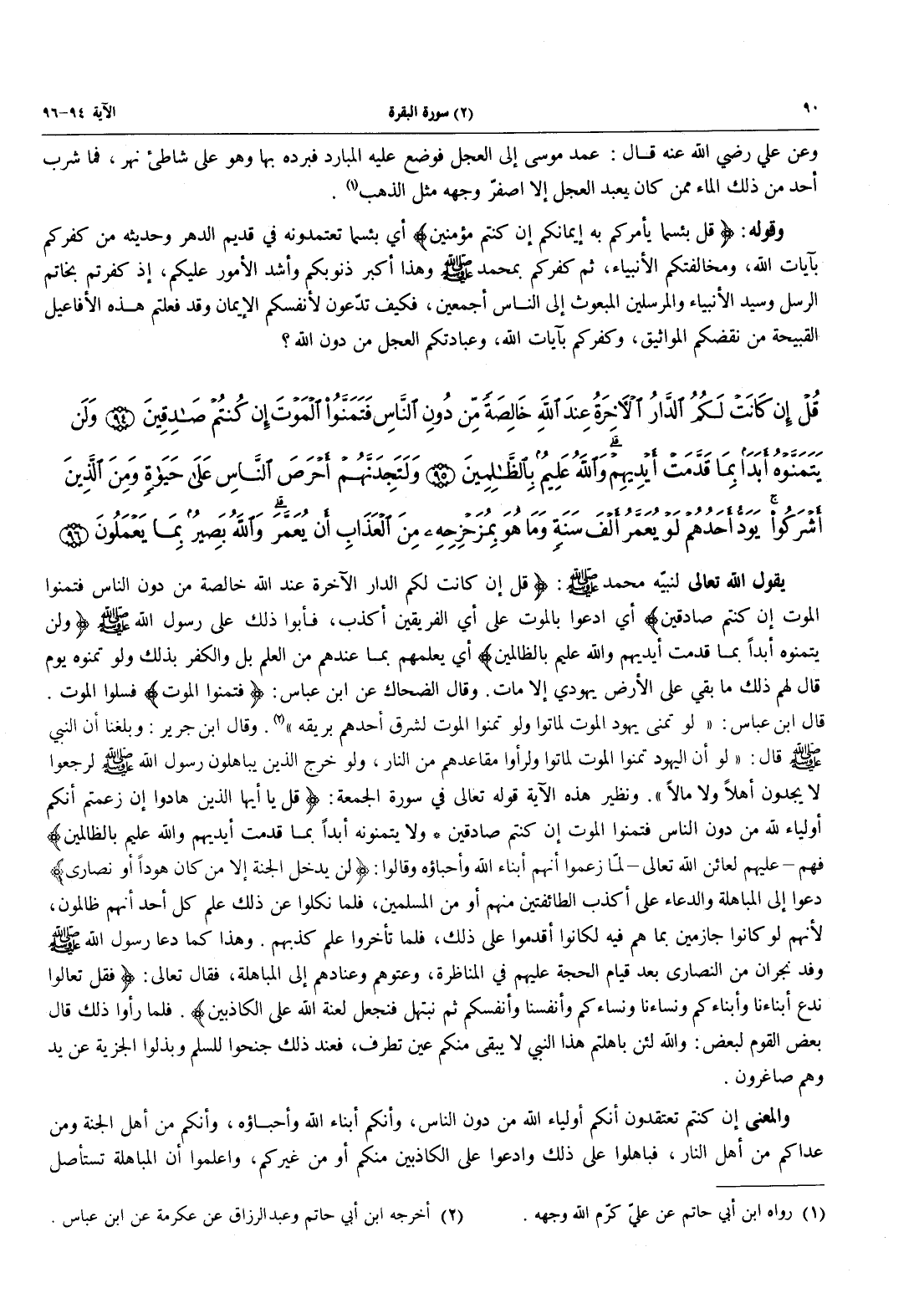 والمعنى إِنْ كُنْتُمْ تَعْتَقِدُونَ أَنَّكُمْ أَوْلِيَاءُ اللَّهِ مَنْ دُونِ النَّاسِ وَأَنَّكُمْ أَبْنَاءُ اللَّهِ وَأَحِبَّاؤُهُ، وَأَنَّكُمْ مِنْ أَهْلِ الْجَنَّةِ وَمَنْ عَدَاكُمْ مِنْ أَهْلِ النَّارِ، فَبَاهِلُوا عَلَى ذَلِكَ وَادْعُوا عَلَى الْكَاذِبِينَ مِنْكُمْ أَوْ مِنْ غَيْرِكُمْ، وَاعْلَمُوا أَنَّ الْمُبَاهَلَةَ تَسْتَأْصِلُ -[91]- الْكَاذِبَ لَا مَحَالَةَ، فَلَمَّا تَيَقَّنُوا ذَلِكَ وَعَرَفُوا صِدْقَهُ نَكَلُوا عَنِ الْمُبَاهَلَةِ، لِمَا يَعْلَمُونَ مِنْ كَذِبِهِمْ وَافْتِرَائِهِمْ، وَكِتْمَانِهِمُ الْحَقَّ مِنْ صِفَةِ الرَّسُولِ صَلَّى اللَّهُ عَلَيْهِ وَسَلَّمَ وَنَعْتِهِ، وَهُمْ يَعْرِفُونَهُ كَمَا يَعْرِفُونَ أَبْنَاءَهُمْ وَيَتَحَقَّقُونَهُ، فَعَلِمَ كُلُّ أَحَدٍ بَاطِلَهُمْ وَخِزْيَهُمْ وَضَلَالَهُمْ وَعِنَادَهُمْ، عَلَيْهِمْ لَعَائِنُ اللَّهِ الْمُتَتَابِعَةُ إِلَى يَوْمِ الْقِيَامَةِ. وَسُمِّيَتْ هَذِهِ الْمُبَاهَلَةُ تَمَنِّيًا لِأَنَّ كُلَّ مُحِقٍّ يَوَدُّ لَوْ أَهْلَكَ اللَّهُ الْمُبْطِلَ الْمُنَاظِرَ لَهُ، وَلَا سِيَّمَا إذا كان في ذلك حجة له في بَيَانُ حَقِّهِ وَظُهُورُهُ، وَكَانَتِ الْمُبَاهَلَةُ بِالْمَوْتِ لِأَنَّ الْحَيَاةَ عِنْدَهُمْ عَزِيزَةٌ عَظِيمَةٌ لِمَا يَعْلَمُونَ مِنْ سُوءِ مَآلِهِمْ بَعْدَ الْمَوْتِ، وَلِهَذَا قَالَ تَعَالَى: {وَلَنْ يَتَمَنَّوْهُ أَبَداً بِمَا قَدَّمَتْ أَيْدِيهِمْ وَاللَّهُ عَلِيمٌ بِالظَّالِمِينَ * وَلَتَجِدَنَّهُمْ أَحْرَصَ النَّاسِ عَلَى حَيَاةٍ} أي على طول العمر لما يعلمون من مآلهم السيء وَعَاقَبَتِهِمْ عِنْدَ اللَّهِ الْخَاسِرَةِ، لِأَنَّ الدُّنْيَا سِجْنُ الْمُؤْمِنِ وَجَنَّةُ الْكَافِرِ، فَهُمْ يَوَدُّونَ لَوْ تَأَخَّرُوا عَنْ مَقَامِ الْآخِرَةِ بِكُلِّ مَا أَمْكَنَهُمْ وَمَا يحاذرون منه وَاقِعٌ بِهِمْ لَا مَحَالَةَ، حَتَّى وَهُمْ أَحْرَصُ مِنَ الْمُشْرِكِينَ الَّذِينَ لَا كِتَابَ لَهُمْ، وَهَذَا من باب عطف الخاص على العام، وَقَالَ الْحَسَنُ الْبَصْرِيُّ: {وَلَتَجِدَنَّهُمْ أَحْرَصَ النَّاسِ عَلَى حَيَاةٍ} المنافق أحرص الناس، وأحرص من المشرك على حياة {يَوَدُّ أَحَدُهُمْ} أي يود أحد اليهود لَوْ يُعَمَّرُ أَلْفَ سَنَةٍ {وَمَا هُوَ بِمُزَحْزِحِهِ مِنَ العذاب أَن يُعَمَّرَ} أي وما هُوَ بِمُنْجِيهِ مِنَ الْعَذَابِ، وَذَلِكَ أَنَّ الْمُشْرِكَ لَا يَرْجُو بَعْثًا بَعْدَ الْمَوْتِ، فَهُوَ يُحِبُّ طُولَ الْحَيَاةِ، وَأَنَّ الْيَهُودِيَّ قَدْ عَرَفَ مَا له في الآخرة من الخزي بما ضيع ما عنده من العلم فَمَا ذَاكَ بِمُغِيثِهِ مِنَ الْعَذَابِ وَلَا مُنْجِيهِ منه {والله بَصِيرٌ بِمَا يَعْمَلُونَ} أي خبير بصير بِمَا يَعْمَلُ عِبَادَهُ مِنْ خَيْرٍ وَشَرٍّ وَسَيُجَازِي كُلَّ عَامِلٍ بِعَمَلِهِ.