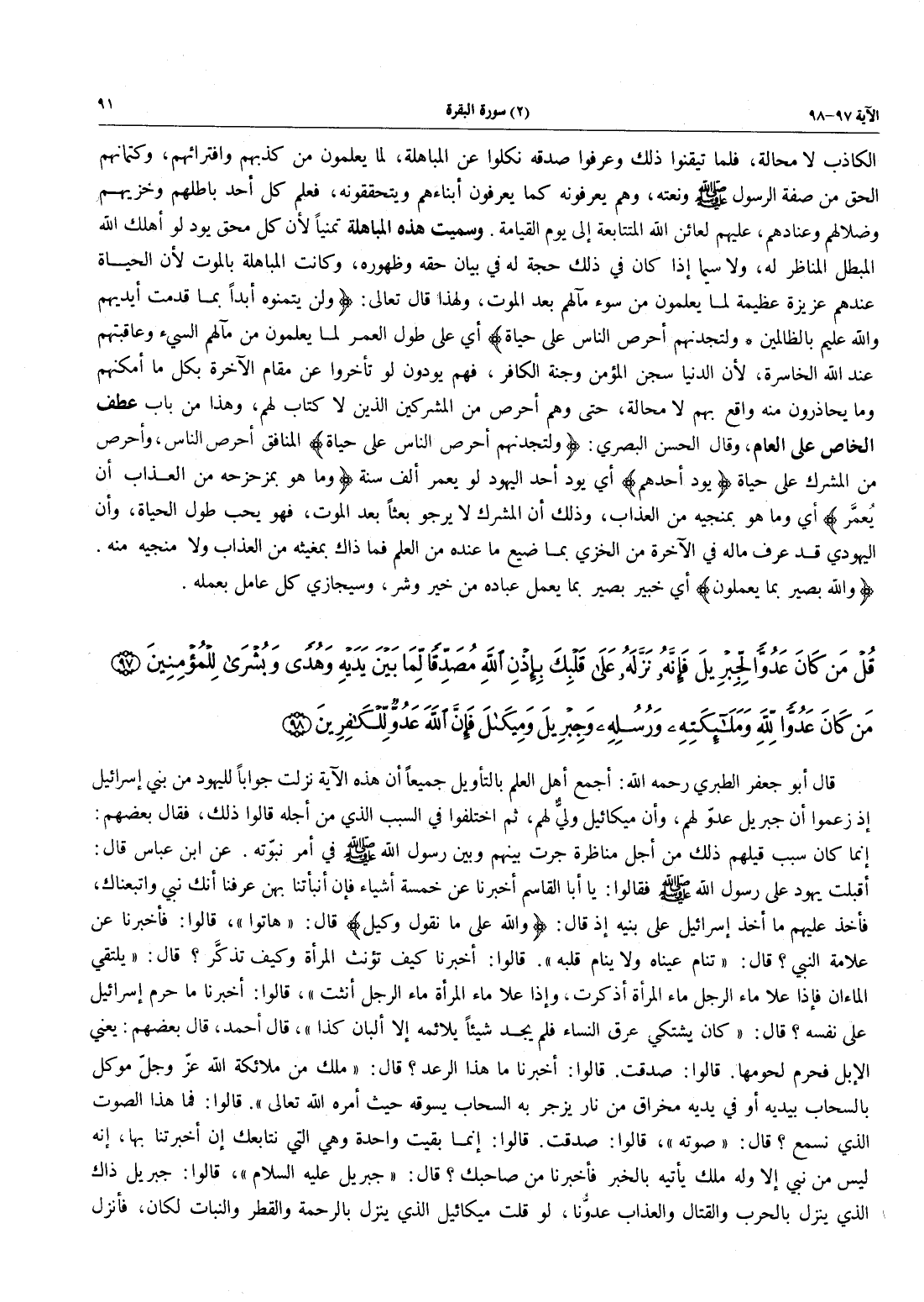 قال أبو جعفر الطَّبَرِيُّ رَحِمَهُ اللَّهُ: أَجْمَعَ أَهْلُ الْعِلْمِ بِالتَّأْوِيلِ جميعاً أَنَّ هَذِهِ الْآيَةَ نَزَلَتْ جَوَابًا لِلْيَهُودِ مِنْ بَنِي إِسْرَائِيلَ إِذْ زَعَمُوا أَنَّ جِبْرِيلَ عَدُوٌّ لَهُمْ، وَأَنْ مِيكَائِيلَ وليٌّ لَهُمْ، ثُمَّ اخْتَلَفُوا فِي السَّبَبِ الذِي مِنْ أَجْلِهِ قَالُوا ذَلِكَ، فَقَالَ بَعْضُهُمْ: إِنَّمَا كَانَ سَبَبُ قِيلِهِمْ ذَلِكَ مِنْ أَجْلِ مُنَاظَرَةٍ جَرَتْ بَيْنَهُمْ وَبَيْنَ رَسُولِ اللَّهِ صَلَّى اللَّهُ عَلَيْهِ وَسَلَّمَ فِي أَمْرِ نبوّته. عَنِ ابْنِ عَبَّاسٍ قَالَ: أَقْبَلَتْ يَهُودُ عَلَى النَّبِيَّ صَلَّى اللَّهُ عَلَيْهِ وَسَلَّمَ فَقَالُوا: يَا أبا القاسم أخبرنا عَنْ خَمْسَةِ أَشْيَاءَ فَإِنْ أَنْبَأْتَنَا بِهِنَّ عَرَفْنَا أَنَّكَ نَبِيٌّ وَاتَّبَعْنَاكَ فَأَخَذَ عَلَيْهِمْ مَا أَخَذَ إسرائيل على بنيه إذا قال: {والله على مَا نَقُولُ وَكِيلٌ} قال: «هاتوا»، قالوا: فأخبرنا عَنْ عَلَامَةِ النَّبِيِّ؟ قَالَ: «تَنَامُ عَيْنَاهُ وَلَا ينام قلبه». قالوا: أخبرنا كيف تؤنث المرأة وَكَيْفَ تذكَّر؟ قَالَ: «يَلْتَقِي الْمَاءَانِ فَإِذَا عَلَا مَاءُ الرَّجُلِ مَاءَ الْمَرْأَةِ أَذْكَرَتْ، وَإِذَا عَلَا مَاءُ الْمَرْأَةِ مَاءَ الرَّجُلِ أَنَّثَتْ»، قَالُوا: أَخْبِرْنَا مَا حَرَّمَ إِسْرَائِيلُ عَلَى نَفْسِهِ؟ قَالَ: «كَانَ يَشْتَكِي عِرْقَ النَّسَّاءِ فَلَمْ يَجِدْ شَيْئًا يُلَائِمُهُ إلا ألبان كذا»، قَالَ أَحْمَدُ، قَالَ بَعْضُهُمْ: يَعْنِي الْإِبِلَ. فَحَرَّمَ لُحُومَهَا. قَالُوا: صَدَقْتَ. قَالُوا: أَخْبِرْنَا مَا هَذَا الرَّعْدُ؟ قَالَ: «مَلَكٌ مِنْ مَلَائِكَةِ اللَّهِ عَزَّ وجل موكل بالسحاب بيديه أو في يديه مِخْرَاقٌ مِنْ نَارٍ يَزْجُرُ بِهِ السَّحَابَ يَسُوقُهُ حيث أمره الله تعالى». قالوا: فما هذا الصوت الذي نسمع؟ قال: «صوته»، قالوا: صدقت. قالوا: إنما بقيت واحدة وهي التي نتابعك إن أخبرتنا بها، إِنَّهُ لَيْسَ مِنْ نَبِيٍّ إِلَّا وَلَهُ مَلَكٌ يَأْتِيهِ بِالْخَبَرِ فَأَخْبِرْنَا مَنْ صَاحِبُكَ؟ قَالَ: «جِبْرِيلُ عَلَيْهِ السَّلَامُ»، قَالُوا: جِبْرِيلُ ذَاكَ الذِي يَنْزِلُ بِالْحَرْبِ وَالْقِتَالِ وَالْعَذَابِ عدوُّنا، لَوْ قُلْتَ مِيكَائِيلُ الذي ينزل بالرحمة والقطر والنبات لكان، فأنزل -[92]- الله تعالى: {قُلْ مَن كَانَ عدو لِّجِبْرِيلَ فَإِنَّهُ نَزَّلَهُ عَلَى قَلْبِكَ بِإِذْنِ اللَّهِ} (رواه أحمد والترمذي والنسائي، وقال الترمذي: حسن غريب) إلى آخر الآية. وفي رواية: أَنَّ يَهُودَ سَأَلُوا النَّبِيَّ صَلَّى اللَّهُ عَلَيْهِ وَسَلَّمَ عَنْ صَاحِبِهِ الذِي يَنْزِلُ عَلَيْهِ بِالْوَحْيِ قال: «جبريل» قالوا: فإنه عدوّ لنا ولا يأتي إلا بالحرب والشدة والقتال فنزلت: {قُلْ مَن كَانَ عَدُوّاً لِّجِبْرِيلَ} الآية.