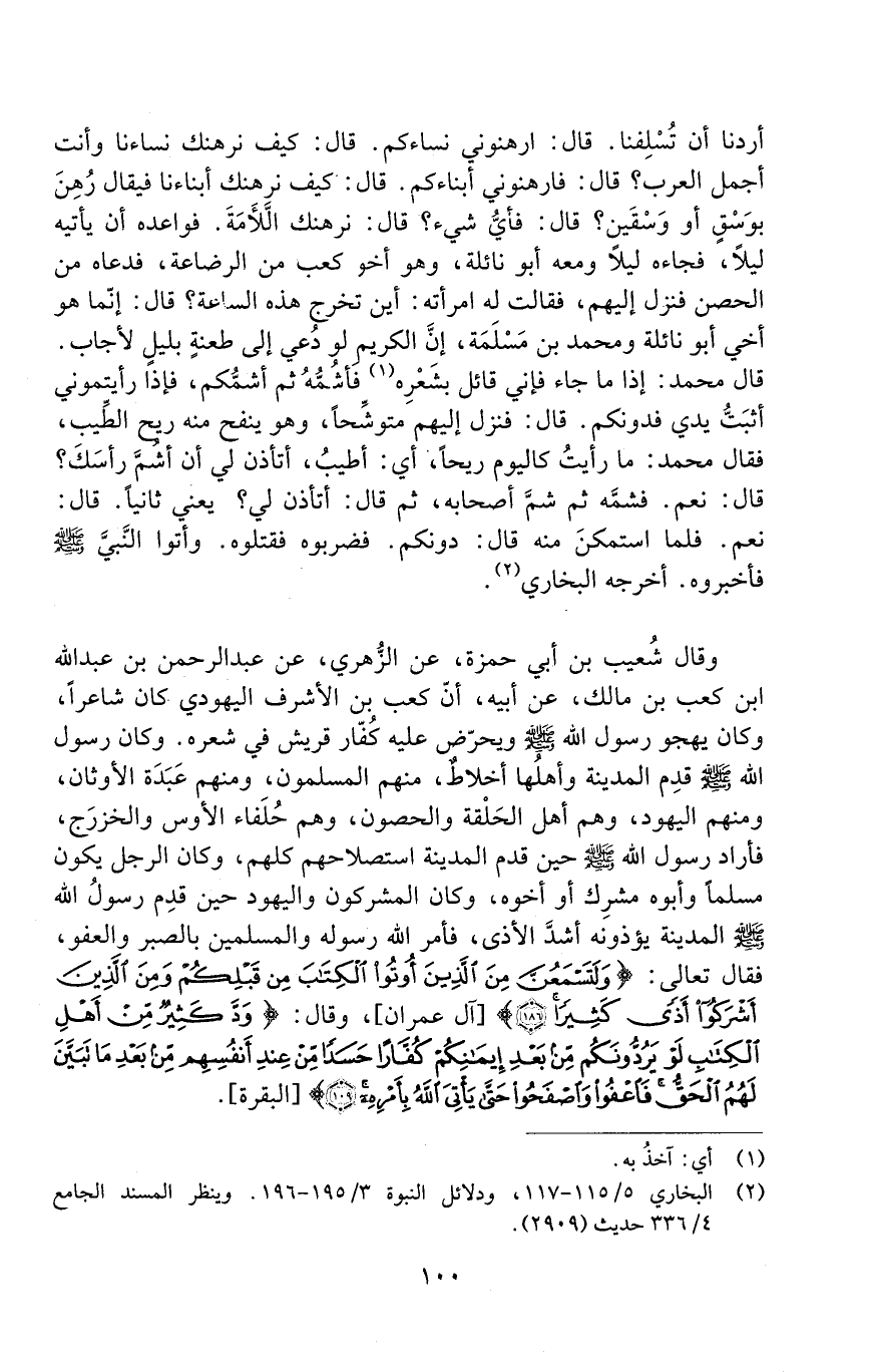 وَقَالَ شُعَيْبُ بْنُ أَبِي حَمْزَةَ، عَنِ الزُّهْرِيِّ، عَنْ عَبْدِ الرَّحْمَنِ بْنِ عَبْدِ اللَّهِ بْنِ كَعْبِ بْنِ مَالِكٍ، عَنْ أَبِيهِ، أَنَّ كَعْبَ بْنَ الْأَشْرَفِ الْيَهُودِيَّ كَانَ شَاعِرًا، وَكَانَ يَهْجُو رَسُولَ اللَّهِ - صَلَّى اللَّهُ عَلَيْهِ وَسَلَّمَ - وَيُحَرِّضُ عَلَيْهِ كُفَّارَ قُرَيْشٍ فِي شِعْرِهِ. وكأن رَسُول اللَّهِ - صَلَّى اللَّهُ عَلَيْهِ وَسَلَّمَ - قَدِمَ الْمَدِينَةَ وَأَهْلُهَا أَخْلَاطٌ، مِنْهُمُ الْمُسْلِمُونَ، وَمِنْهُمْ عَبَدَةُ الْأَوْثَانِ، وَمِنْهُمُ الْيَهُودُ، وَهُمْ أَهْلُ الْحَلَقَةِ وَالْحُصُونِ، وَهُمْ حُلَفَاءُ الْأَوْسِ وَالْخَزْرَجِ، فَأَرَادَ رَسُولُ اللَّهِ - صَلَّى اللَّهُ عَلَيْهِ وَسَلَّمَ - حِينَ قَدِمَ الْمَدِينَةَ اسْتِصْلَاحَهُمْ كُلَّهُمْ، وَكَانَ الرَّجُلُ يَكُونُ مُسْلِمًا وأبوه مشرك أو أخوه وَكَانَ الْمُشْرِكُونَ وَالْيَهُودُ حِينَ قَدِمَ رَسُولُ اللَّهِ - صَلَّى اللَّهُ عَلَيْهِ وَسَلَّمَ - الْمَدِينَةَ يُؤْذُونَهُ أَشَدَّ الْأَذَى، فَأَمَرَ اللَّهُ رَسُولَهُ وَالْمُسْلِمِينَ بِالصَّبْرِ وَالْعَفْوِ، فَقَالَ تَعَالَى: " وَلَتَسْمَعُنَّ مِنَ الَّذِينَ أُوتُوا الْكِتَابَ مِنْ قَبْلِكُمْ وَمِنَ الَّذِينَ أَشْرَكُوا أَذًى كَثِيرًا "، وَقَالَ: " وَدَّ كَثِيرٌ مِنْ أَهْلِ الْكِتَابِ لَوْ يَرُدُّونَكُمْ مِنْ بَعْدِ إِيمَانِكُمْ كُفَّارًا حَسَدًا مِنْ عِنْدِ أَنْفُسِهِمْ مِنْ بَعْدِ مَا تَبَيَّنَ لَهُمُ الْحَقُّ فَاعْفُوا وَاصْفَحُوا حَتَّى يَأْتِيَ اللَّهُ بِأَمْرِهِ "