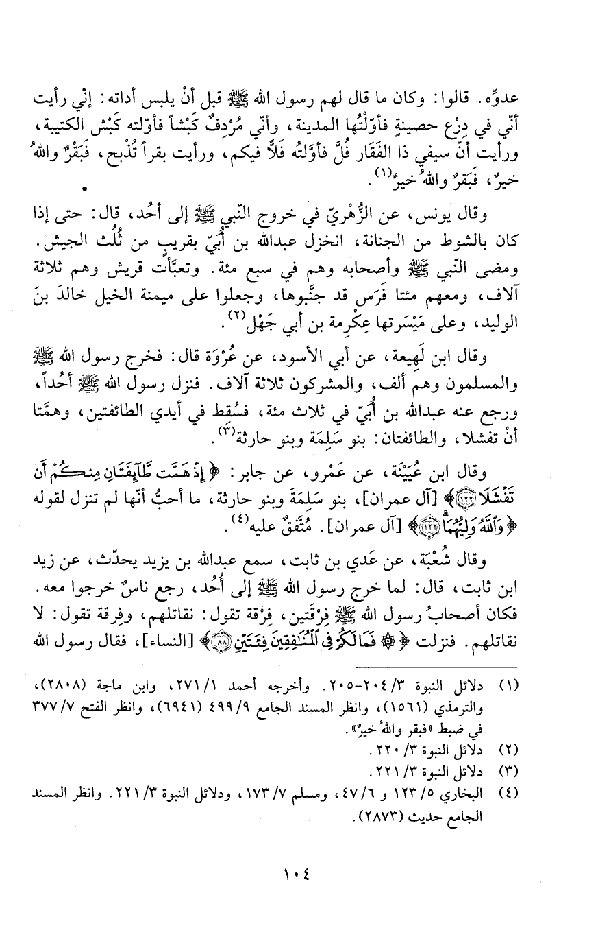 وَقَالَ يُونُسُ، عَنِ الزُّهْرِيِّ فِي خُرُوجِ النَّبِيِّ - صَلَّى اللَّهُ عَلَيْهِ وَسَلَّمَ - إِلَى أُحُدٍ، قَالَ: حَتَّى إِذَا كَانَ بالشوط من الجنانة، انْخَزَلَ عَبْدُ اللَّهِ بْنُ أُبَيٍّ بِقَرِيبٍ مِنْ ثُلُثِ الْجَيْشِ. وَمَضَى النَّبِيُّ - صَلَّى اللَّهُ عَلَيْهِ وَسَلَّمَ - وَأَصْحَابُهُ وَهُمْ فِي سَبْعِمِائَةٍ. وَتَعَبَّأَتْ قُرَيْشٌ وَهُمْ ثَلَاثَةُ آلَافٍ، وَمَعَهُمْ مِائَتَا فَرَسٍ قَدْ جَنَّبُوهَا، وَجَعَلُوا عَلَى مَيْمَنَةِ الْخَيْلِ خَالِدَ بْنَ الْوَلِيدِ، وَعَلَى مَيْسَرَتِهَا عِكْرِمَةَ بْنَ أَبِي جَهْلٍ.