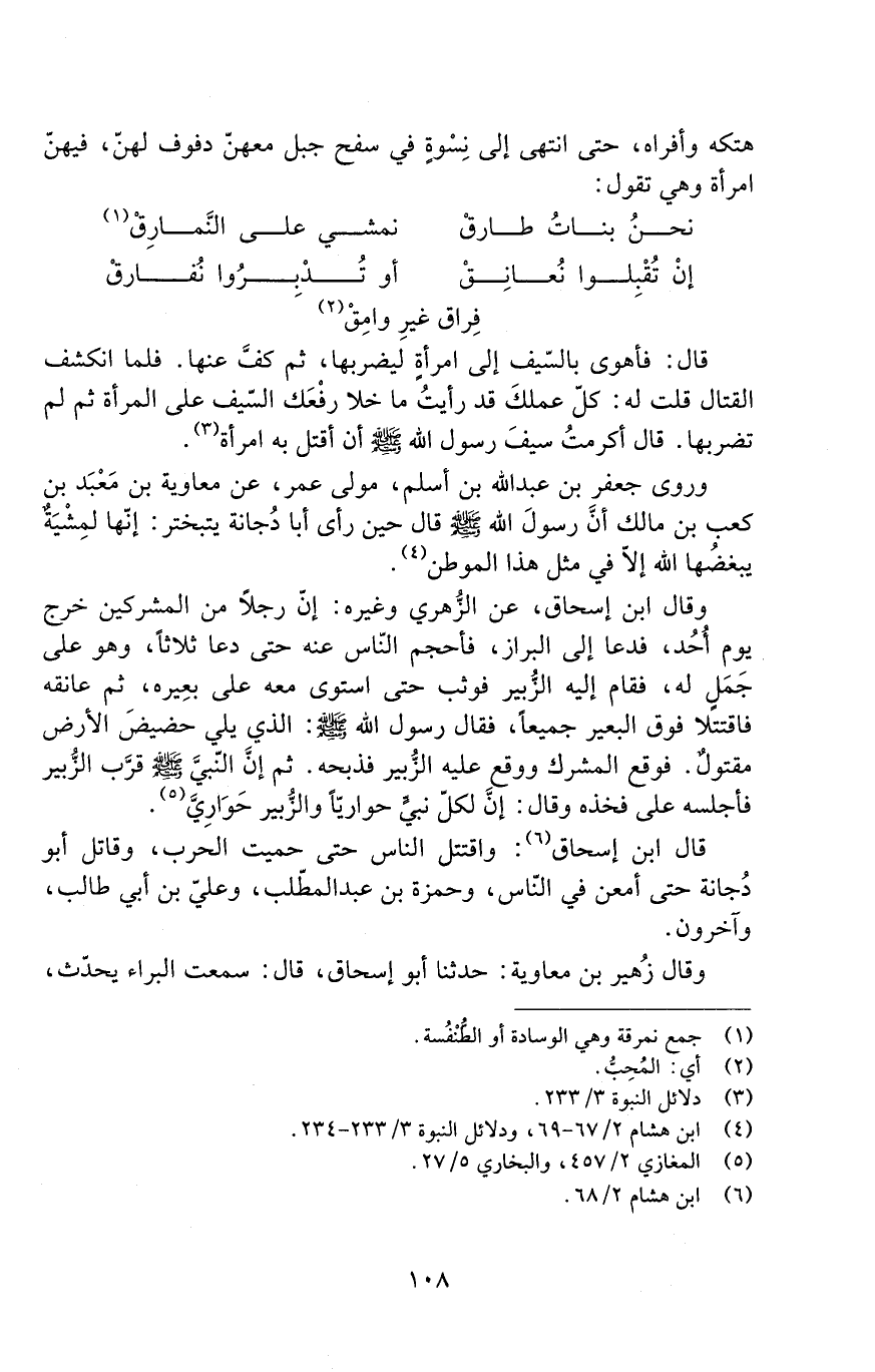 قال: فأهوى بالسيف إِلَى امْرَأَةٍ لِيَضْرِبَهَا، ثُمَّ كَفَّ عَنْهَا. فَلَمَّا انكشف القتال قلت له: كل عملك قد رَأَيْتُ مَا خَلا رَفْعَكَ السَّيْفِ عَلَى الْمَرْأَةِ ثُمَّ لَمْ تَضْرِبْهَا. قَالَ: أَكْرَمْتُ سَيْفَ رَسُولِ اللَّهِ - صَلَّى اللَّهُ عَلَيْهِ وَسَلَّمَ - أَنْ أَقْتُلَ بِهِ امْرَأَةً.
