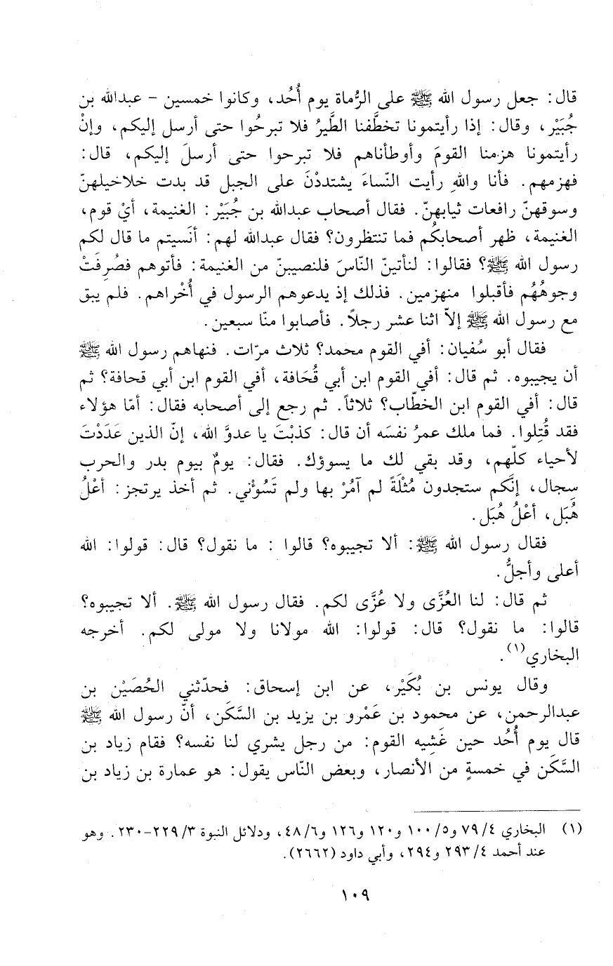 ثُمَّ قَالَ: لَنَا الْعُزَّى وَلَا عُزَّى لَكُمْ. فَقَالَ رَسُولُ اللَّهِ - صَلَّى اللَّهُ عَلَيْهِ وَسَلَّمَ -: " أَلَا تُجِيبُوهُ؟ " قَالُوا: مَا نَقُولُ؟ قَالَ: " قُولُوا: اللَّهُ مَوْلَانَا وَلَا مَوْلَى لَكُمْ ". أَخْرَجَهُ الْبُخَارِيُّ.