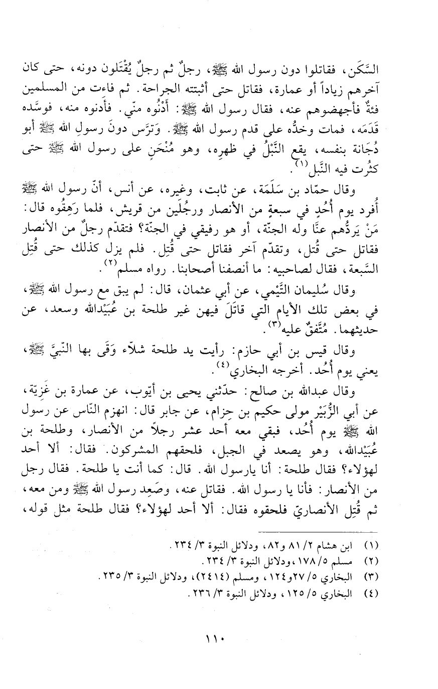 السَّكَنِ، فَقَاتَلُوا دُونَ رَسُولِ اللَّهِ - صَلَّى اللَّهُ عَلَيْهِ وَسَلَّمَ -، رَجُلٌ ثُمَّ رَجُلٌ يُقْتَلُونَ دُونَهُ، حَتَّى كَانَ آخِرُهُمْ زِيَادًا أَوْ عُمَارَةَ، فَقَاتَلَ حَتَّى أَثْبَتَتْهُ الْجِرَاحَةُ. ثُمَّ فَاءَتْ مِنَ الْمُسْلِمِينَ فِئَةٌ فَأَجْهَضُوهُمْ عَنْهُ، فَقَالَ رَسُولُ اللَّهِ - صَلَّى اللَّهُ عَلَيْهِ وَسَلَّمَ -: " أَدْنُوهُ مِنِّي ". فَأَدْنُوهُ مِنْهُ، فَوَسَّدَهُ قَدَمَهُ، فَمَاتَ وَخَدُّهُ عَلَى قَدَمِ رَسُولِ اللَّهِ - صَلَّى اللَّهُ عَلَيْهِ وَسَلَّمَ -.