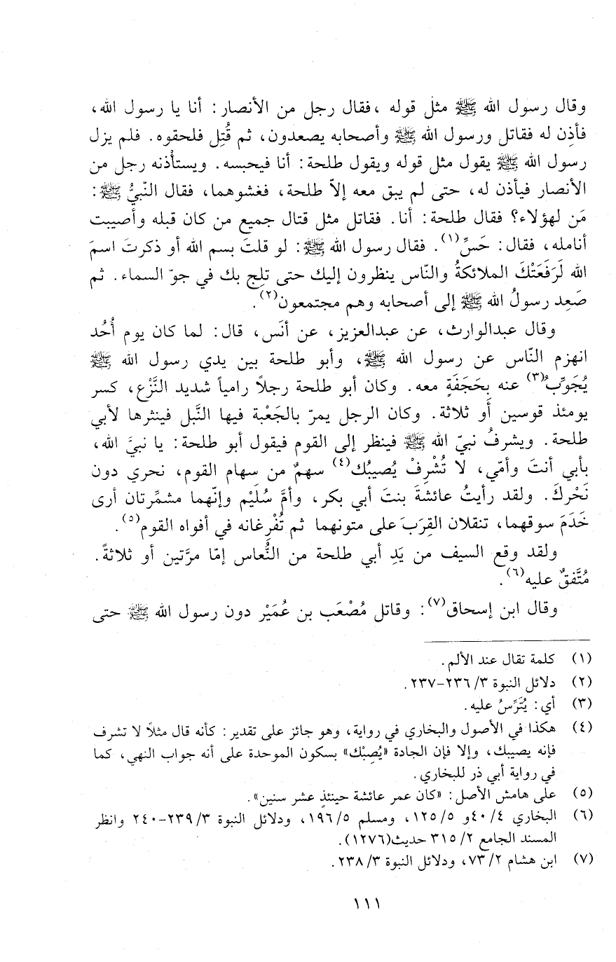 وقال رسول الله - صلى الله عليه وسلم - مِثْلَ قَوْلِهِ، فَقَالَ رَجُلٌ مِنَ الْأَنْصَارِ: أَنَا يَا رَسُولَ اللَّهِ، فَأَذِنَ لَهُ فَقَاتَلَ وَرَسُولُ الله - صلى الله عليه وسلم - وَأَصْحَابُهُ يَصْعَدُونَ، ثُمَّ قُتِلَ فَلَحِقُوهُ. فَلَمْ يَزَلْ رَسُولَ اللَّهِ - صَلَّى اللَّهُ عَلَيْهِ وَسَلَّمَ - يَقُولُ مِثْلَ قَوْلِهِ وَيَقُولُ طَلْحَةُ: أَنَا فَيَحْبِسُهُ. وَيَسْتَأْذِنُهُ رَجُلٌ مِنَ الْأَنْصَارِ فَيَأْذَنُ لَهُ، حَتَّى لَمْ يَبْقَ مَعَهُ إِلَّا طَلْحَةُ، فَغَشَوْهُمَا، فَقَالَ النَّبِيُّ - صَلَّى اللَّهُ عَلَيْهِ وَسَلَّمَ -: " مَنْ لِهَؤُلَاءِ؟ " فَقَالَ طَلْحَةُ: أَنَا. فَقَاتَلَ مِثْلَ قِتَالِ جَمِيعِ مَنْ كان قبله وأصيبت أَنَامِلُهُ، فَقَالَ حَسِّ. فَقَالَ رَسُولُ اللَّهِ - صَلَّى اللَّهُ عَلَيْهِ وَسَلَّمَ -: " لو قلت: باسم اللَّهِ أَوْ ذَكَرْتَ اسْمَ اللَّهِ لَرَفَعَتْكَ الْمَلَائِكَةُ وَالنَّاسُ يَنْظُرُونَ إِلَيْكَ حَتَّى تَلِجَ بِكَ فِي جَوِّ السَّمَاءِ ". ثُمَّ صَعِدَ رَسُولُ اللَّهِ - صَلَّى اللَّهُ عَلَيْهِ وَسَلَّمَ - إِلَى أَصْحَابِهِ وَهُمْ مُجْتَمِعُونَ.