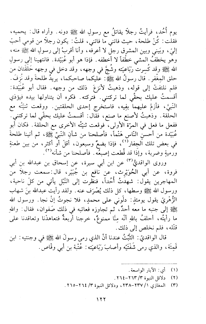 يَوْمَ أُحُدٍ، فَرَأَيْتُ رَجُلًا يُقَاتِلُ مَعَ رَسُولِ اللَّهِ - صَلَّى اللَّهُ عَلَيْهِ وَسَلَّمَ - دُونَهُ. وَأَرَاهُ قَالَ: يَحْمِيهِ، فَقُلْتُ: كُنْ طَلْحَةَ؛ حَيْثُ فَاتَنِي مَا فَاتَنِي، قُلْتُ: يَكُونُ رَجُلًا مِنْ قَوْمِي أحب إلي. وبيني وبين المشرق رجل لَا أَعْرِفُهُ، وَأَنَا أَقْرَبُ إِلَى رَسُولِ اللَّهِ - صَلَّى اللَّهُ عَلَيْهِ وَسَلَّمَ - مِنْهُ، وَهُوَ يَخْطِفُ الْمَشْيَ خَطْفًا لَا أَخْطِفُهُ. فَإِذَا هُوَ أَبُو عُبَيْدَةَ. فَانْتَهَيْنَا إِلَى رَسُولِ اللَّهِ - صَلَّى اللَّهُ عَلَيْهِ وَسَلَّمَ - وَقَدْ كُسِرَتْ رَبَاعِيَتُهُ وَشُجَّ فِي وَجْهِهِ، وَقَدْ دَخَلَ فِي وَجْهِهِ حَلَقَتَانِ مِنْ حَلْقِ الْمِغْفَرِ. قَالَ رَسُولُ اللَّهِ - صَلَّى اللَّهُ عَلَيْهِ وَسَلَّمَ -: عَلَيْكُمَا صَاحِبُكُمَا؛ يُرِيدُ طَلْحَةَ وَقَدْ نَزَفَ. فَلَمْ نَلْتَفِتْ إِلَى قَوْلِهِ، وَذَهَبْتُ لِأَنْزِعَ ذَلِكَ مِنْ وَجْهِهِ. فَقَالَ أَبُو عُبَيْدَةَ: أَقْسَمْتُ عَلَيْكَ بِحَقِّي لَمَا تَرَكْتَنِي. فَتَرَكْتُهُ. فَكَرِهَ أَنْ يَتَنَاوَلَهَا بِيَدِهِ فَيُؤْذِي النَّبِيَّ، فَأَزَمَّ عَلَيْهِمَا بِفِيهِ، فَاسْتَخْرَجَ إِحْدَى الْحَلَقَتَيْنِ. وَوَقَعَتْ ثَنِيَّتُهُ مَعَ الْحَلَقَةِ. وَذَهَبْتُ لِأَصْنَعَ مَا صَنَعَ، فَقَالَ: أَقْسَمْتُ عَلَيْكَ بحقي لما تركتني. ففعل ما فعل فِي الْمَرَّةِ الْأُولَى، فَوَقَعَتْ ثَنِيَّتُهُ الْأُخْرَى مَعَ الْحَلَقَةِ. فَكَانَ أَبُو عُبَيْدَةَ مِنْ أَحْسَنِ النَّاسِ هَتْمًا، فَأَصْلَحْنَا مِنْ شَأْنِ النَّبِيِّ - صَلَّى اللَّهُ عَلَيْهِ وَسَلَّمَ -، ثُمَّ أَتَيْنَا طَلْحَةَ فِي بَعْضِ تِلْكَ الْجِفَارِ، فَإِذَا بِضْعٌ وَسَبْعُونَ، أَقَلُّ أَوْ أَكْثَرُ، مِنْ بَيْنِ طَعْنَةٍ وَرَمْيَةٍ وَضَرْبَةٍ، وَإِذَا قَدْ قُطِعَتْ إِصْبَعُهُ. فَأَصْلَحْنَا مِنْ شَأْنِهِ.