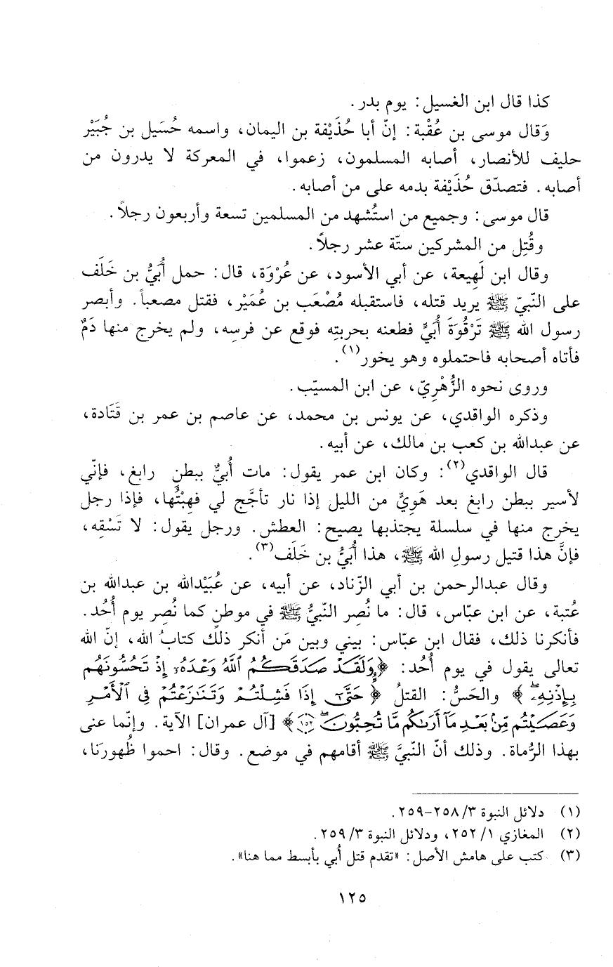 قَالَ الْوَاقِدِيُّ: وَكَانَ ابْنُ عُمَرَ يَقُولُ: مَاتَ أَبِي بِبَطْنِ رَابِغٍ، فَإِنِّي لَأَسِيرُ بِبَطْنِ رَابِغٍ بَعْدَ هَوِيٍّ مِنَ اللَّيْلِ إِذَا نَارٌ تَأَجَّجُ لِي فَهِبْتُهَا، فَإِذَا رَجُلٌ يَخْرُجُ مِنْهَا فِي سِلْسِلَةٍ يَجْتَذِبُهَا يَصِيحُ: الْعَطَشَ. وَرَجُلٌ يَقُولُ: لَا تَسْقِهِ، فَإِنَّ هَذَا قَتِيلُ رَسُولِ اللَّهِ - صَلَّى اللَّهُ عَلَيْهِ وَسَلَّمَ -، هَذَا أُبَيُّ بْنُ خَلَفٍ.
