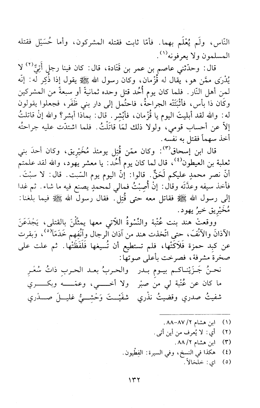 وَوَقَعَتْ هِنْدُ بِنْتُ عُتْبَةَ وَالنِّسْوَةُ اللَّاتِي مَعَهَا يُمَثِّلْنَ بِالْقَتْلَى، يَجْدَعْنَ الْآذَانَ وَالْآنُفَ، حَتَّى اتَّخَذَتْ هِنْدُ مِنْ آذَانِ الرِّجَالِ وَآنُفِهِمْ خَدَمًا، وَبَقَرَتْ عَنْ كَبِدِ حَمْزَةَ فَلَاكَتْهَا، فَلَمْ تستطيع أَنْ تَسِيغَهَا فَلَفَظَتْهَا. ثُمَّ عَلَتْ عَلَى صَخْرَةٍ مُشْرِفَةٍ، فَصَرَخَتْ بِأَعْلَى صَوْتِهَا:
