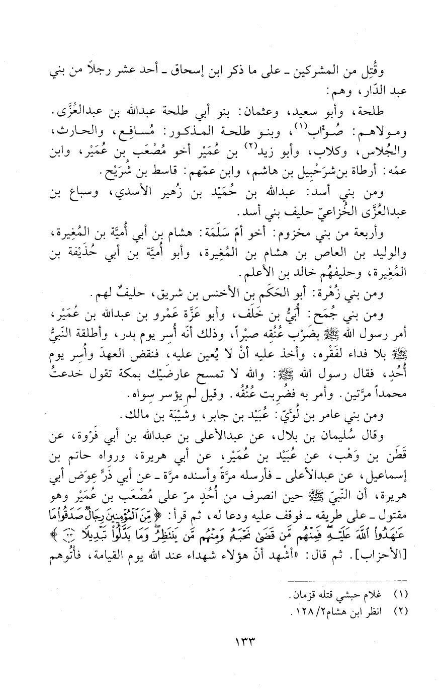 وَقُتِلَ مِنَ الْمُشْرِكِينَ، - عَلَى مَا ذَكَرَ ابْنُ إِسْحَاقَ - أَحَدَ عَشَرَ رَجُلًا مِنْ بَنِي عَبْدِ الدَّارِ، وَهُمْ: طَلْحَةُ، وَأَبُو سَعِيدٍ، وَعُثْمَانُ: بَنُو أَبِي طَلْحَةَ عَبْدِ اللَّهِ بْنِ عَبْدِ الْعُزَّى. وَمَوْلاهُمْ: صُؤَابٌ، وَبَنُو طَلْحَةَ الْمَذْكُورُ: مُسَافِعٌ، وَالْحَارِثُ، والجلاس، وكلاب.