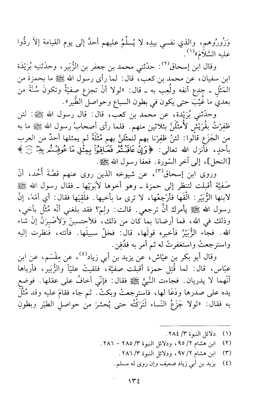 وَرَوَى ابْنُ إِسْحَاقَ عَنْ شُيُوخِهِ الَّذِينَ رَوَى عَنْهُمْ قِصَّةَ أُحُدٍ، أَنَّ صَفِيَّةَ أَقْبَلَتْ لِتَنْظُرَ إِلَى حَمْزَةَ - وَهُوَ أَخُوهَا لِأَبَوَيْهَا - فَقَالَ رَسُولُ اللَّهِ - صَلَّى اللَّهُ عَلَيْهِ وَسَلَّمَ - لِابْنِهَا الزُّبَيْرِ: " الْقَهَا فَأَرْجِعْهَا، لَا تَرَى مَا بِأَخِيهَا ". فَلَقِيَهَا فَقَالَ: أَيْ أُمَّهْ، إِنَّ رَسُولَ اللَّهِ - صَلَّى اللَّهُ عَلَيْهِ وَسَلَّمَ - يأمرك أَنْ تَرْجِعِي. قَالَتْ: وَلِمَ؟ فَقَدْ بَلَغَنِي أَنَّهُ مُثِّلَ بِأَخِي، وَذَلِكَ فِي اللَّهِ، فَمَا أَرْضَانَا بِمَا كَانَ مِنْ ذَلِكَ، فَلْأَحْتَسِبَنَّ وَلَأَصْبِرَنَّ إِنْ شَاءَ اللَّهُ. فَجَاءَ الزُّبَيْرُ فَأَخْبَرَهُ قَوْلَهَا، قَالَ: فَخَلِّ سَبِيلَهَا. فَأَتَتْهُ، فَنَظَرَتْ إِلَيْهِ وَاسْتَرْجَعَتْ وَاسْتَغْفَرَتْ لَهُ ثُمَّ أَمَرَ بِهِ فَدُفِنَ.