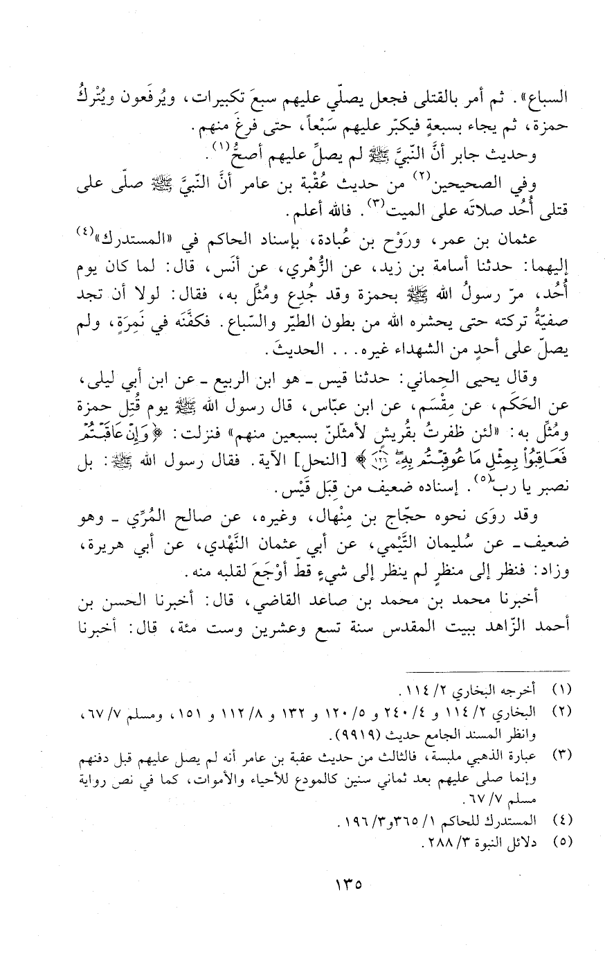 عُثْمَانُ بن عمر، وَرَوْحُ بْنُ عُبَادَةَ، بِإِسْنَادِ الْحَاكِمِ فِي " الْمُسْتَدْرَكِ " إليهما؛ حدثنا أُسَامَةُ بْنُ زَيْدٍ، عَنِ الزُّهْرِيِّ، عَنْ أَنَسٍ قَالَ: لَمَّا كَانَ يَوْمُ أُحُدٍ، مَرَّ رَسُولُ اللَّهِ - صَلَّى اللَّهُ عَلَيْهِ وَسَلَّمَ - بِحَمْزَةَ وَقَدْ جُدِعَ وَمُثِّلَ بِهِ، فَقَالَ: " لَوْلَا أَنْ تَجِدَ صَفِيَّةُ تَرَكْتُهُ حَتَّى يَحْشُرَهُ اللَّهُ مِنْ بُطُونِ الطَّيْرِ وَالسِّبَاعِ ". فَكَفَّنَهُ فِي نَمِرَةٍ. وَلَمْ يُصَلِّ عَلَى أَحَدٍ مِنَ الشُّهَدَاءِ غَيْرَهُ. . . الْحَدِيثَ.