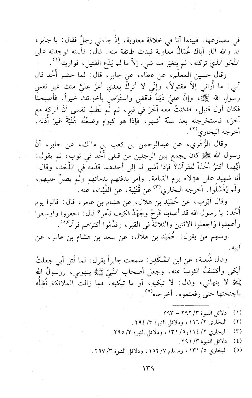 فِي مَصَارِعِهَا. فَبَيْنَمَا أَنَا فِي خِلَافَةِ مُعَاوِيَةَ، إِذْ جَاءَنِي رَجُلٌ فَقَالَ: يَا جَابِرُ، قَدْ والله أثار أباك عمال معاوية فبدت طَائِفَةٌ مِنْهُ. قَالَ: فَأَتَيْتُهُ فَوَجَدْتُهُ عَلَى النَّحْوِ الَّذِي تَرَكْتُهُ، لَمْ يَتَغَيَّرْ مِنْهُ شَيْءٌ إِلَّا ما لم يدع القتيل فَوَارَيْتُهُ.