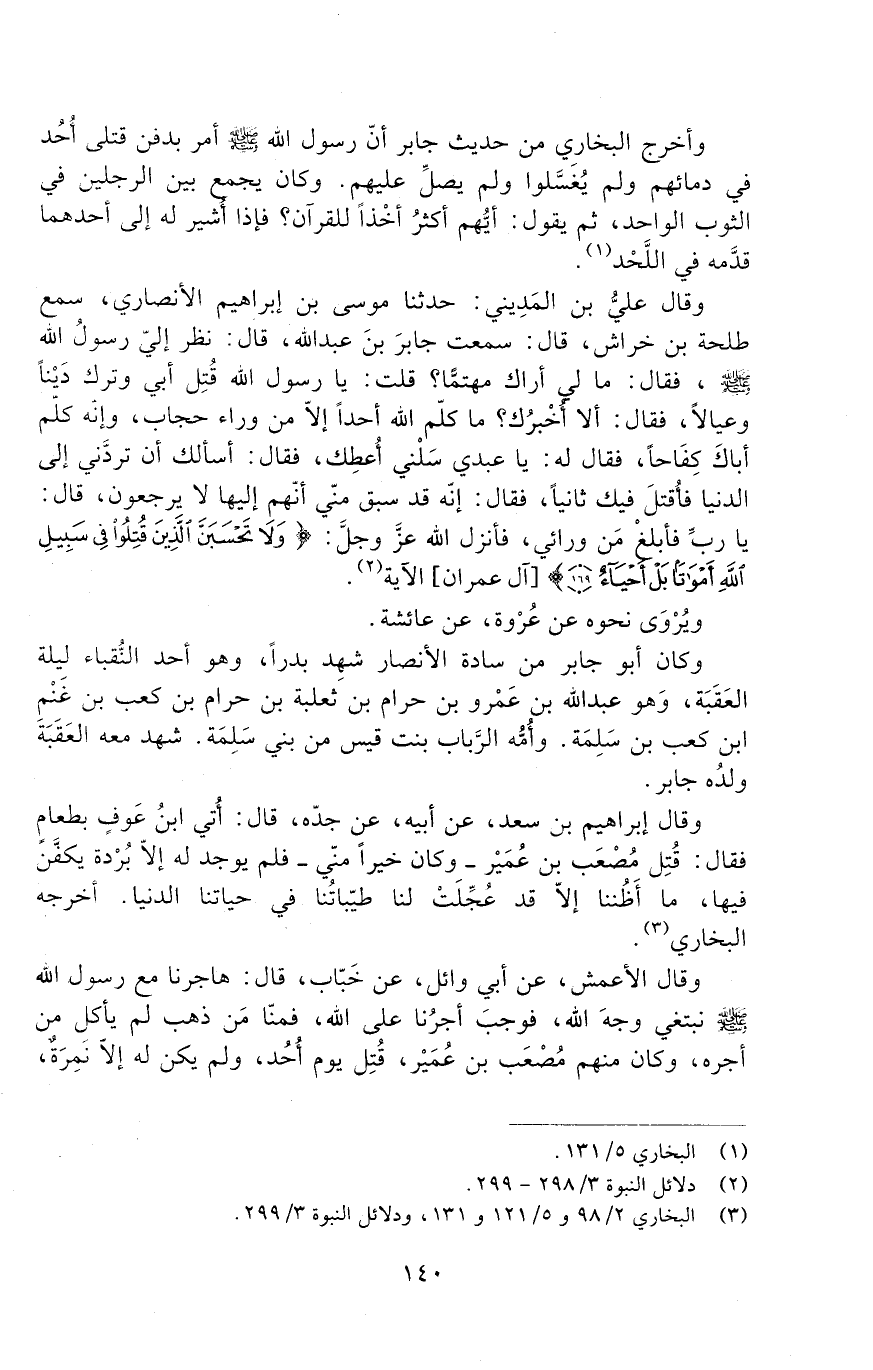 وقال علي بن المديني: حدثنا مُوسَى بْنُ إِبْرَاهِيمَ الْأَنْصَارِيُّ، سَمِعَ طَلْحَةَ بْنَ خِرَاشٍ، قَالَ: سَمِعْتُ جَابِرَ بْنَ عَبْدِ اللَّهِ قَالَ: نَظَرَ إِلَيَّ رَسُولُ اللَّهِ - صَلَّى اللَّهُ عَلَيْهِ وَسَلَّمَ - فَقَالَ: ما لي أَرَاكَ مُهْتَمًّا؟ قُلْتُ: يَا رَسُولَ اللَّهِ قُتِلَ أَبِي وَتَرَكَ دَيْنًا وَعِيَالًا. فَقَالَ: أَلَا أُخْبِرُكَ؟ مَا كَلَّمَ اللَّهُ أَحَدًا إِلَّا مِنْ وَرَاءِ حِجَابٍ، وَإِنَّهُ كَلَّمَ أَبَاكَ كِفَاحًا، فَقَالَ لَهُ: يَا عَبْدِي سَلْنِي أُعْطِكَ. فَقَالَ: أَسْأَلُكَ أَنْ تَرُدَّنِي إِلَى الدُّنْيَا فَأُقْتَلَ فِيكَ ثَانِيًا. فَقَالَ: إنه قد سَبَقَ مِنِّي أَنَّهُمْ إِلَيْهَا لَا يَرْجِعُونَ. قَالَ: يَا رَبِّ فَأَبْلِغْ مَنْ وَرَائِي، فَأَنْزَلَ اللَّهُ عَزَّ وَجَلَّ: " وَلا تَحْسَبَنَّ الَّذِينَ قُتِلُوا فِي سبيل الله أمواتا بل أحياء " الآية.