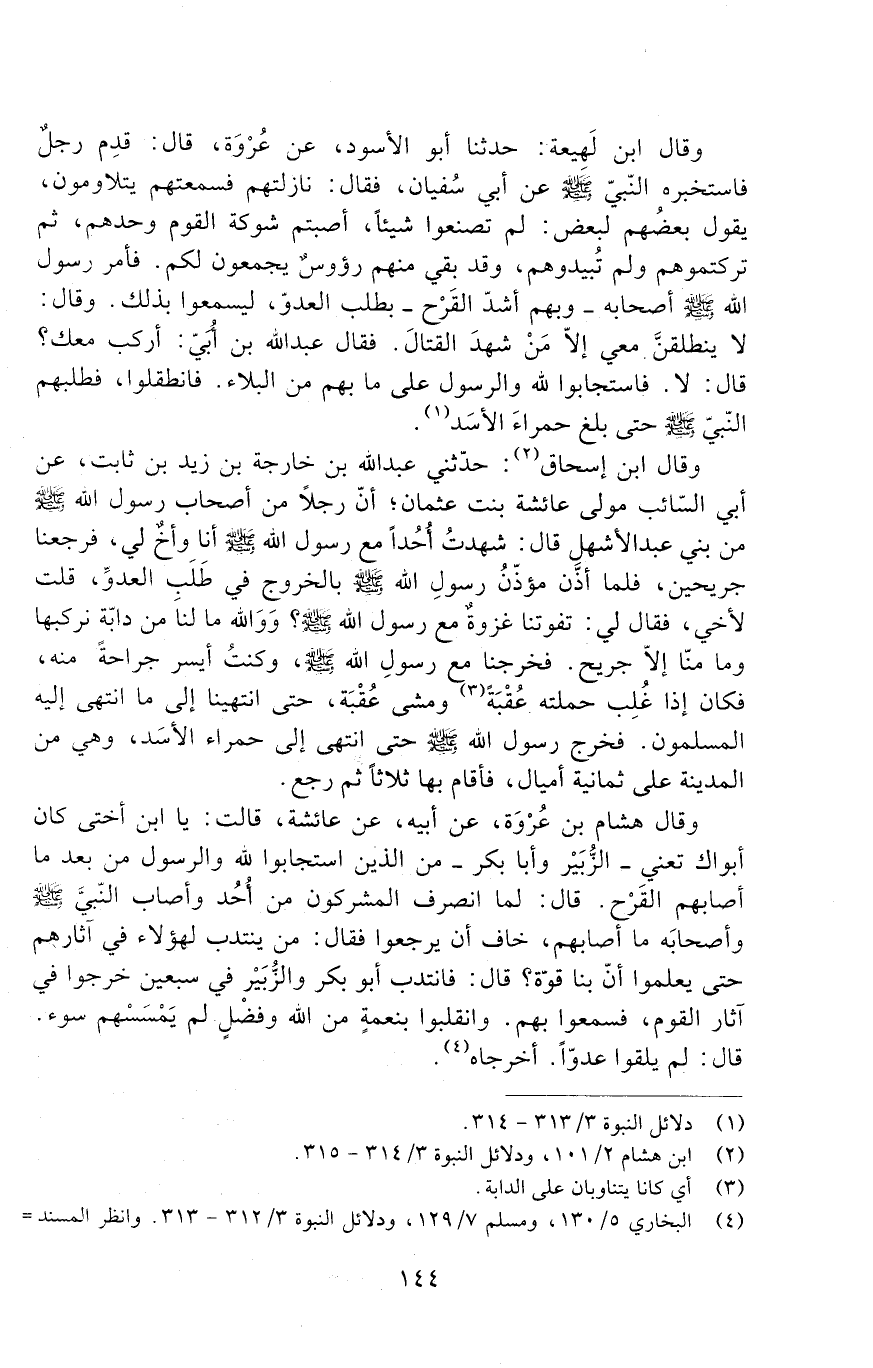 وقال ابن لهيعة: حدثنا أبو الأسود، عَنْ عُرْوَة قَالَ: قدِم رجلٌ فاستخبره النّبيّ صَلَّى اللَّهُ عَلَيْهِ وَسَلَّمَ عَنْ أبي سُفيان. فقال: نازلتهم فسمعتهم يتلاومون، يَقْولُ بعضُهم لبعض: لم تصنعوا شيئًا، أصبتم شوكة القوم وحدهم، ثُمَّ تركتموهم ولم تُبيدوهم، وقد بقي منهم رؤوسٌ يجمعون لكم. فأمر رَسُول اللَّهِ صَلَّى اللَّهُ عَلَيْهِ وَسَلَّمَ أصحابه - وبهم أشد القرح - بطلب العدو، ليسمعوا بذلك. وقال: لا ينطلقنّ معي إلّا من شهد القتال. فقال عبد الله بن أُبَيّ: أركب معك؟ قَالَ: لا. فاستجابوا لله والرسول عَلَى ما بهم من البلاء. فانطلقوا، فطلبهم النّبيّ صَلَّى اللَّهُ عَلَيْهِ وَسَلَّمَ حتى بلغ حمراءَ الأسَد.