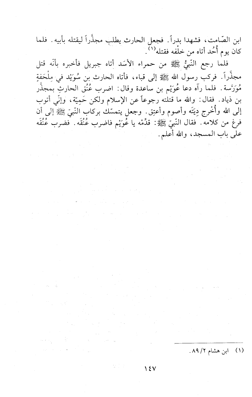 فَلَمَّا رَجَعَ النَّبِيُّ صَلَّى اللَّهُ عَلَيْهِ وَسَلَّمَ من حمراء الأسد أتاه جبريل فأخبره بأنه قتل مجذرا. فَرَكِبَ رَسُولُ اللَّهِ صَلَّى اللَّهُ عَلَيْهِ وَسَلَّمَ إِلَى قُبَاءَ، فَأَتَاهُ الْحَارِثُ بْنُ سُوَيْدٍ فِي مِلْحَفَةٍ مُوَرَّسَةٍ. فَلَمَّا رَآهُ دَعَا عُوَيْمَ بْنَ ساعدة وقال: اضرب عنق الحارث بمجذر بن ذياد. فَقَالَ: وَاللَّهِ مَا قَتَلْتُهُ رُجُوعًا عَنِ الإِسْلامِ وَلَكِنْ حَمِيَةٌ، وَإِنِّي أَتُوبُ إِلَى اللَّهِ وَأُخْرِجُ دِيَتَهُ وَأَصُومُ وَأَعْتِقُ. وَجَعَلَ يَتَمَسَّكُ بِرِكَابِ النَّبِيِّ صَلَّى اللَّهُ عَلَيْهِ وَسَلَّمَ إِلَى أَنْ فَرَغَ مِنْ كَلامِهِ. فَقَالَ النَّبِيُّ صَلَّى اللَّهُ عَلَيْهِ وَسَلَّمَ: قَدِّمْهُ يَا عُوَيْمُ فَاضْرِبْ عُنُقَهُ. فَضَرَبَ عنقه على باب المسجد، والله أعلم.